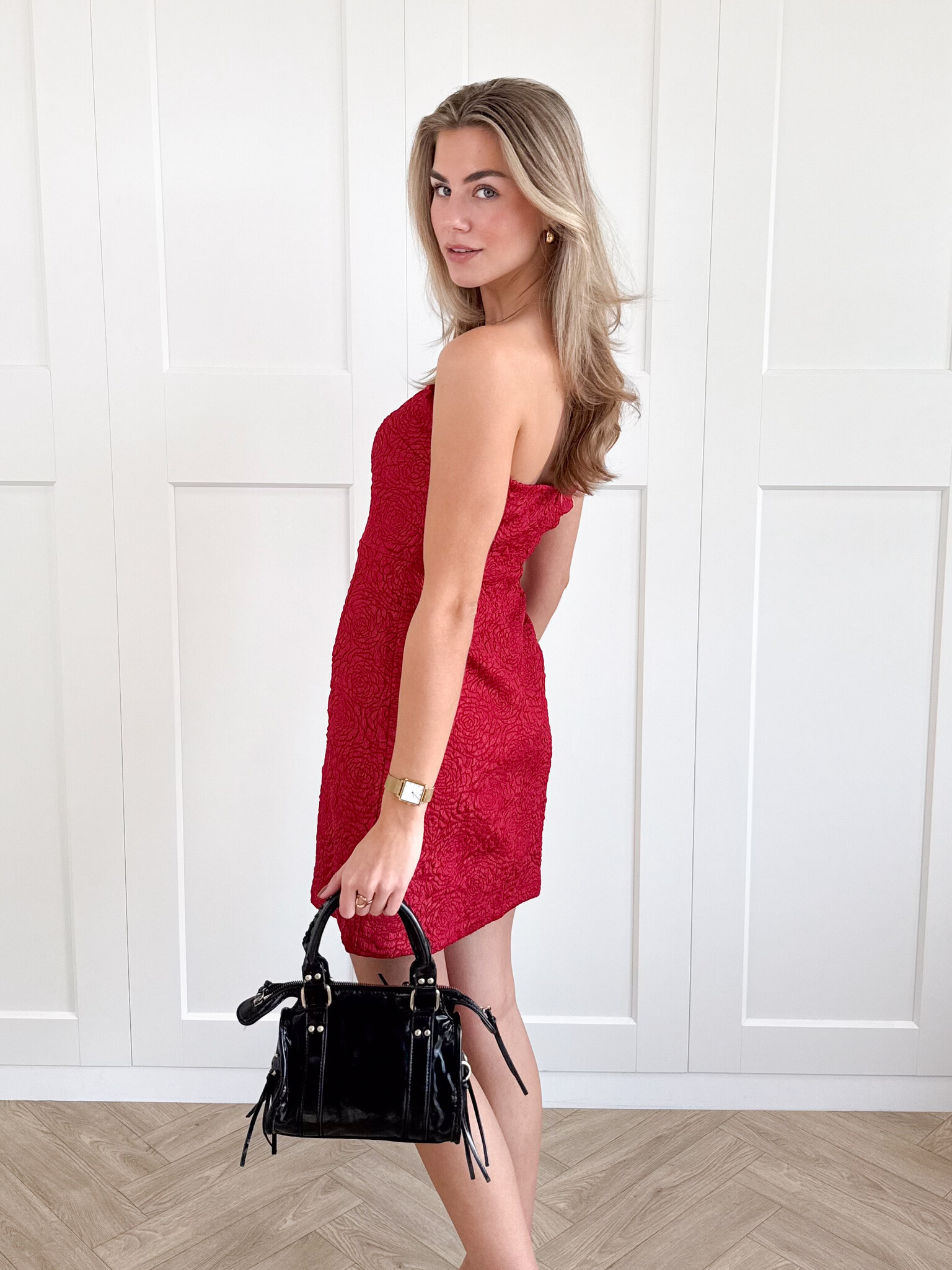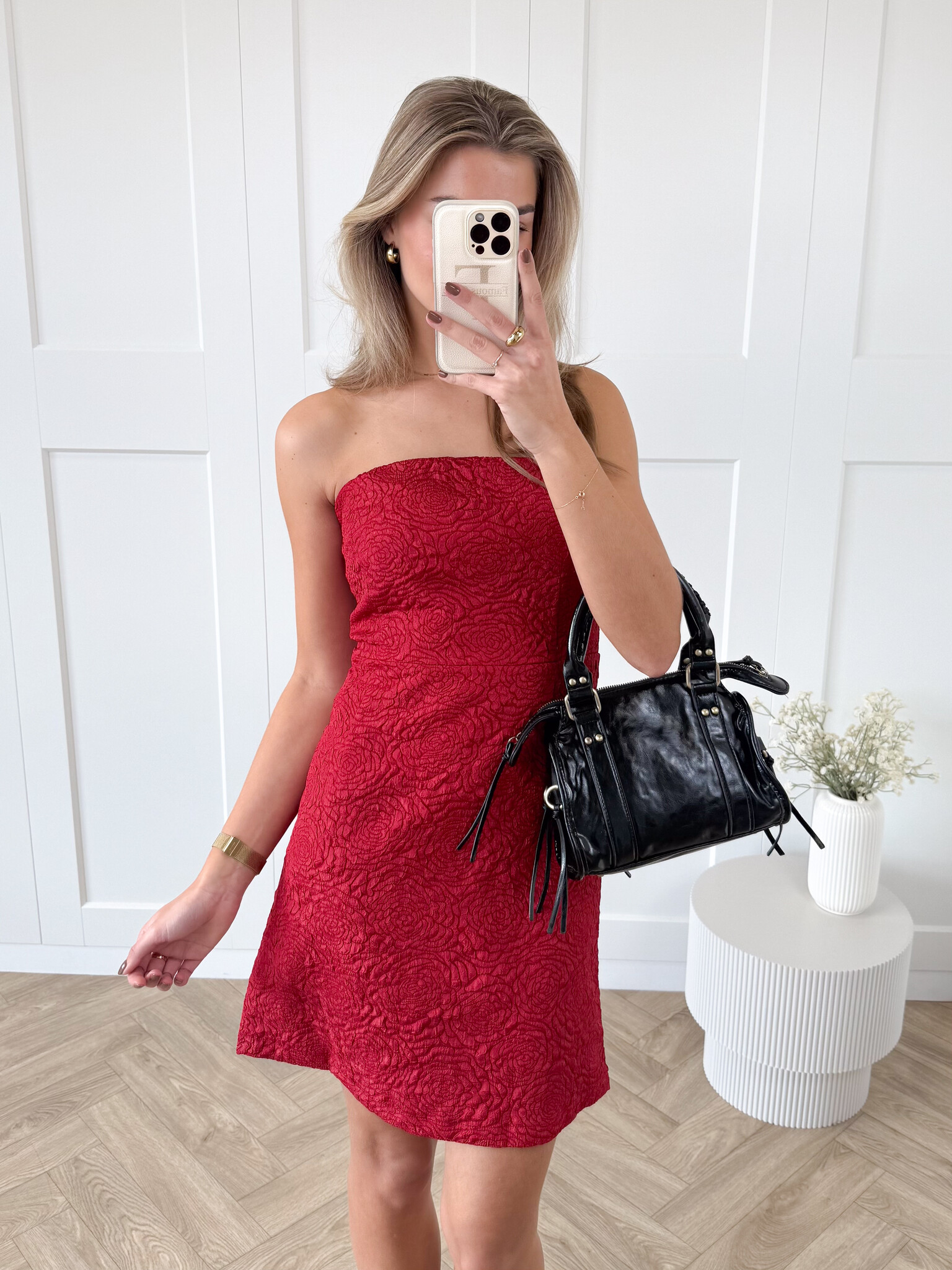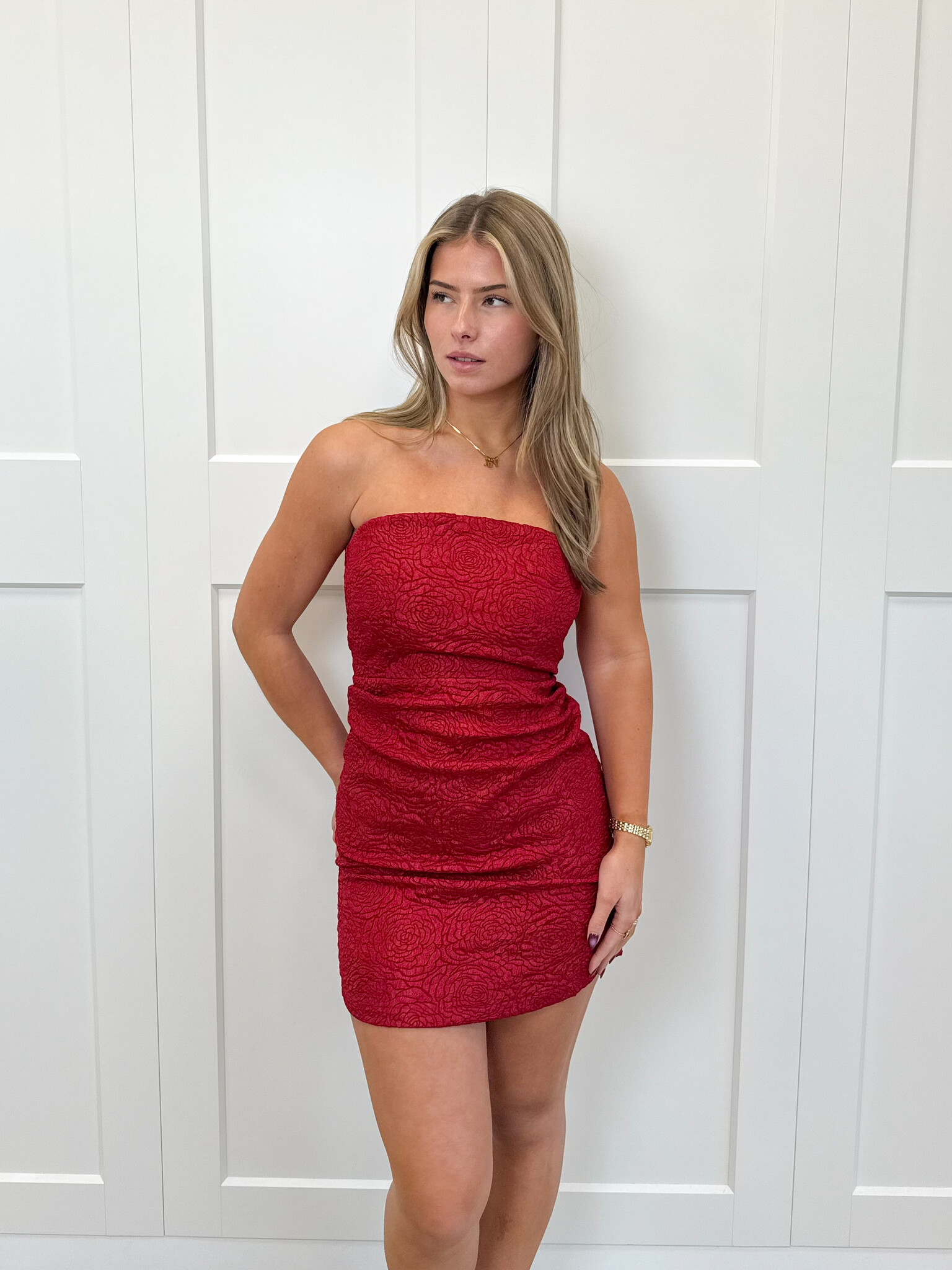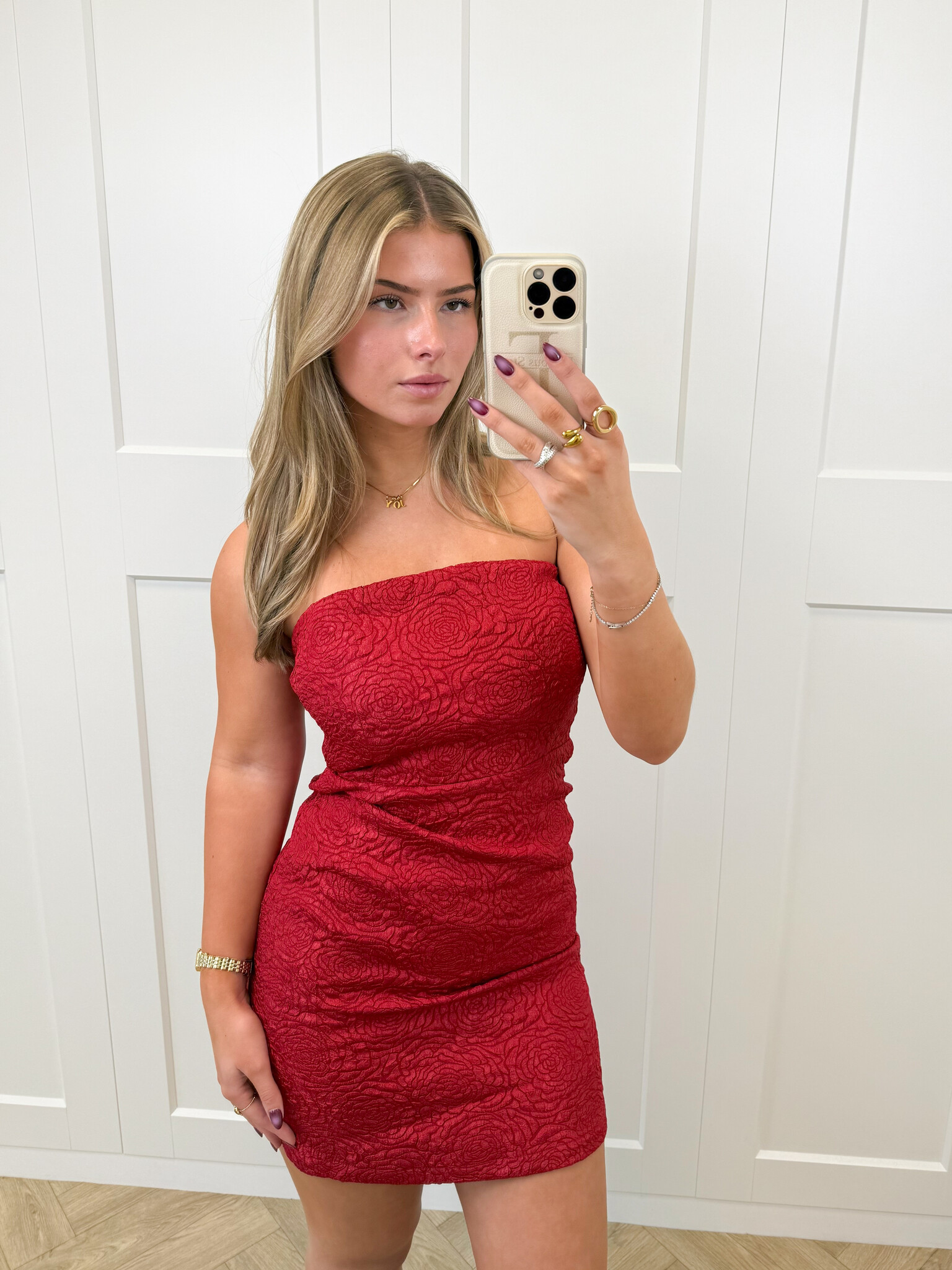 Laat jezelf stralen in deze prachtige strapless jurk met een betoverende bloemenprint. De dieprode kleur geeft direct een feestelijke vibe en maakt deze jurk ideaal voor de feestdagen. De strapless pasvorm zorgt voor een vrouwelijke, verfijnde uitstraling, terwijl de soepele stof mooi meebeweegt met elke stap die je zet. Combineer haar met hakken en sieraden voor een elegante party look, of draag met een zacht vestje voor een romantische touch. Deze jurk is gemaakt voor girls die houden van stijl, comfort en een vleugje glamour. Met deze look ben je klaar om alle aandacht te trekken, van diner tot dansvloer!