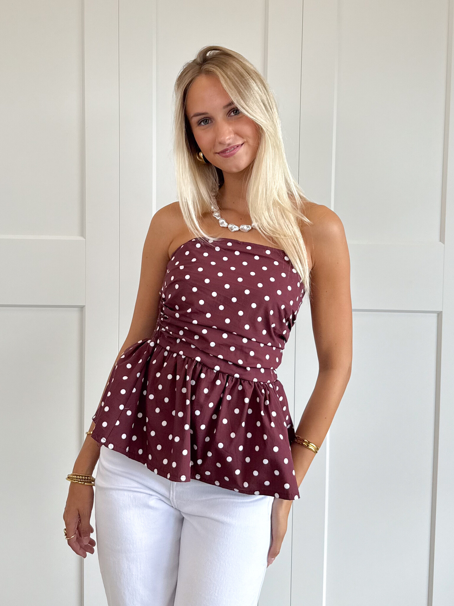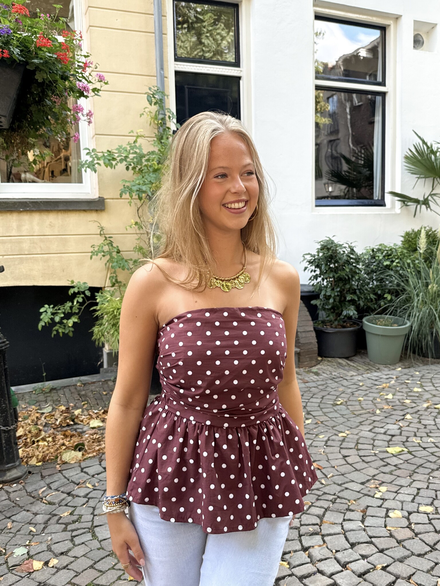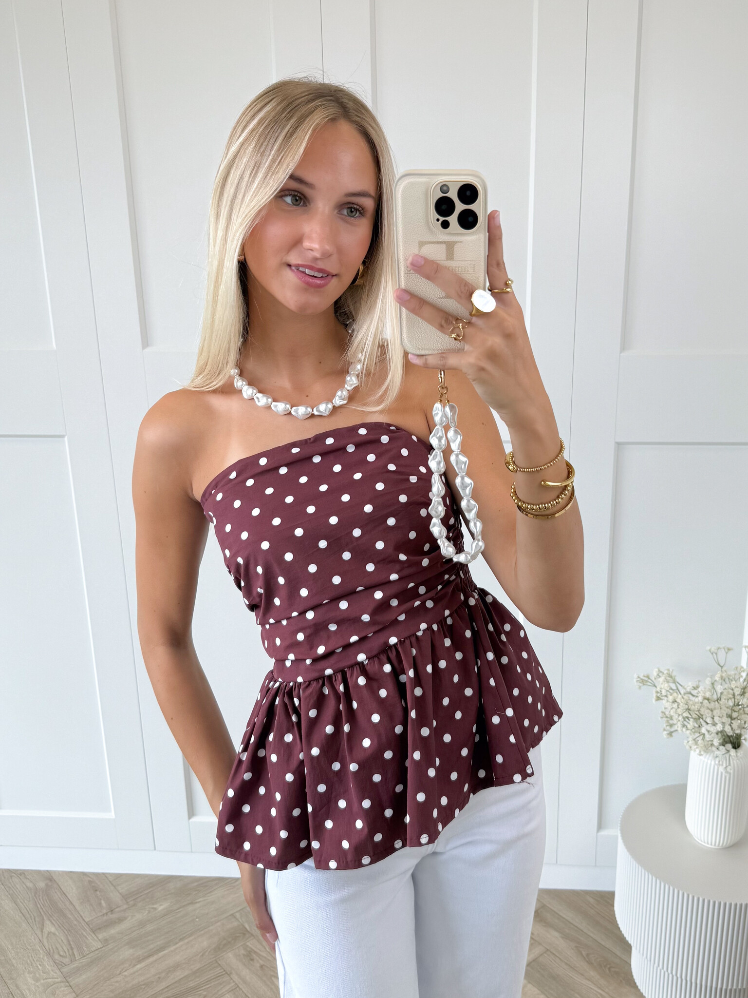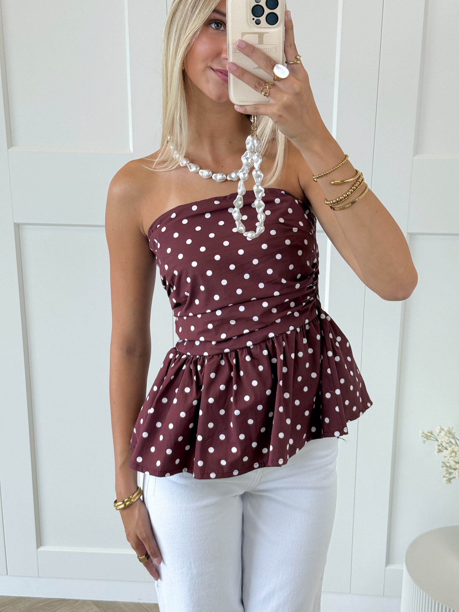 Deze strapless polka dot top is dé perfecte combinatie van speels, vrouwelijk en trendy. Het strapless model laat je schouders mooi uitkomen en geeft je outfit een flirty twist, terwijl de peplum onderkant zorgt voor een super flatterend effect. Het peplum design accentueert je taille en creëert een elegant en vrouwelijk silhouet, zonder dat het ongemakkelijk aanvoelt.