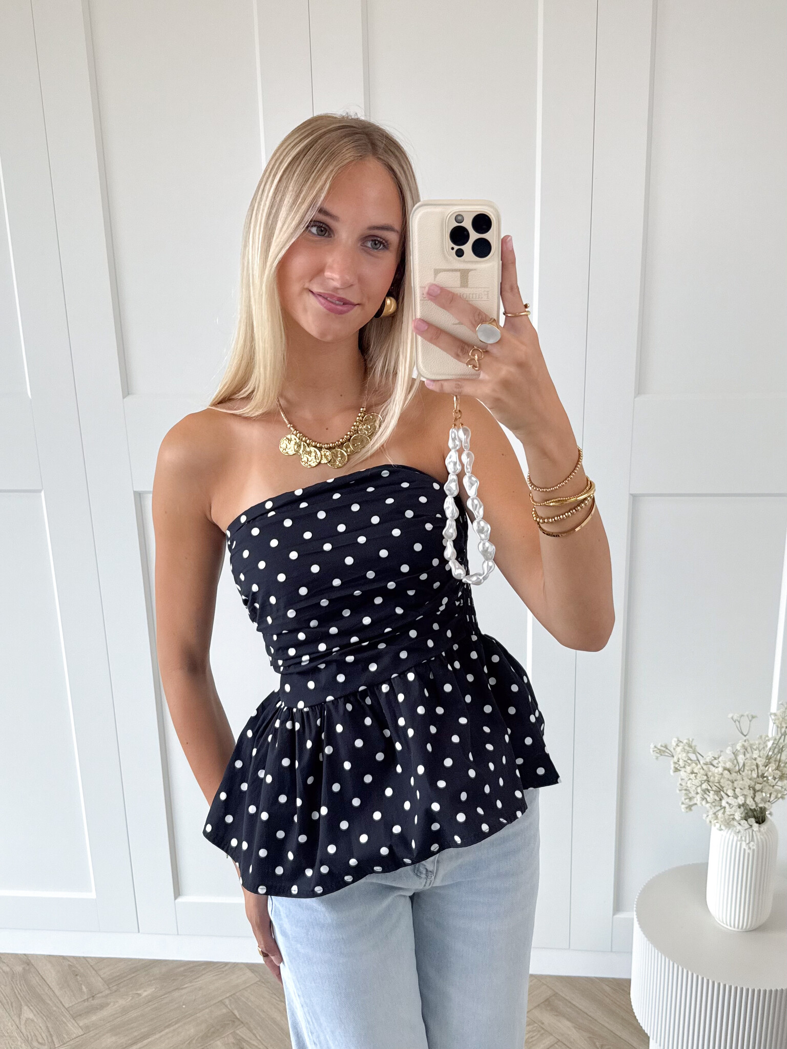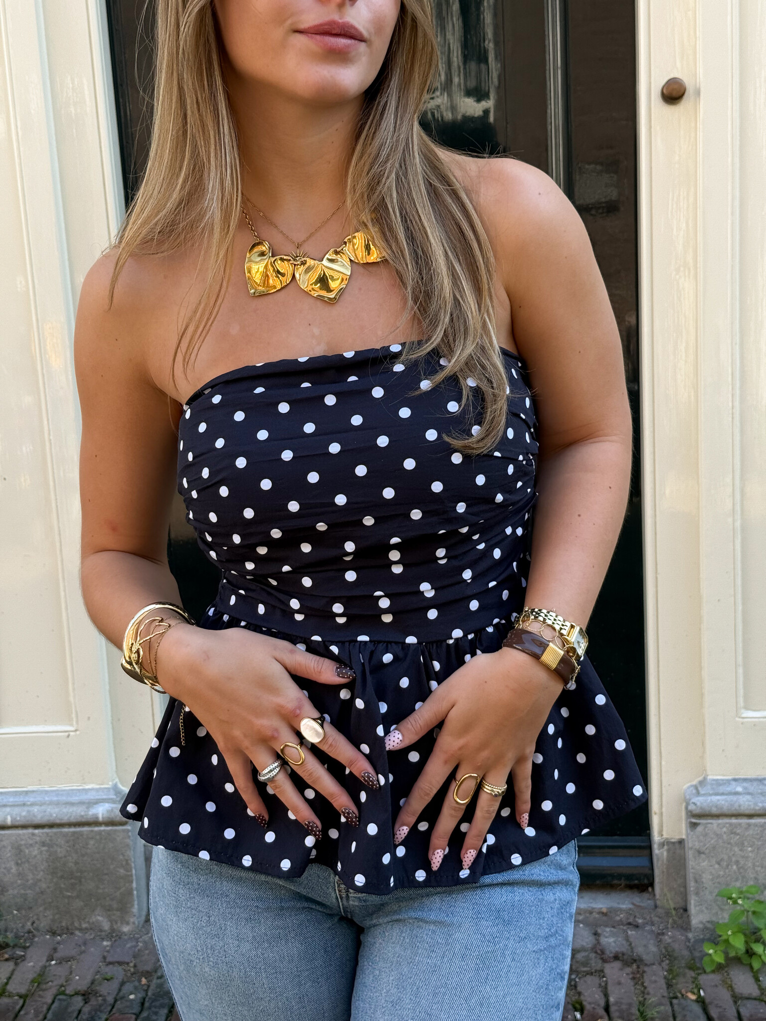 Deze strapless polka dot top is dé perfecte combinatie van speels, vrouwelijk en trendy. Het strapless model laat je schouders mooi uitkomen en geeft je outfit een flirty twist, terwijl de peplum onderkant zorgt voor een super flatterend effect. Het peplum design accentueert je taille en creëert een elegant en vrouwelijk silhouet, zonder dat het ongemakkelijk aanvoelt.