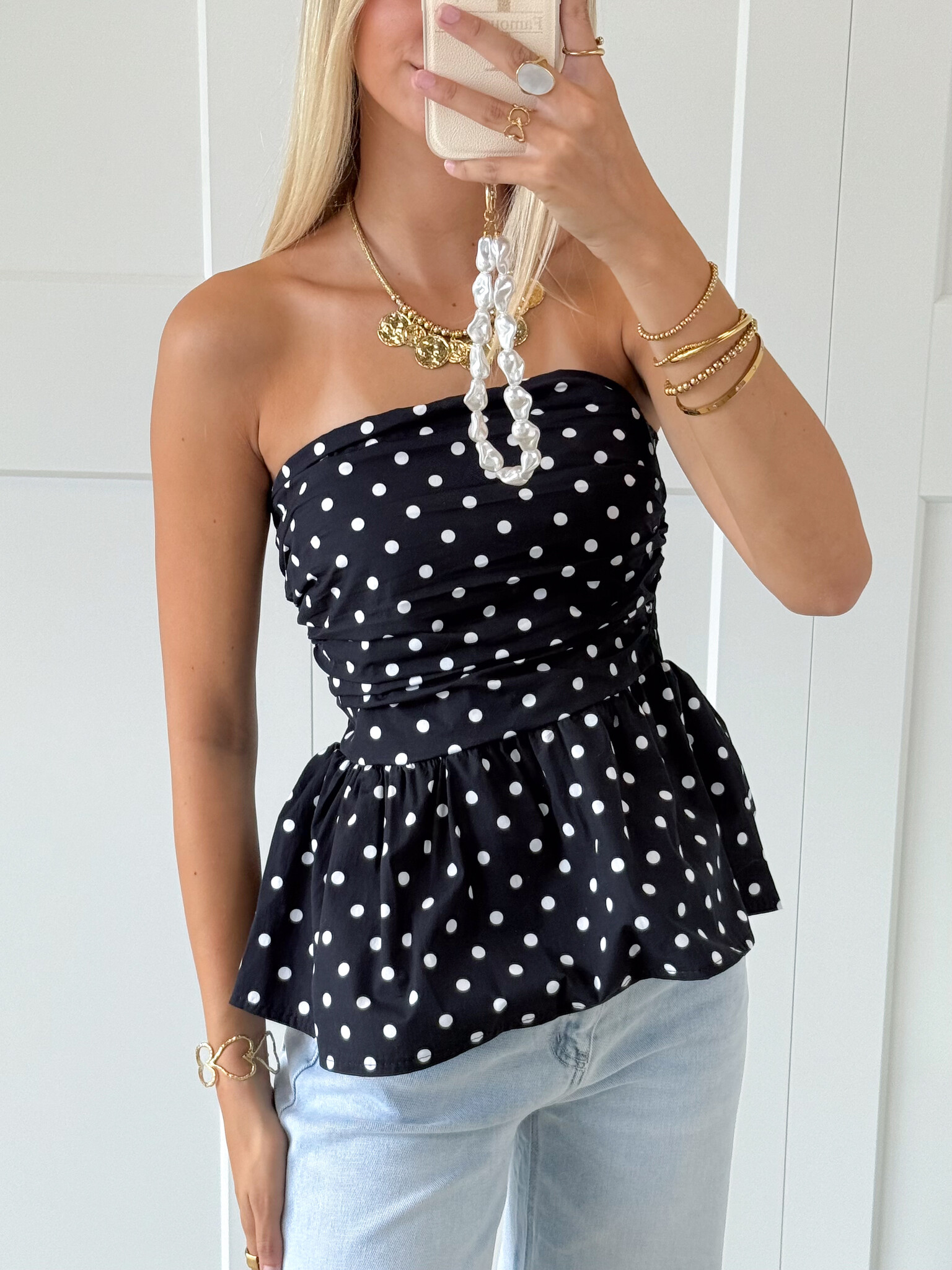 Strapless polka dot top met peplum model. Vrouwelijk, speels en super flatterend. Perfect voor een feestje of een avondje uit, makkelijk te combineren met een jeans, rok of pantalon.