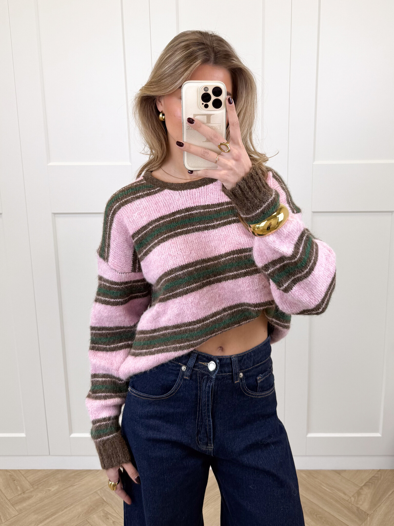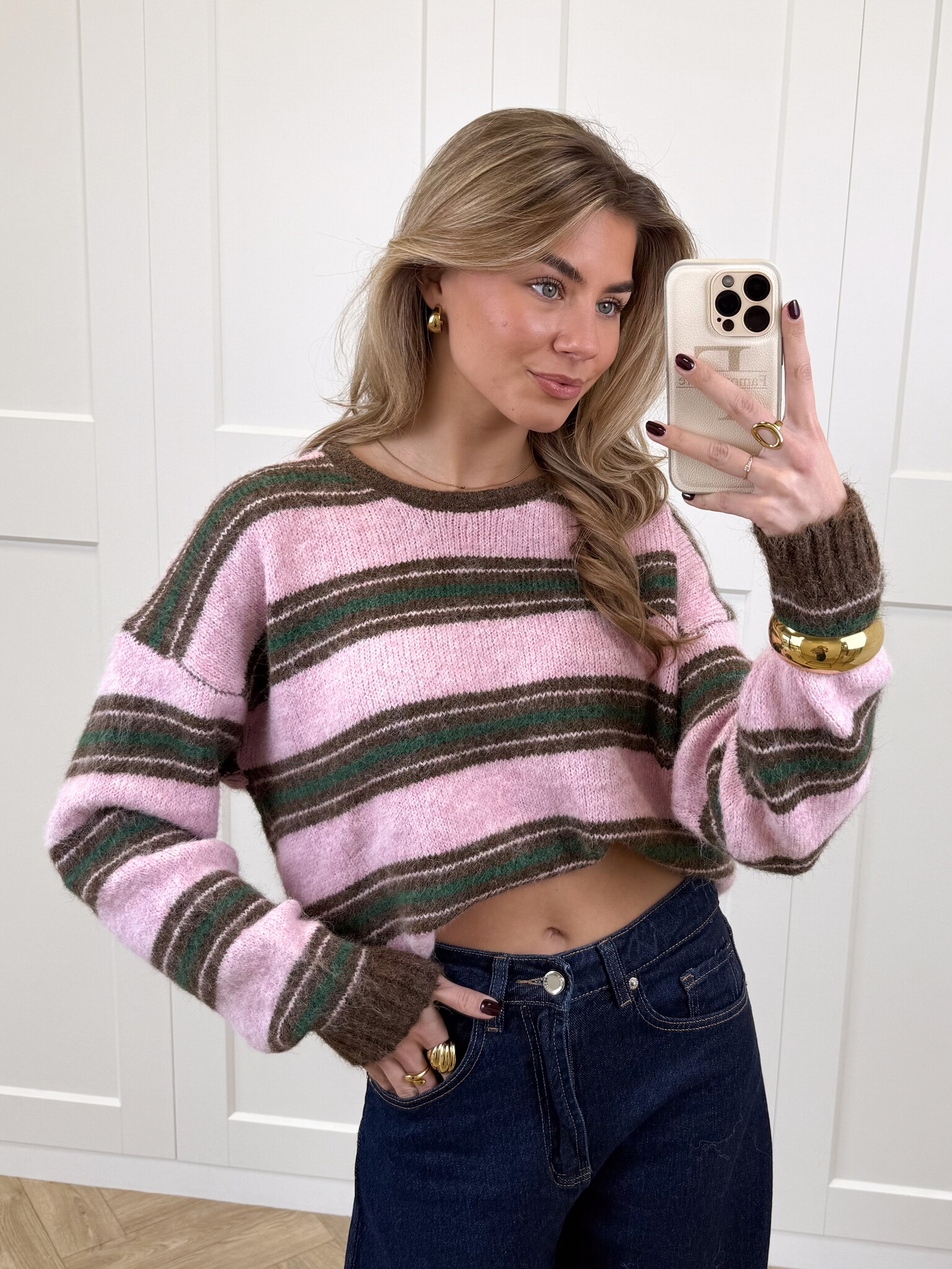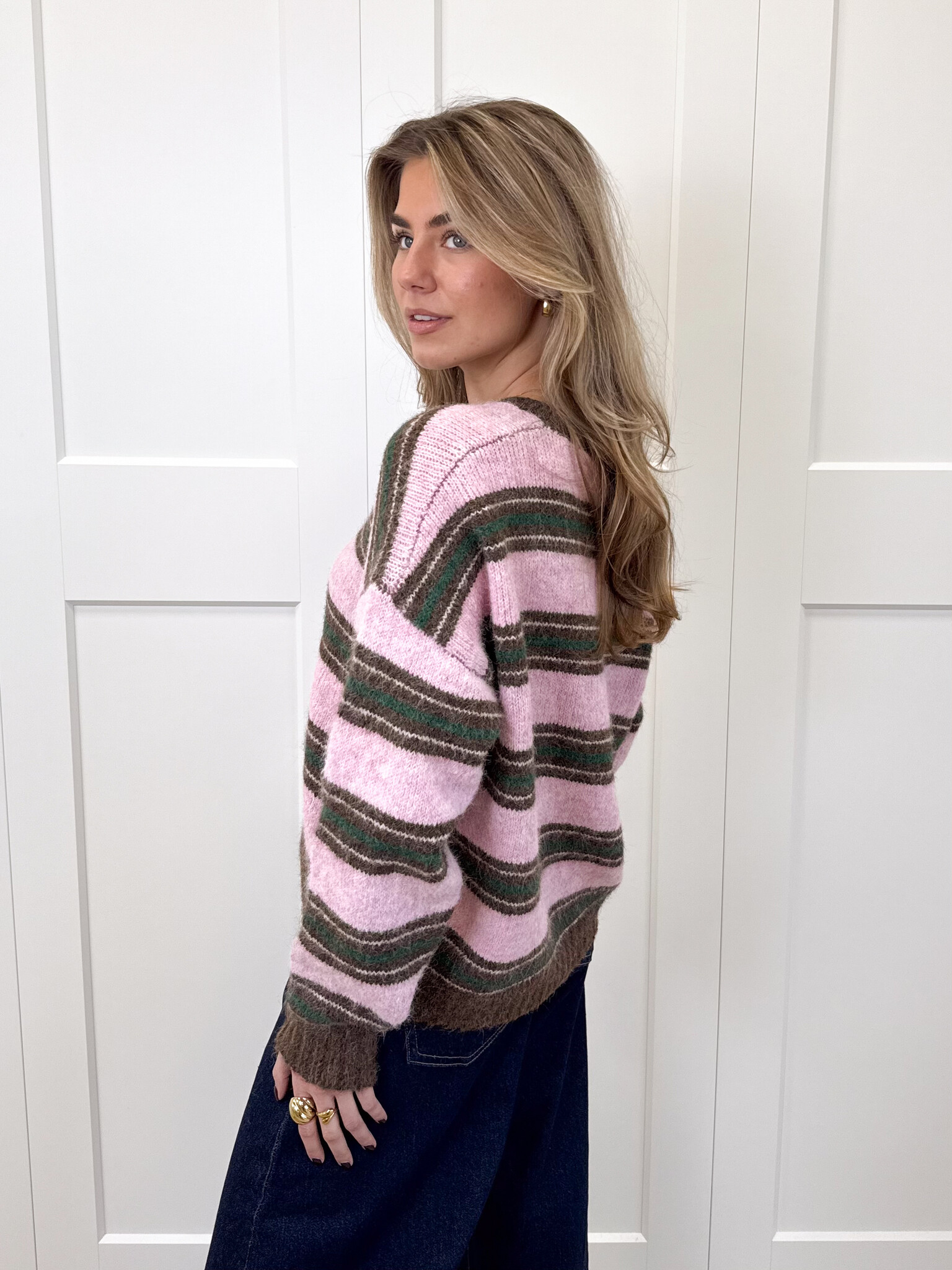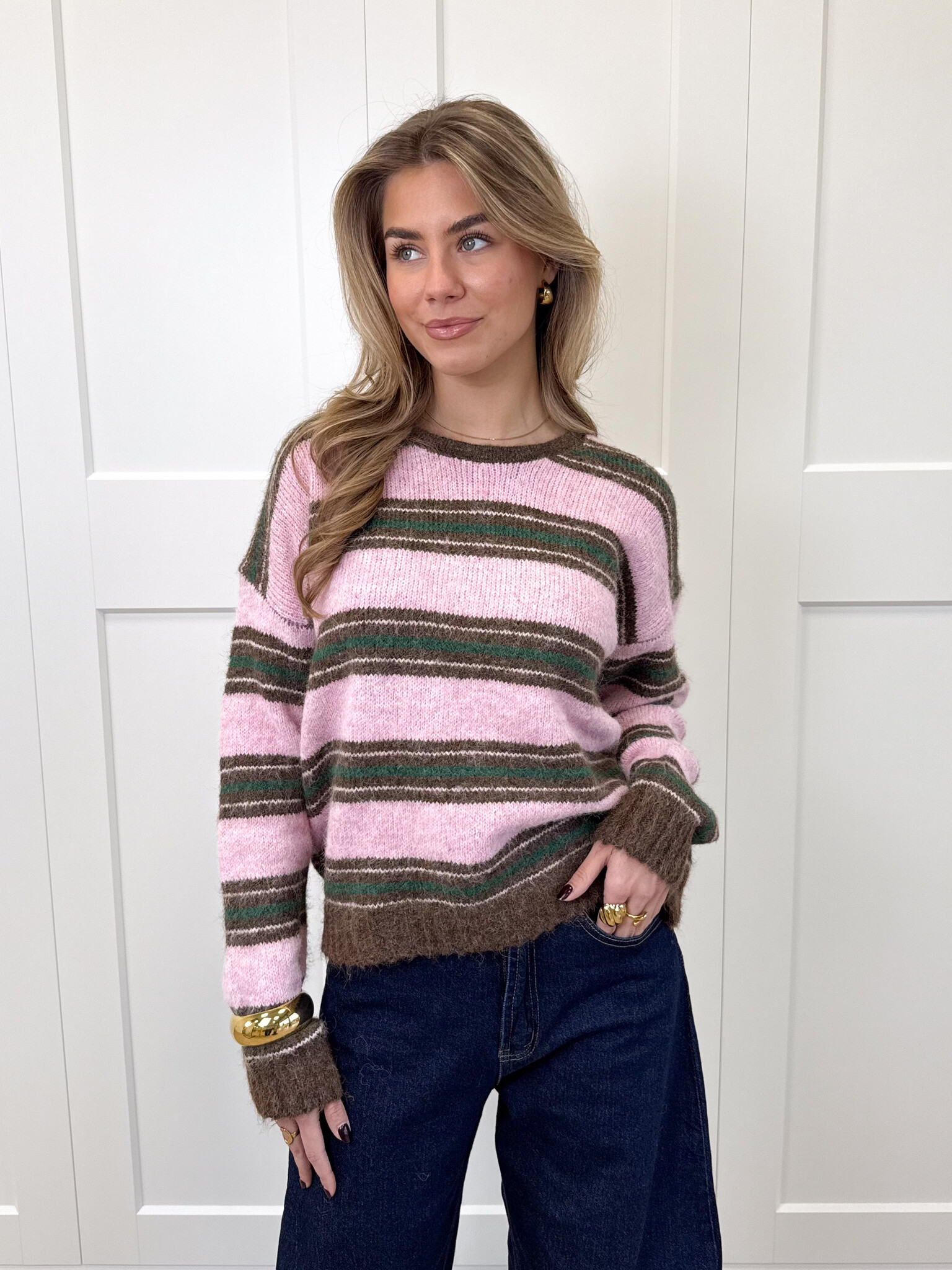 Deze zachte, fluffy knit is een echte must-have voor je cozy garderobe. De trui heeft een speels streeppatroon in roze en bruin, met subtiele groene detailstrepen die zorgen voor een frisse en trendy twist. Het materiaal voelt heerlijk zacht aan en geeft je meteen dat warme, comfortabele gevoel waar je in wilt wegkruipen op koude dagen. De knit valt soepel en heeft een fijne pasvorm die zowel relaxed als vrouwelijk oogt. Perfect voor een koffiedate, een dagje shoppen of gewoon een comfy dag thuis. Combineer ‘m met een jeans, pantalon of rok voor een girly, warme en stijlvolle look die je het hele seizoen door wilt dragen.