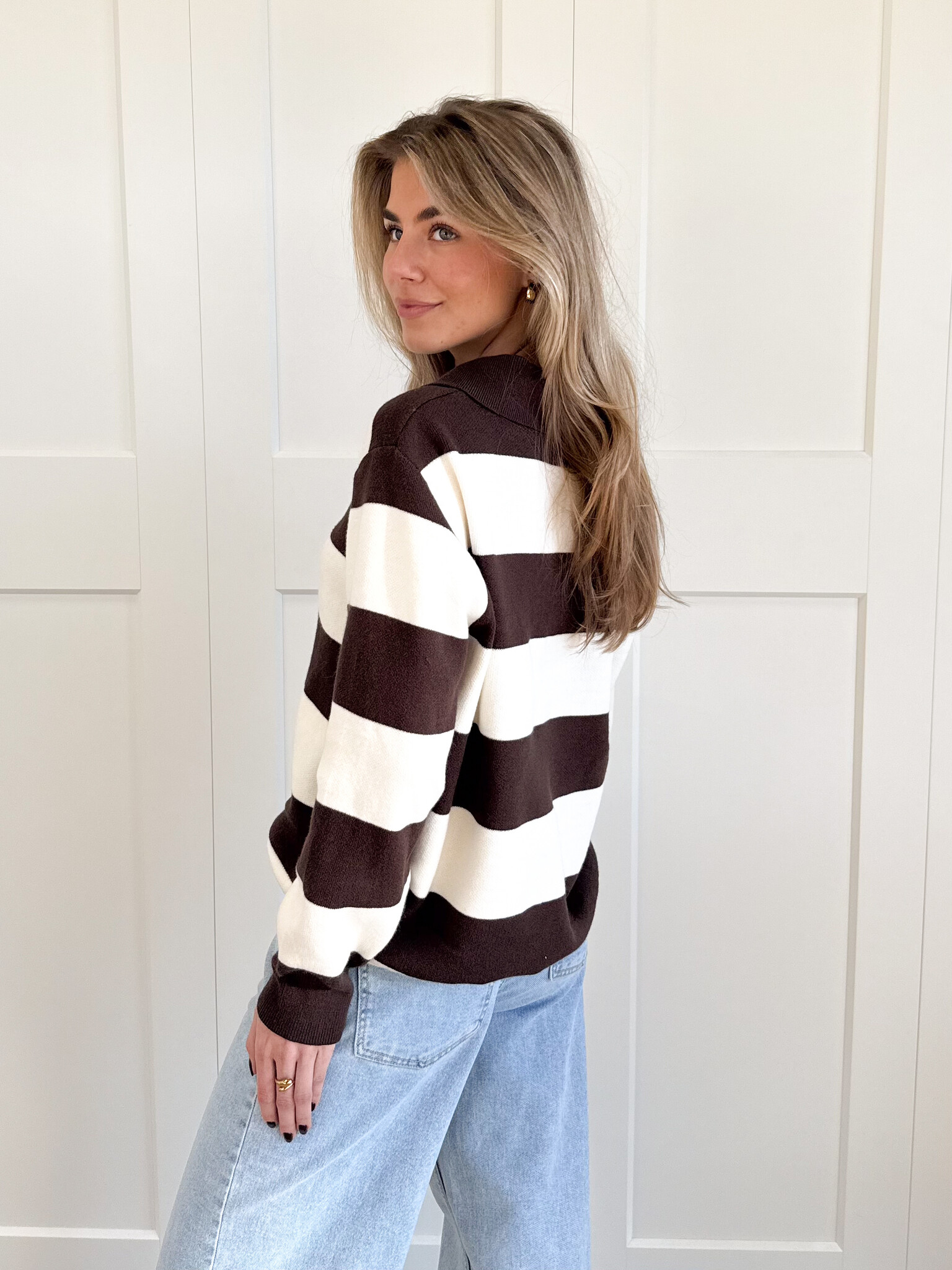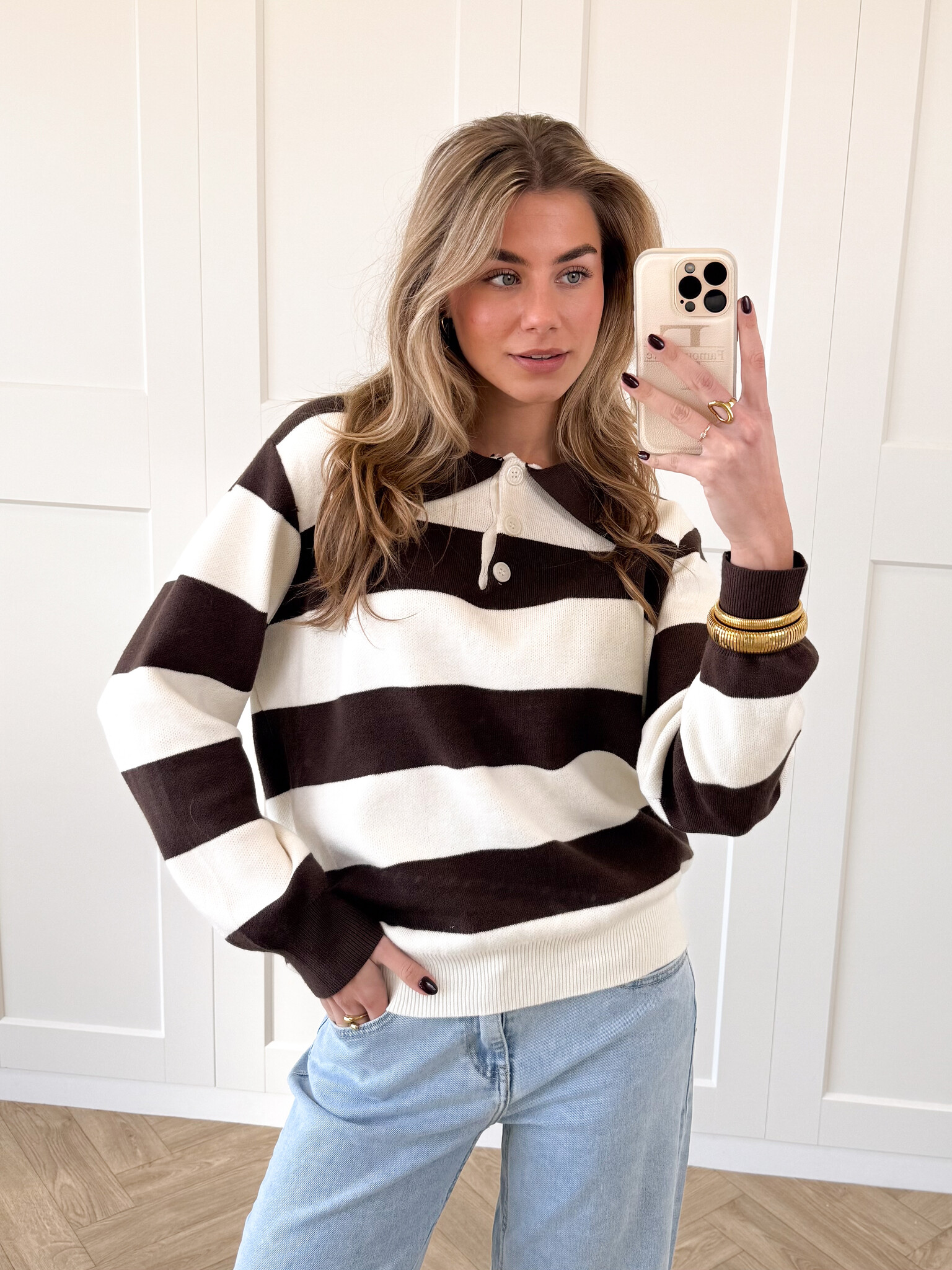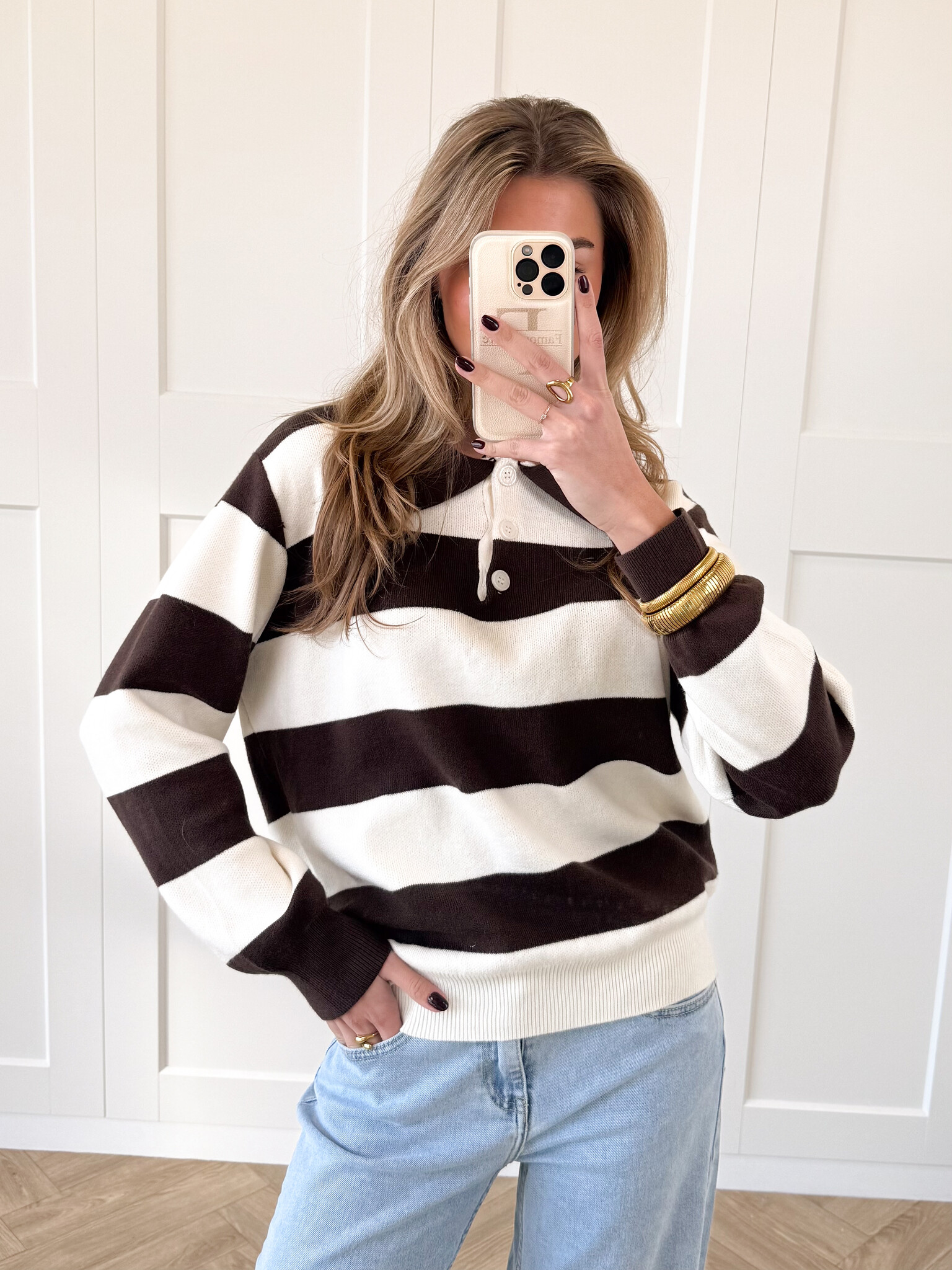 Deze oversized polo sweater in ecru met brede bruine strepen is je nieuwe go-to voor comfy en casual looks. Het kraagje met knoopjes geeft een klassieke touch, terwijl de zachte stof en relaxed fit zorgen voor ultiem draagcomfort. Perfect om solo te dragen of over een t-shirt voor extra laagjes. Combineer met jeans of joggers voor een stoere, relaxte outfit. Een super comfy en stijlvolle musthave!