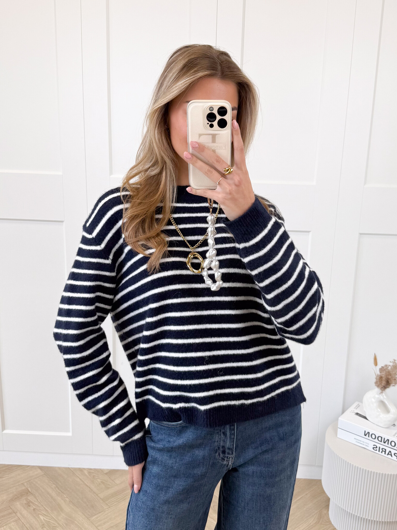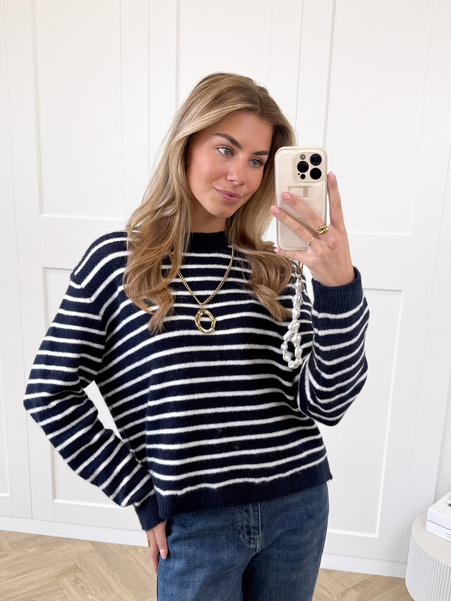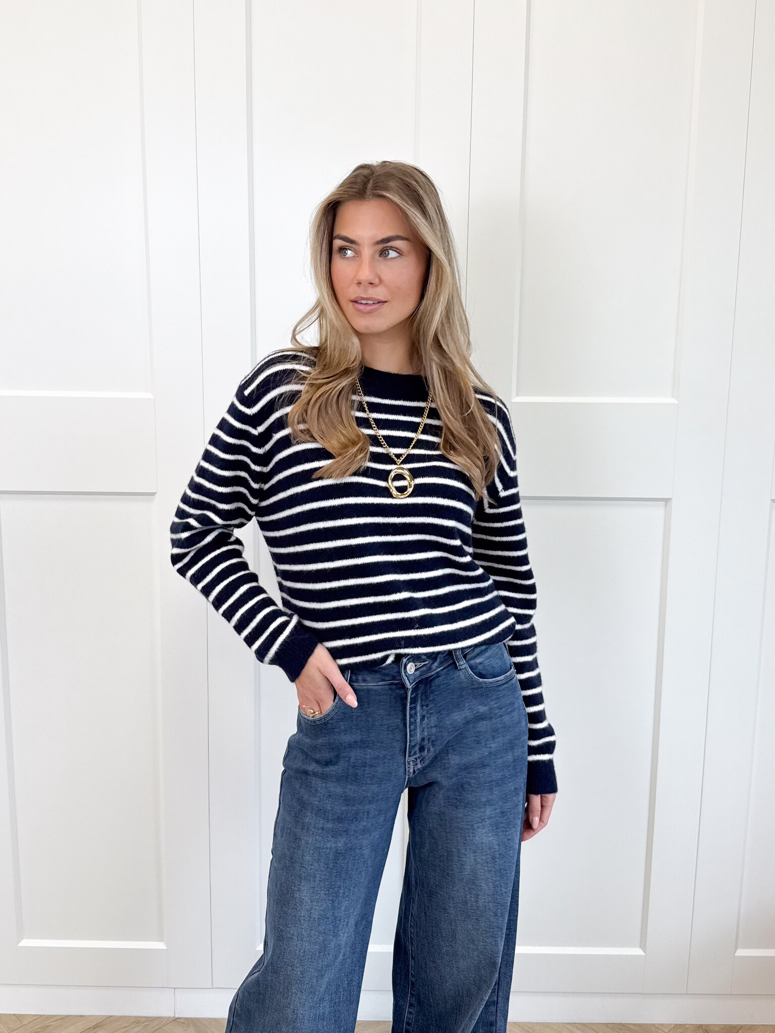 Say hello to our new favourite! Deze blauw-witte streepjes trui van zacht wol is super cozy én stijlvol tegelijk. De subtiele strepen geven een frisse en speelse look, terwijl de rafelrandjes aan de mouwen en onderkant een trendy, nonchalante touch toevoegen. Draag ‘m met je favoriete jeans en sneakers voor een casual, girly vibe, of combineer met een rok en boots voor een iets chiquere outfit. Perfect voor school, een koffiedate of een relaxte dag met vriendinnen. Comfortabel, fashionable en ready-to-wear voor elke dag van de week!