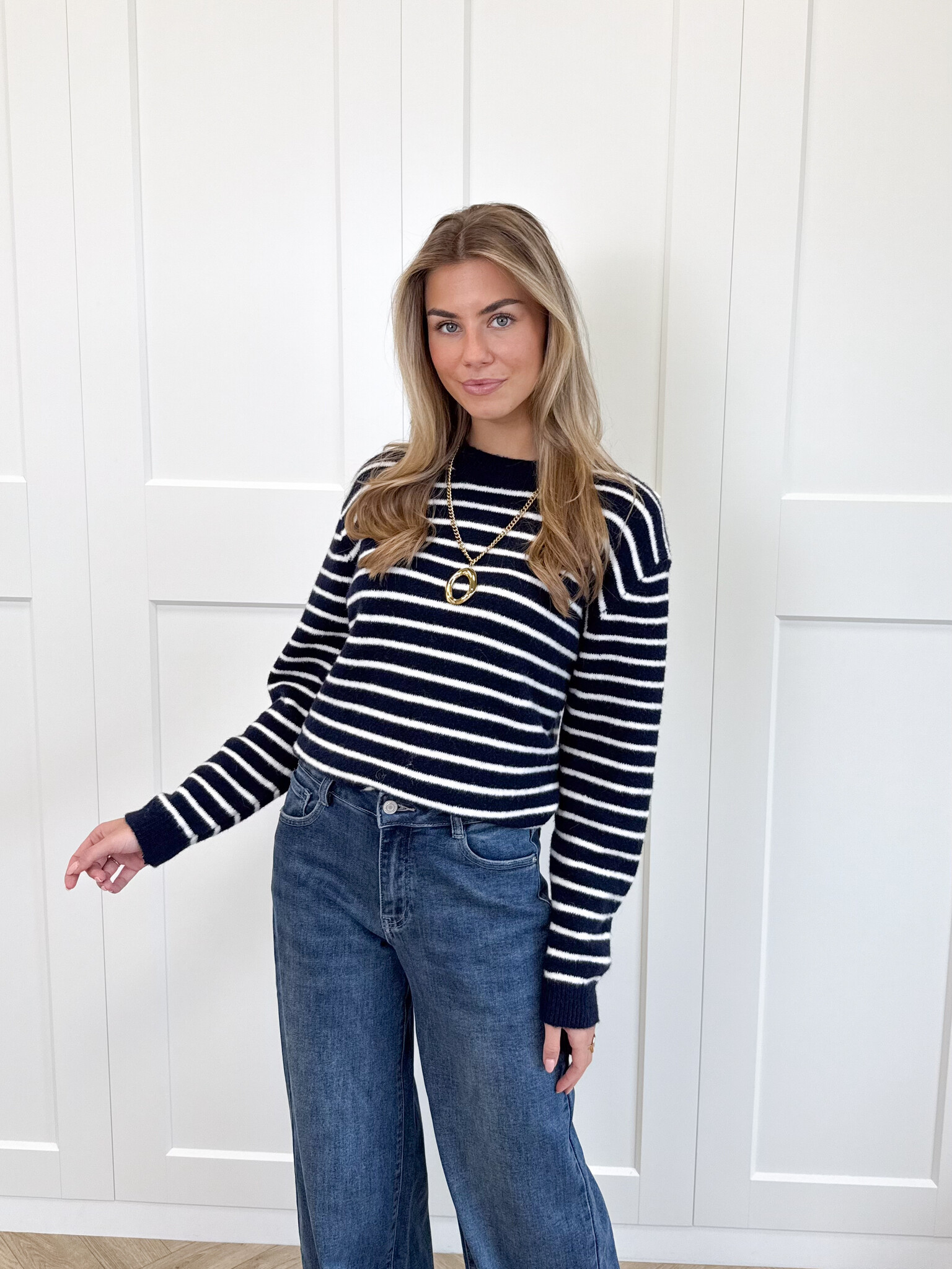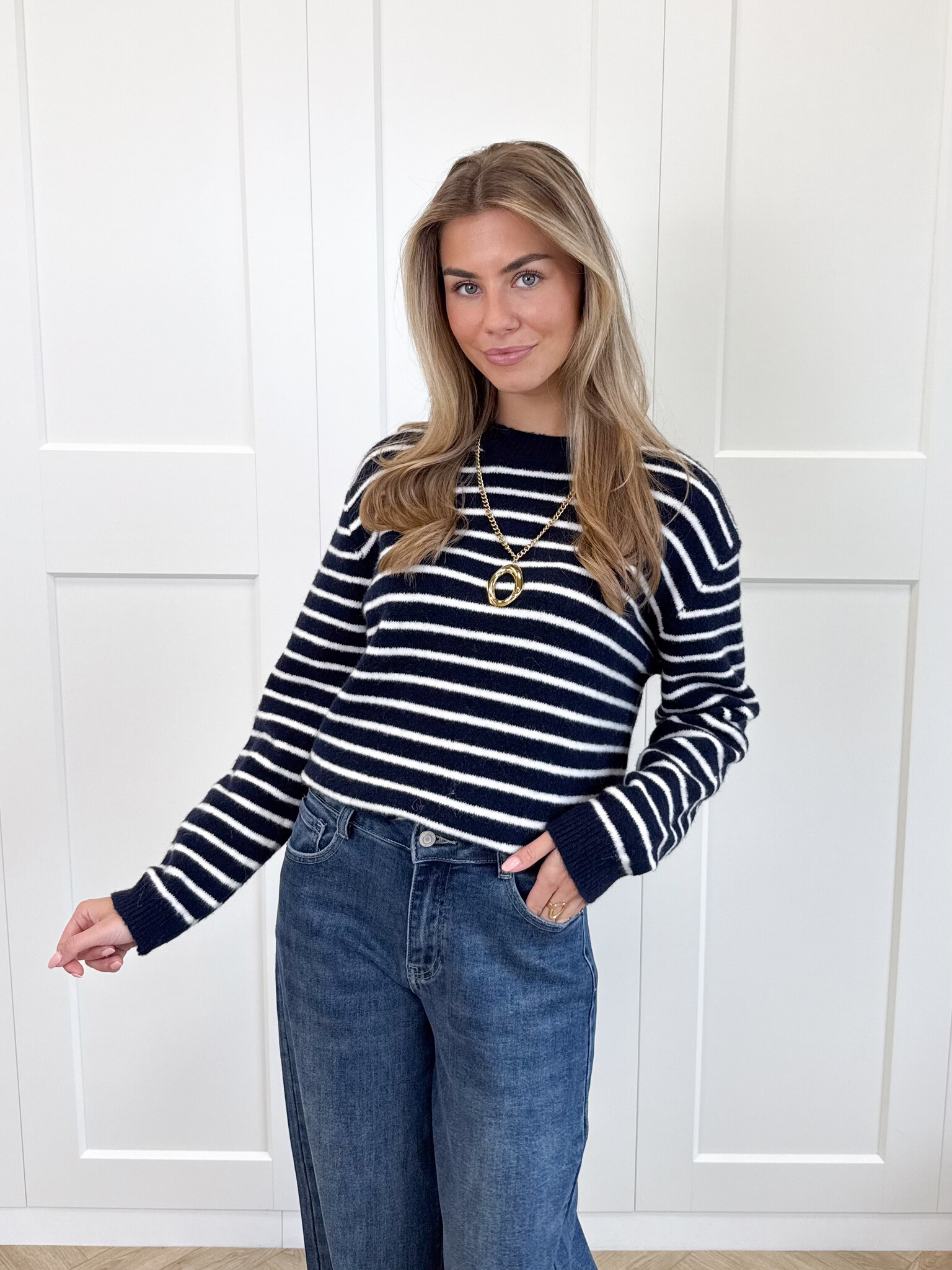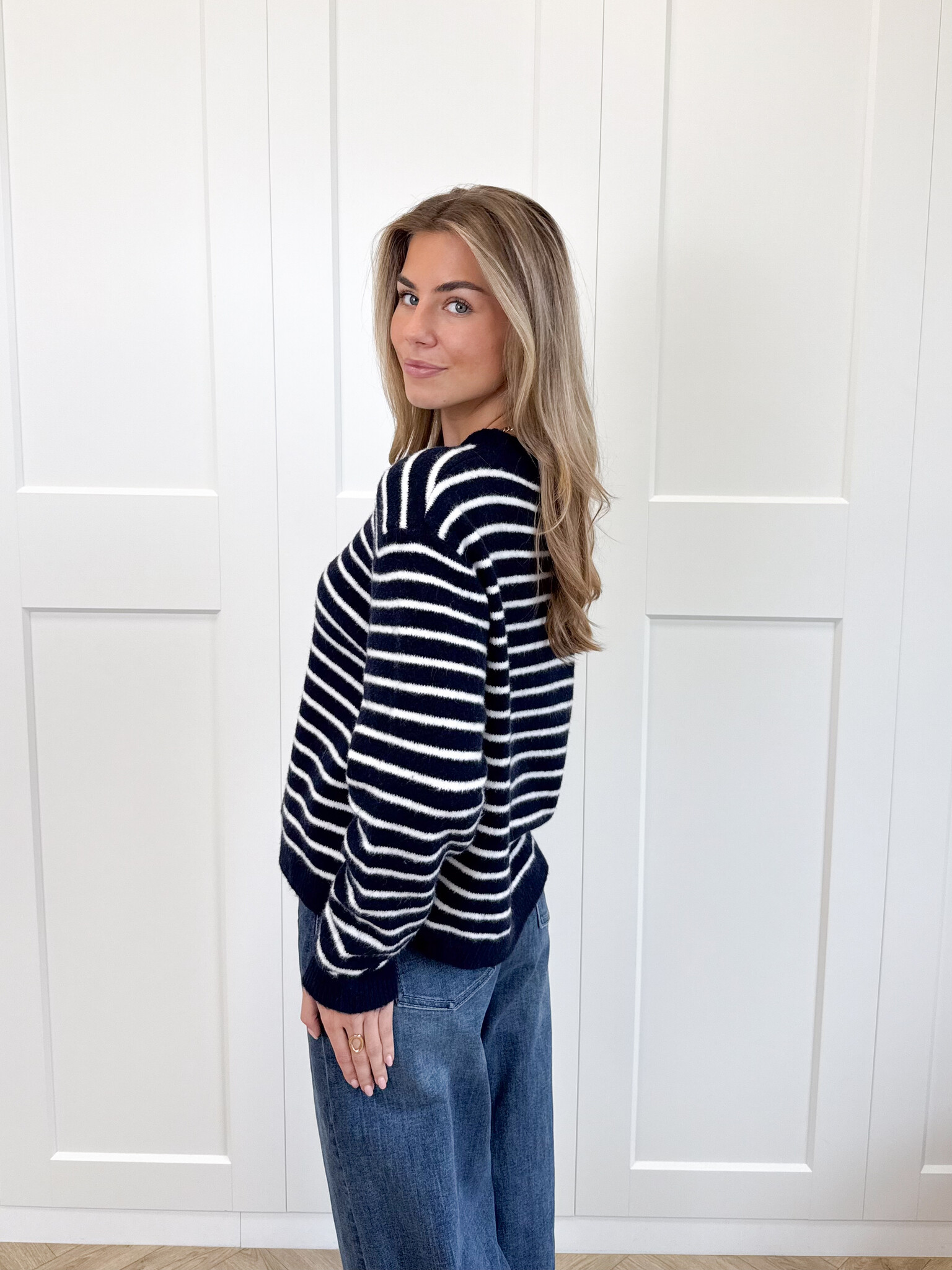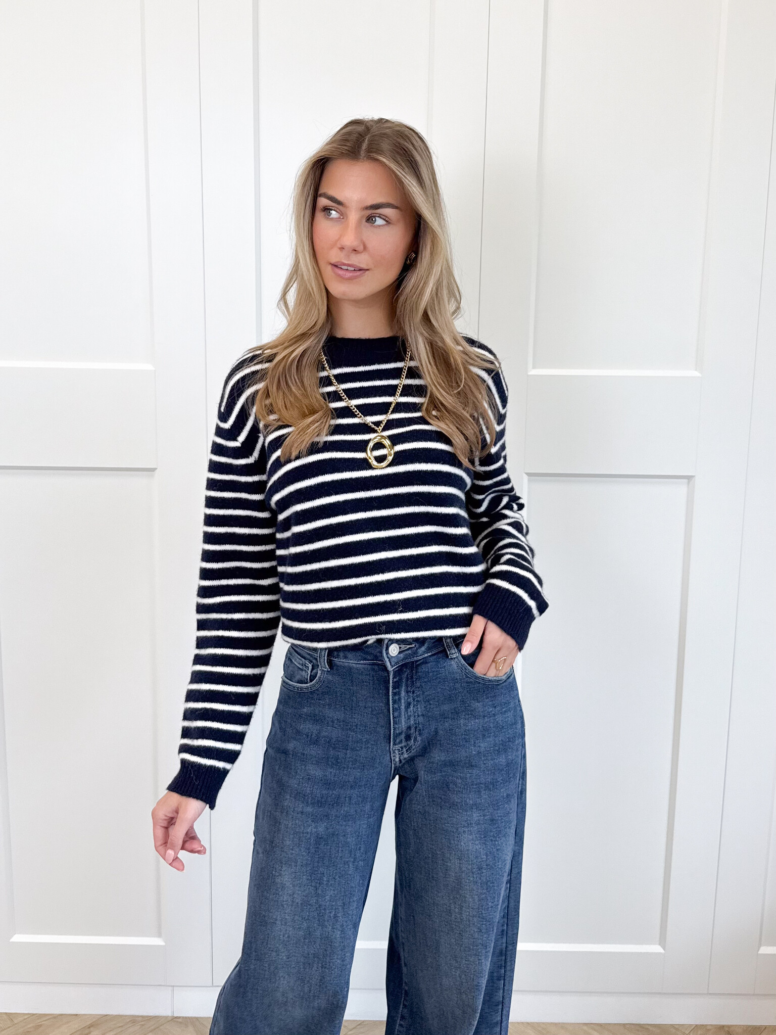 Say hello to our new favourite! Deze blauw-witte streepjes trui van zacht wol is super cozy én stijlvol tegelijk. De subtiele strepen geven een frisse en speelse look, terwijl de rafelrandjes aan de mouwen en onderkant een trendy, nonchalante touch toevoegen. Draag ‘m met je favoriete jeans en sneakers voor een casual, girly vibe, of combineer met een rok en boots voor een iets chiquere outfit. Perfect voor school, een koffiedate of een relaxte dag met vriendinnen. Comfortabel, fashionable en ready-to-wear voor elke dag van de week!