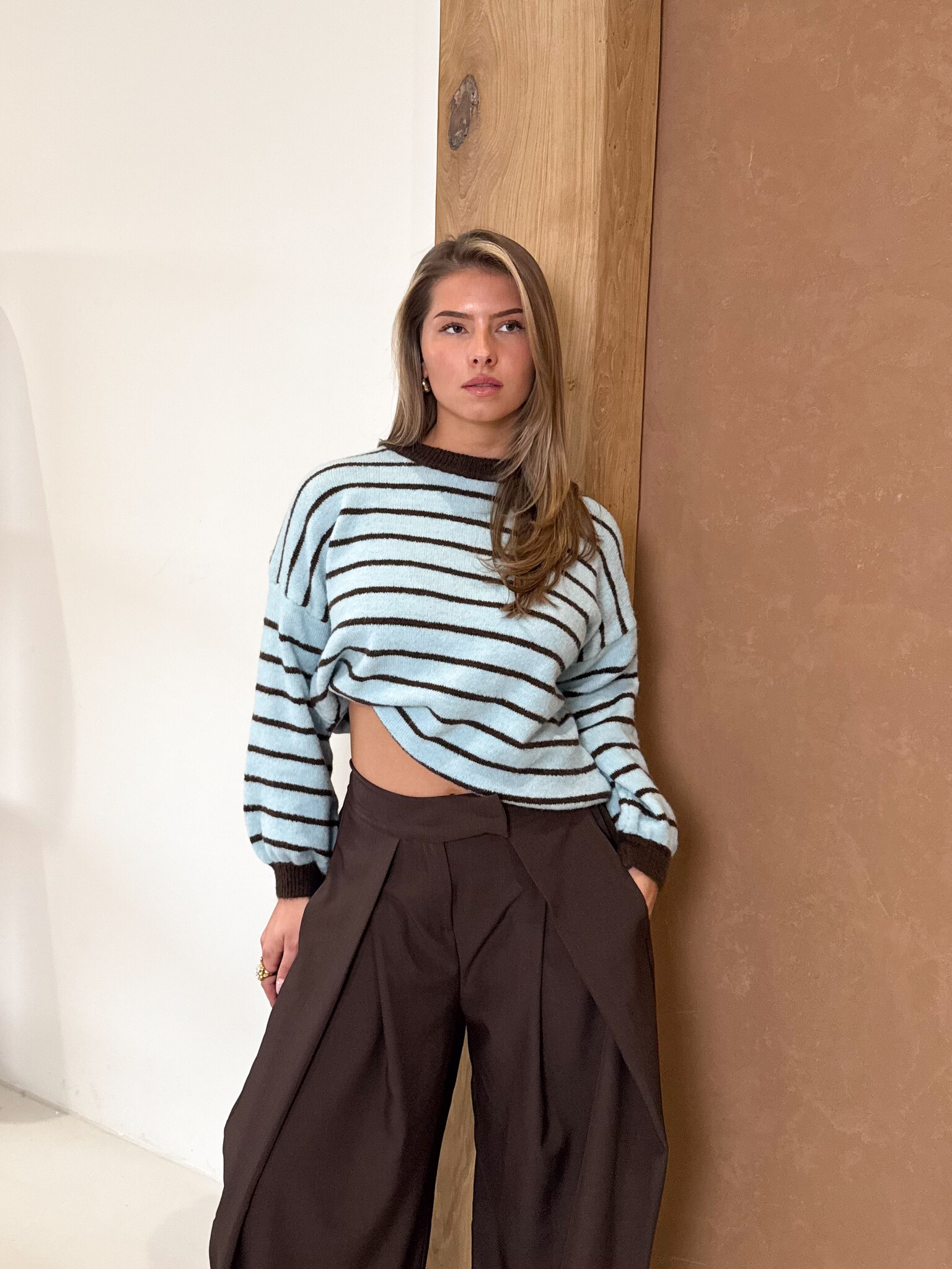 Deze trui in blauw en bruine strepen is gemaakt van een zachte, comfortabele stof die heerlijk aanvoelt op de huid. De strepen geven een speelse maar stijlvolle look, waardoor hij makkelijk te combineren is met jeans, pantalons of een rokje. Dankzij de elastische kwaliteit beweegt de stof soepel mee en zit hij fijn gedurende de hele dag. De cozy uitstraling maakt dit item perfect voor koudere dagen, terwijl het design ervoor zorgt dat je er alsnog fashionable uitziet. Ideaal voor zowel casual momenten als een relaxte maar verzorgde outfit.