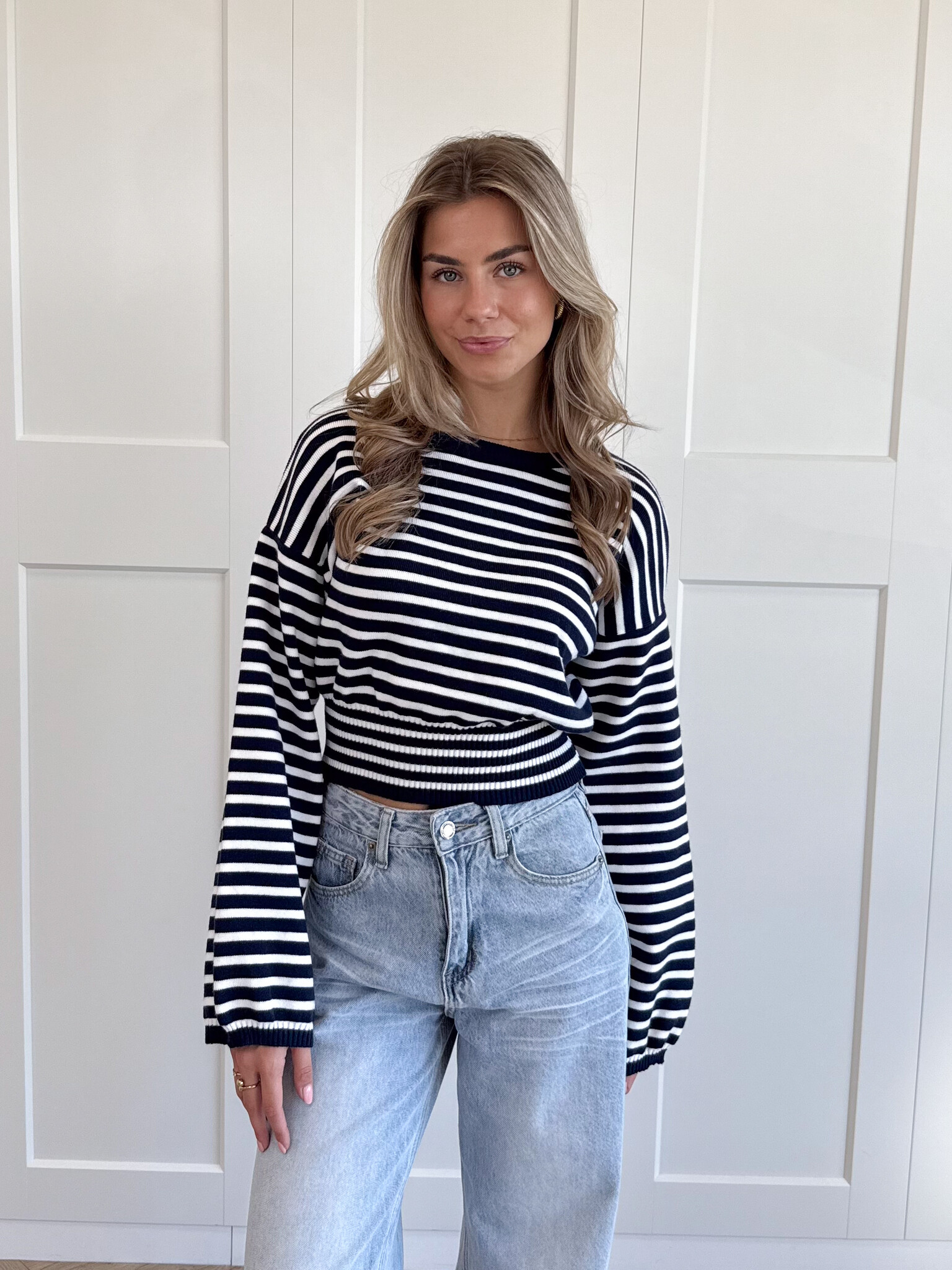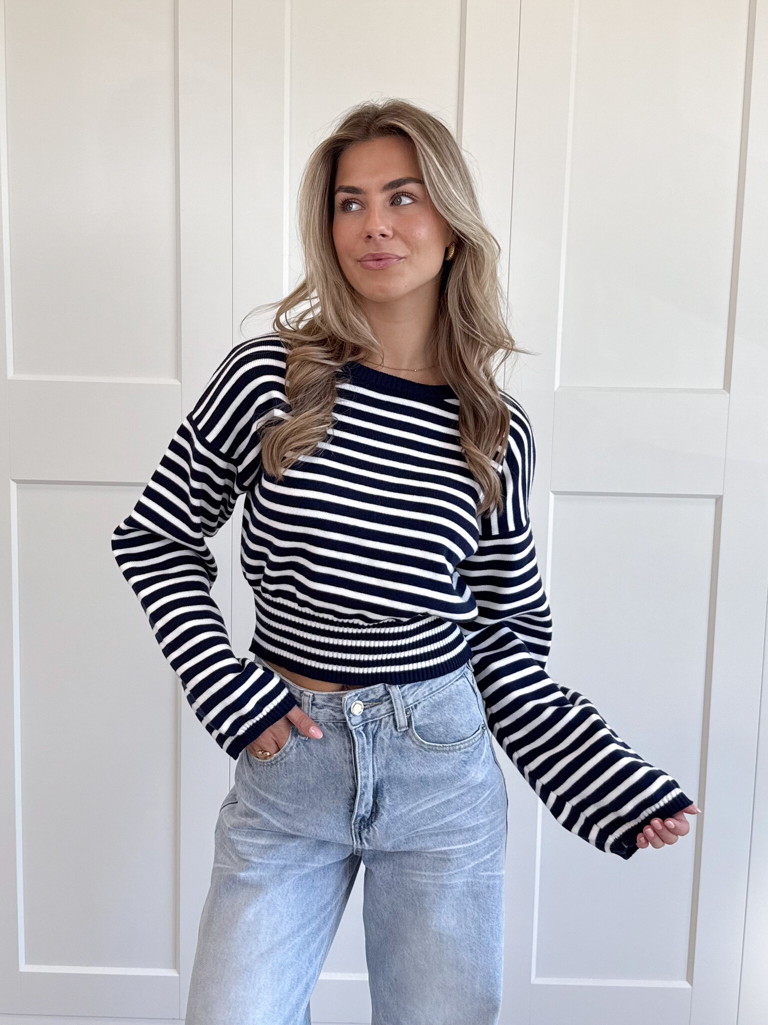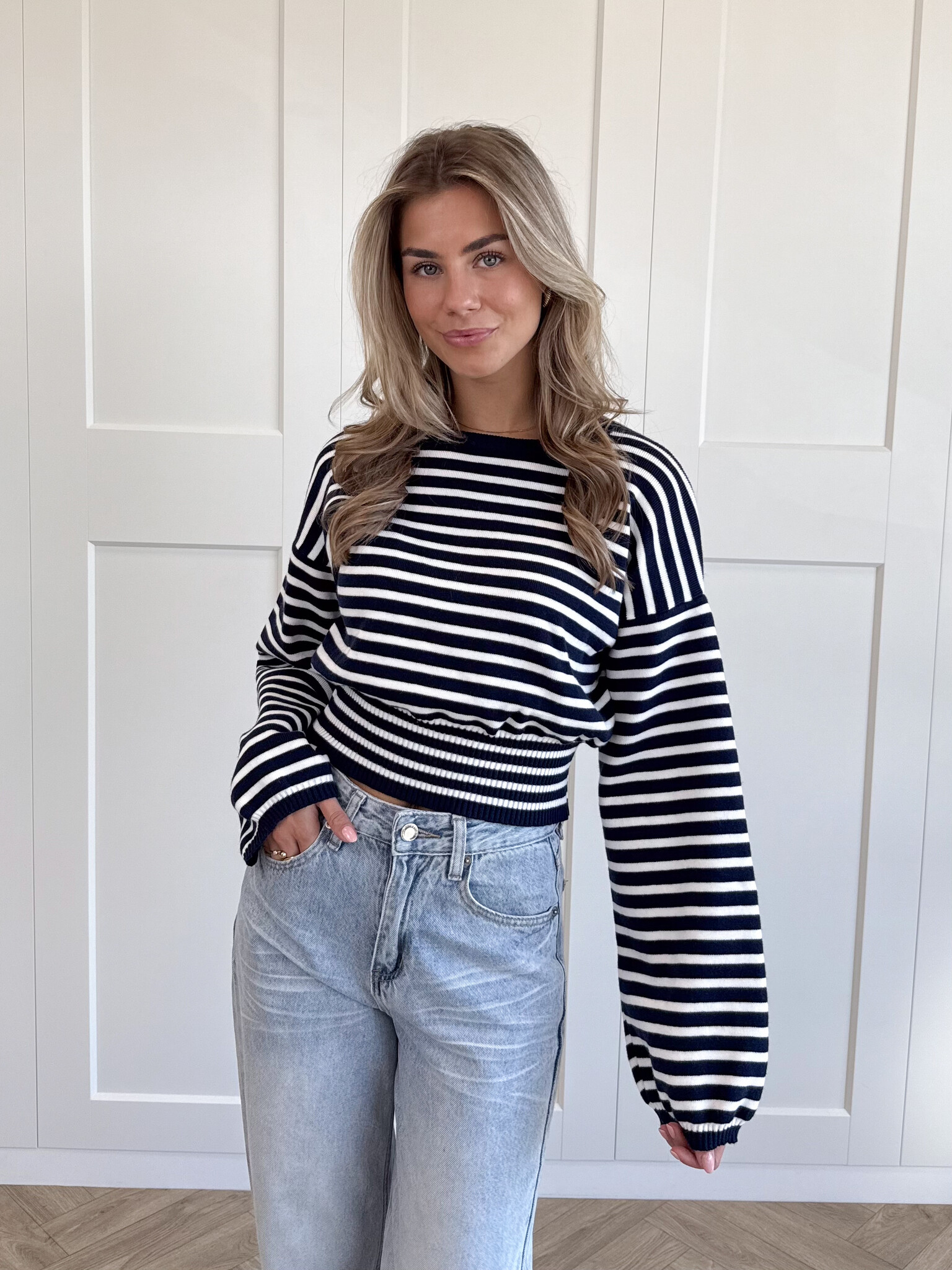 Strepen, strepen en nog meer strepen! Een print die nooit uit de mode zal raken. Deze trui is daarom een echte tijdloze musthave. Deze trui zit aan de onderkant wat getailleerd, waardoor het een mooi model geeft. Het zit heerlijk door de goeie stretch. Dit truitje valt mooi soepel en houdt je lekker warm voor de koudere dagen. Je shopt deze trui in twéé verschillende kleuren!