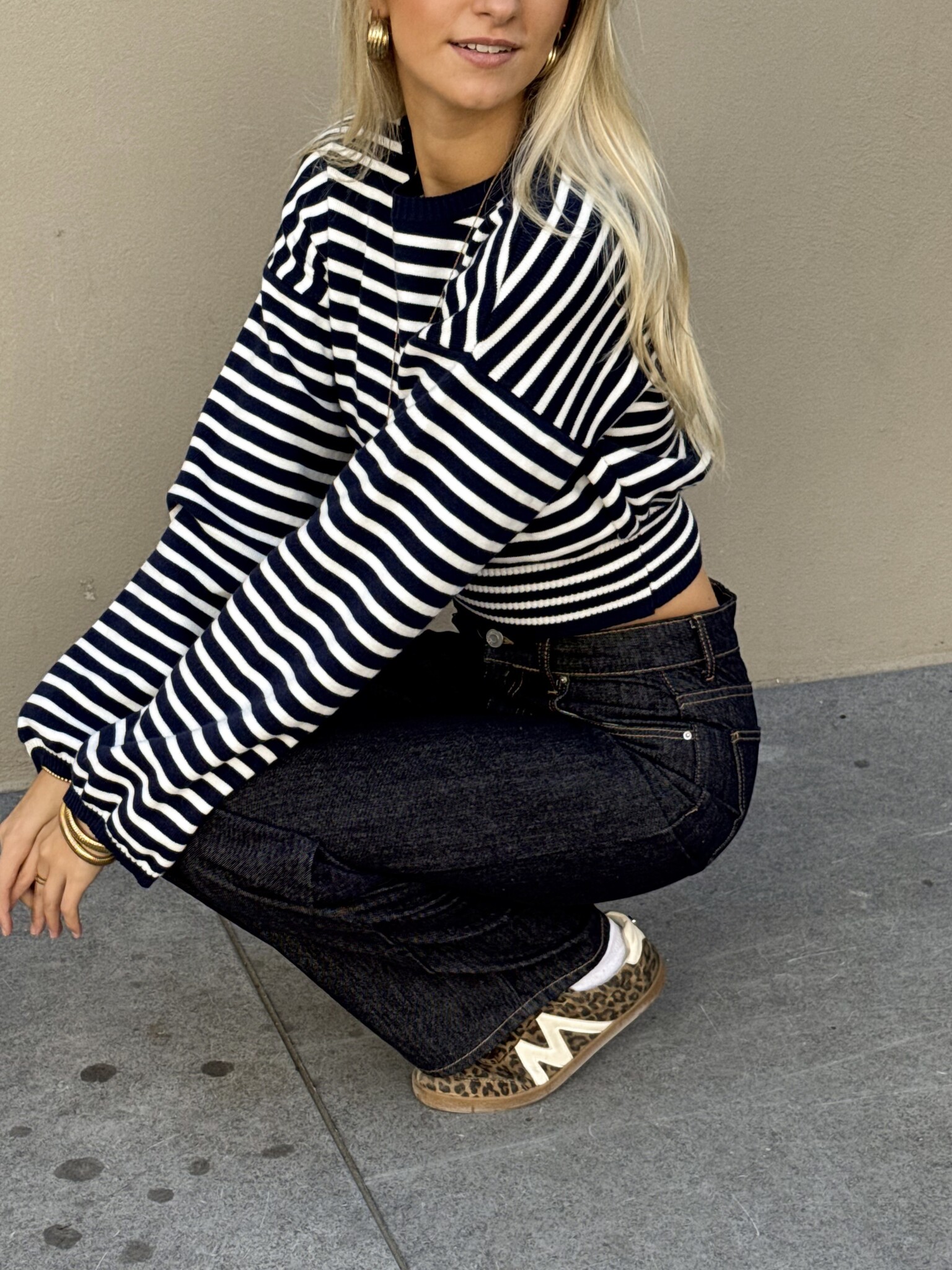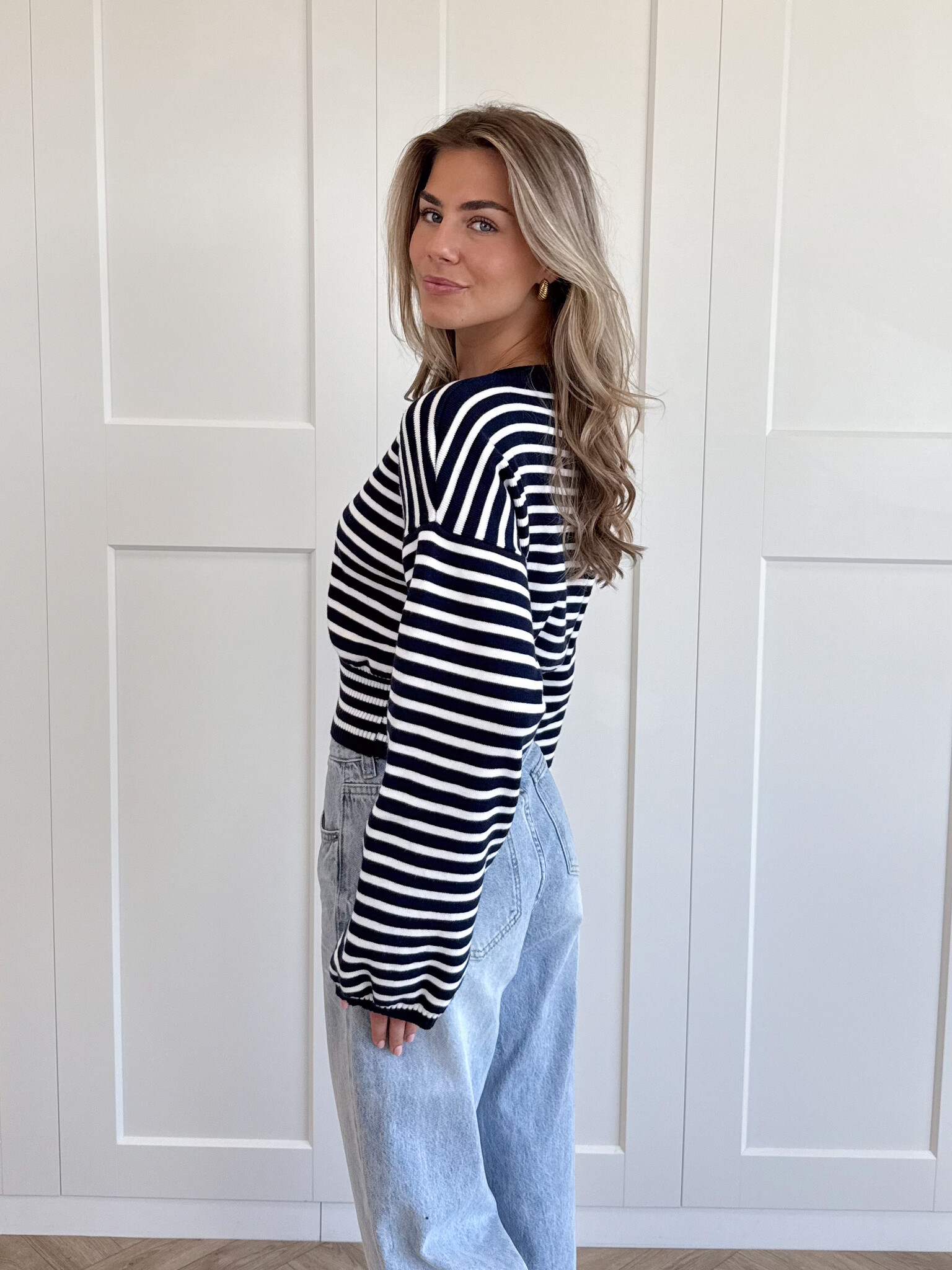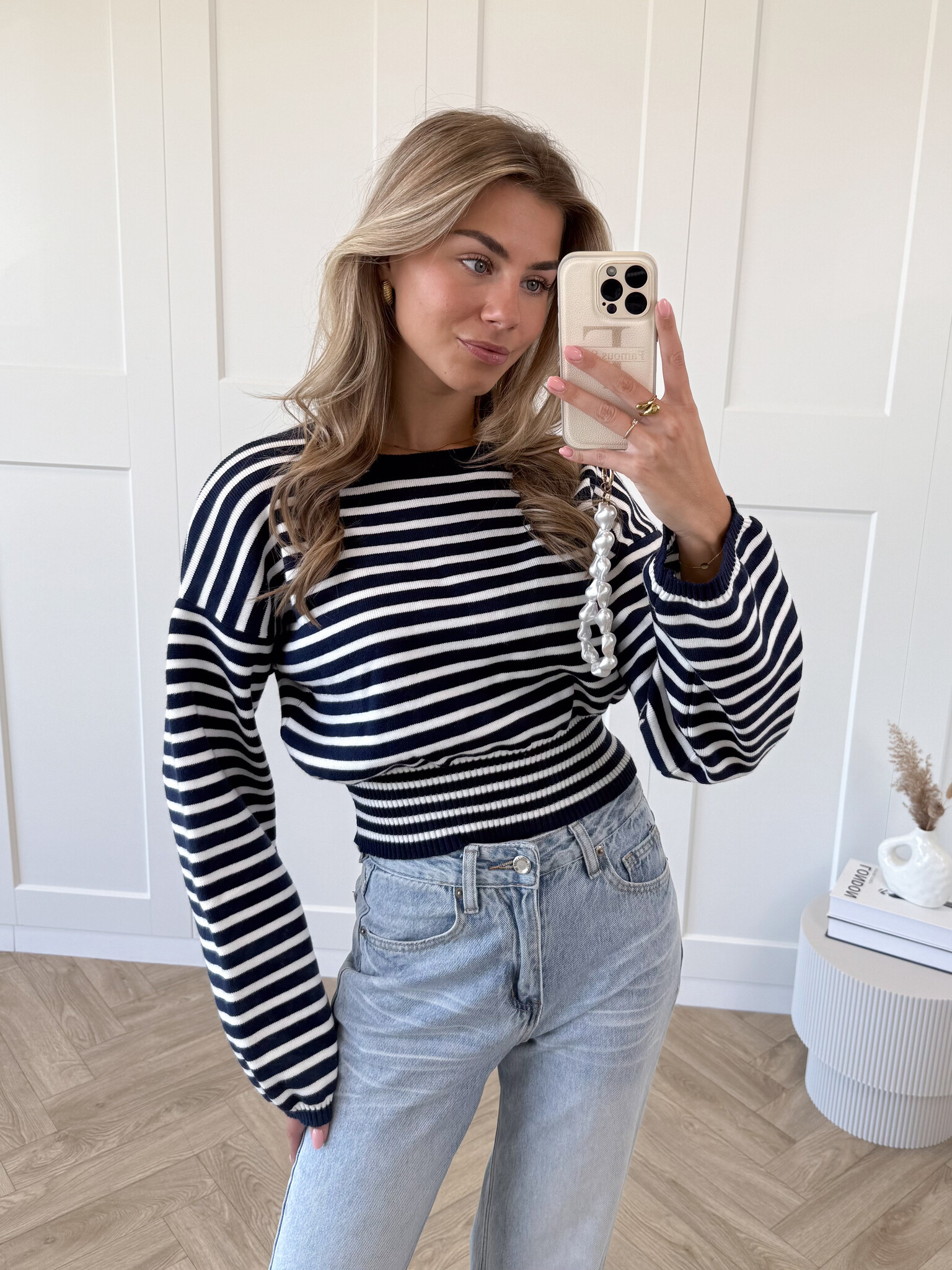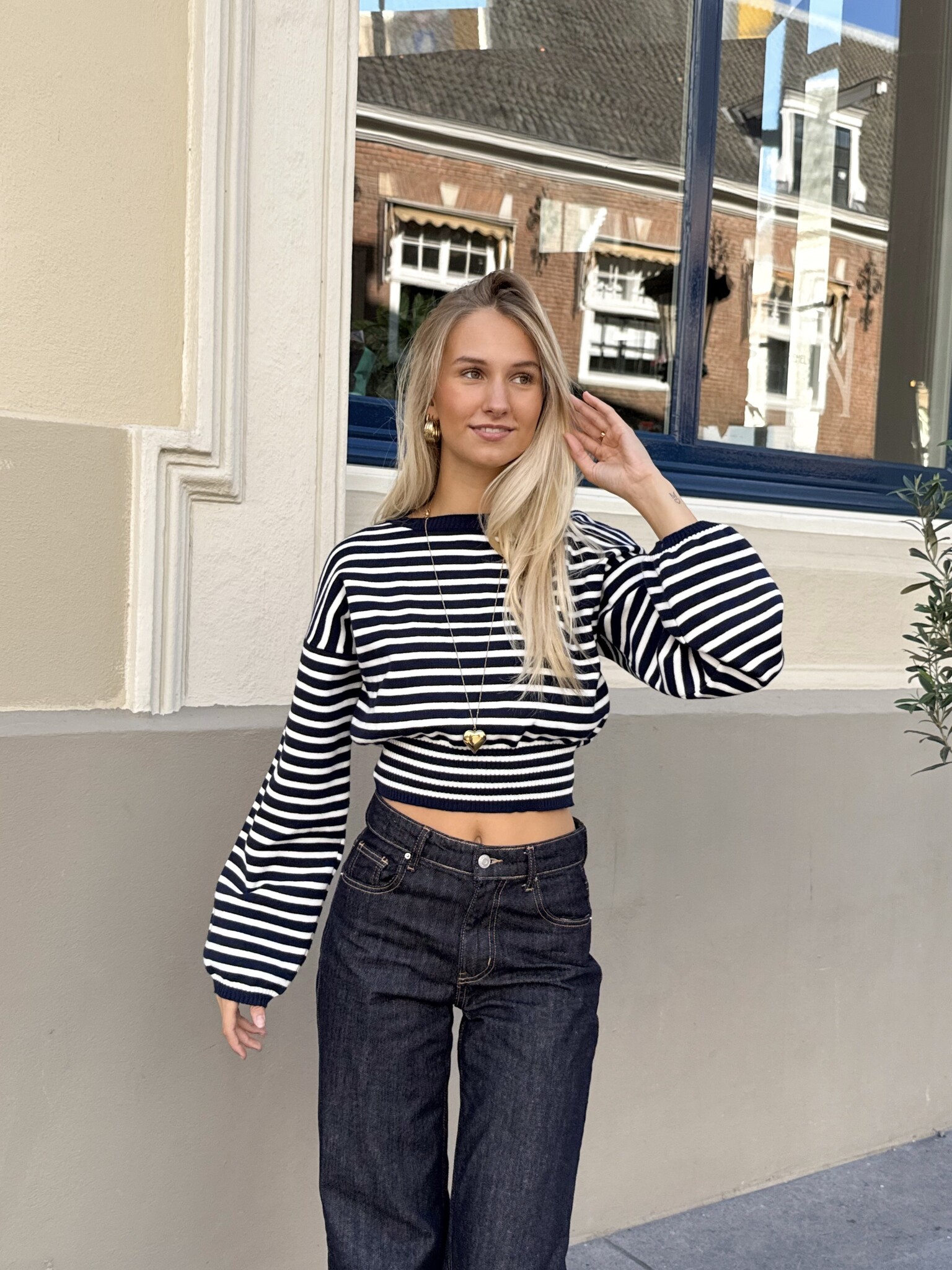 Strepen, strepen en nog meer strepen! Een print die nooit uit de mode zal raken. Deze trui is daarom een echte tijdloze musthave. Deze trui zit aan de onderkant wat getailleerd, waardoor het een mooi model geeft. Het zit heerlijk door de goeie stretch. Dit truitje valt mooi soepel en houdt je lekker warm voor de koudere dagen. Je shopt deze trui in twéé verschillende kleuren!