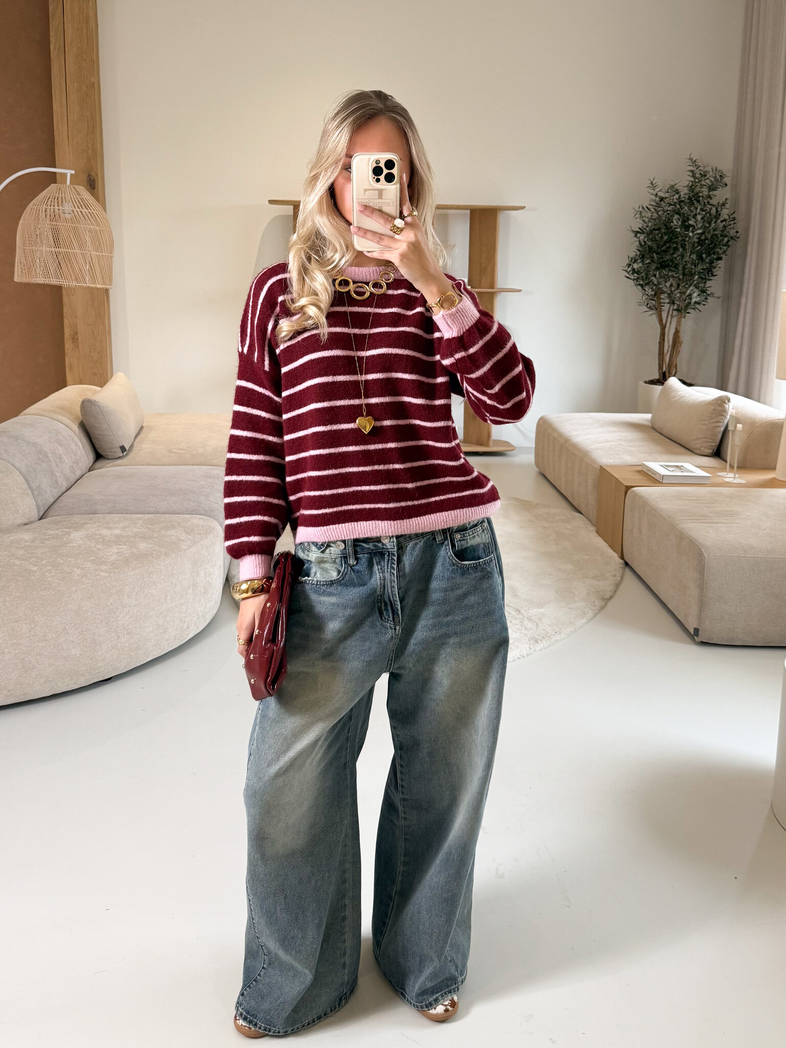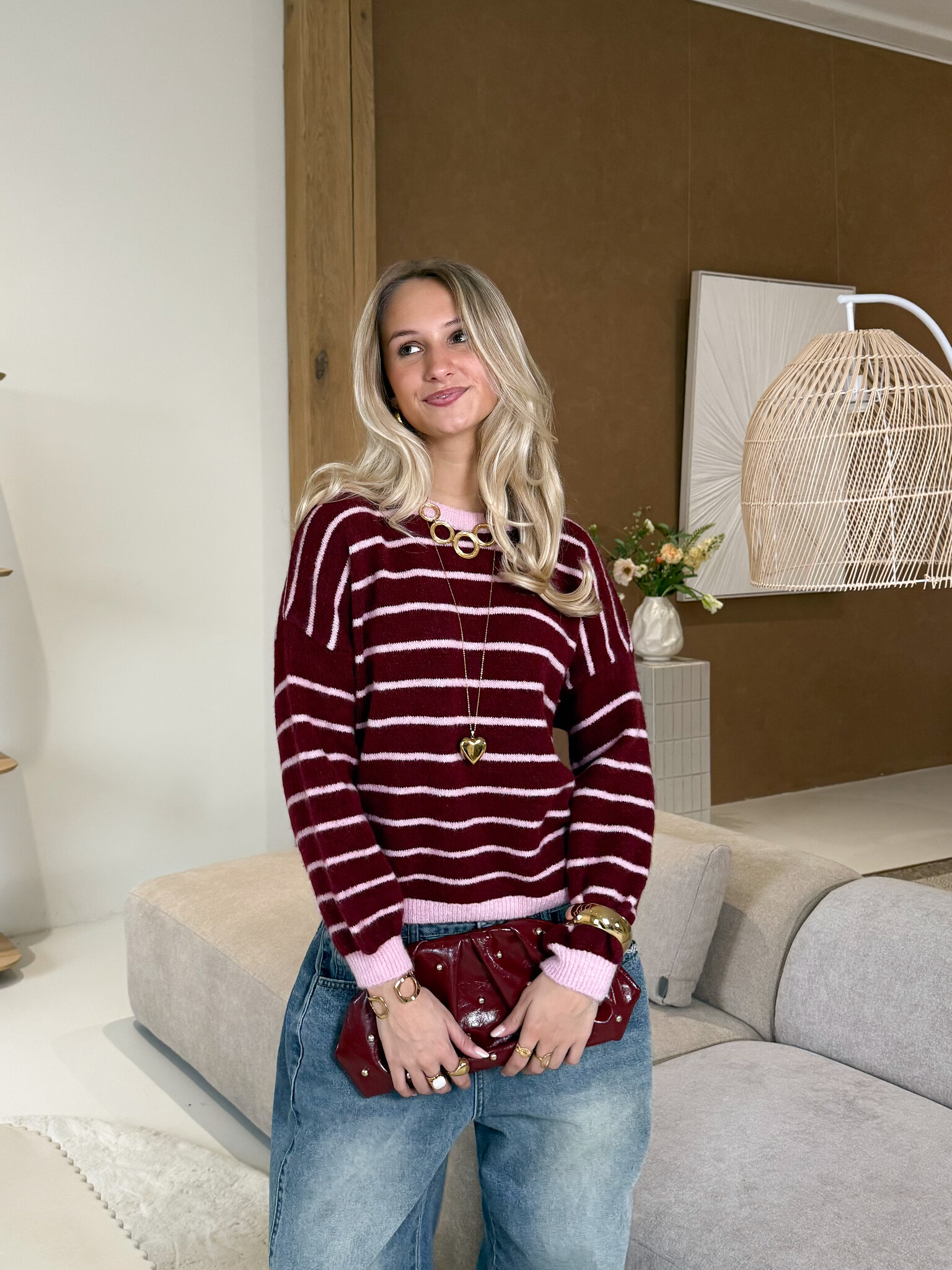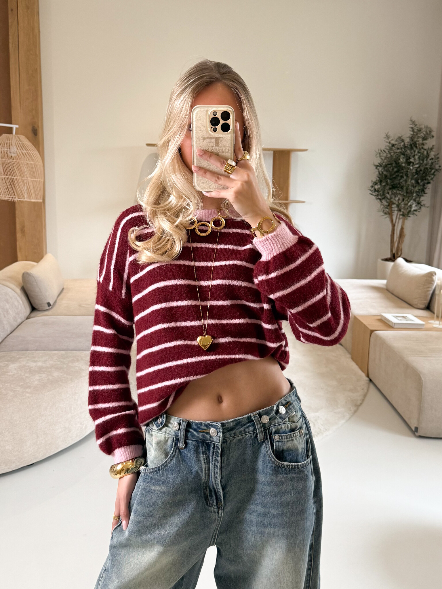 Deze trui is gemaakt van een zachte, comfortabele stof die heerlijk aanvoelt op de huid. De strepen geven een speelse maar stijlvolle look, waardoor hij makkelijk te combineren is met jeans, pantalons of een rokje. Dankzij de elastische kwaliteit beweegt de stof soepel mee en zit hij fijn gedurende de hele dag. De cozy uitstraling maakt dit item perfect voor koudere dagen, terwijl het design ervoor zorgt dat je er alsnog fashionable uitziet. Ideaal voor zowel casual momenten als een relaxte maar verzorgde outfit.