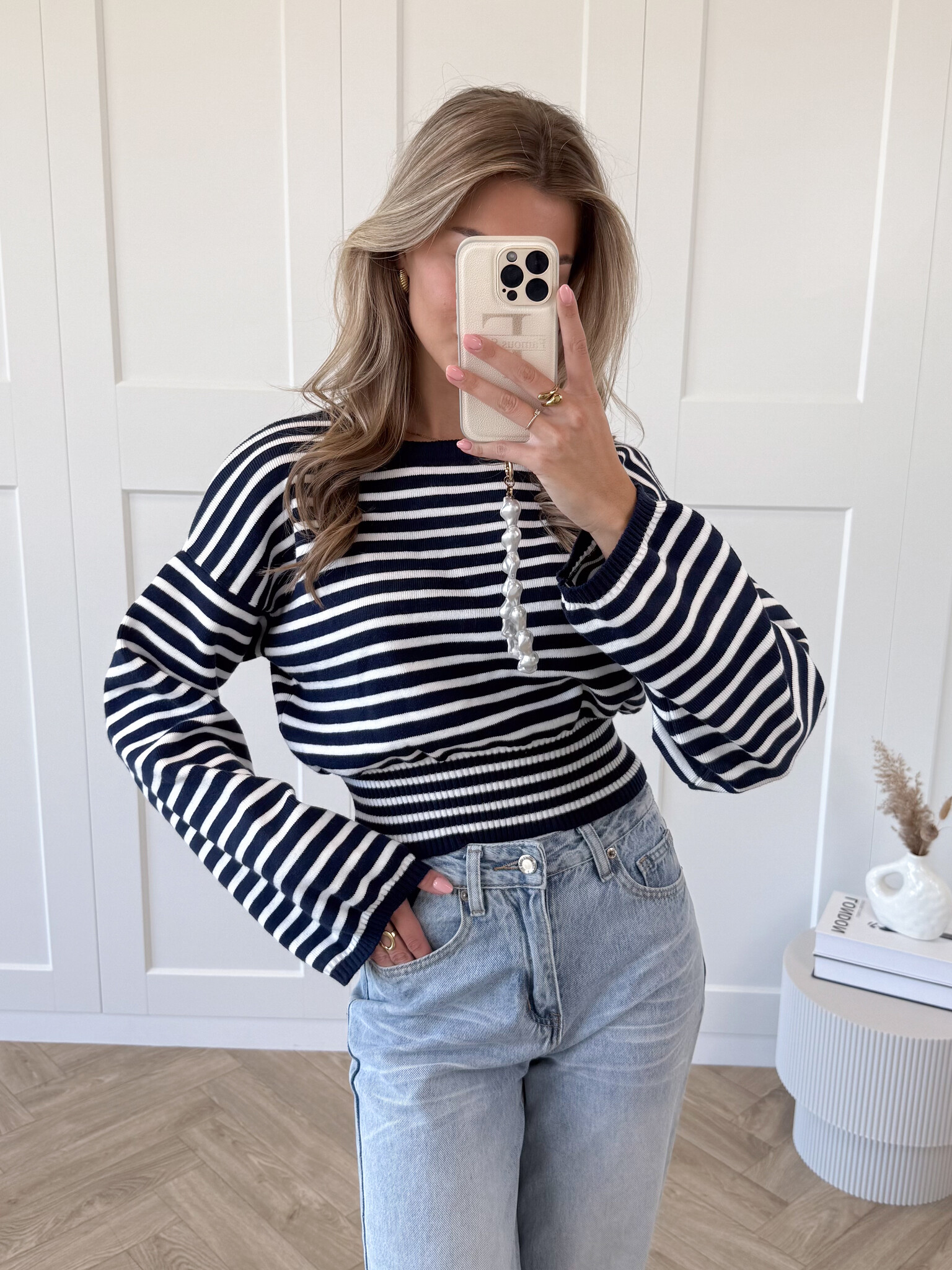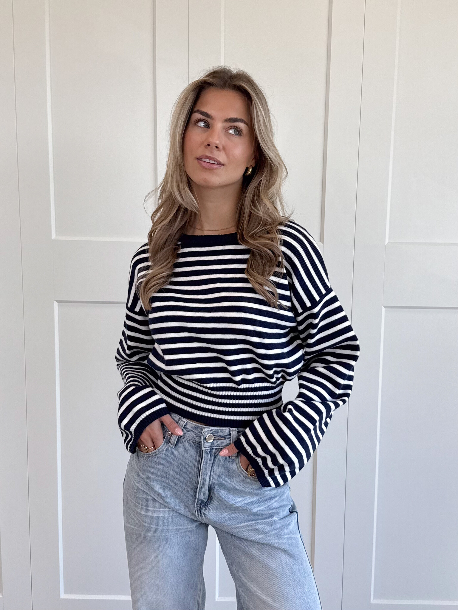 Strepen, strepen en nog meer strepen! Een print die nooit uit de mode zal raken. Deze trui is daarom een echte tijdloze musthave. Deze trui zit aan de onderkant wat getailleerd, waardoor het een mooi model geeft. Het zit heerlijk door de goeie stretch. Dit truitje valt mooi soepel en houdt je lekker warm voor de koudere dagen. Je shopt deze trui in twéé verschillende kleuren!