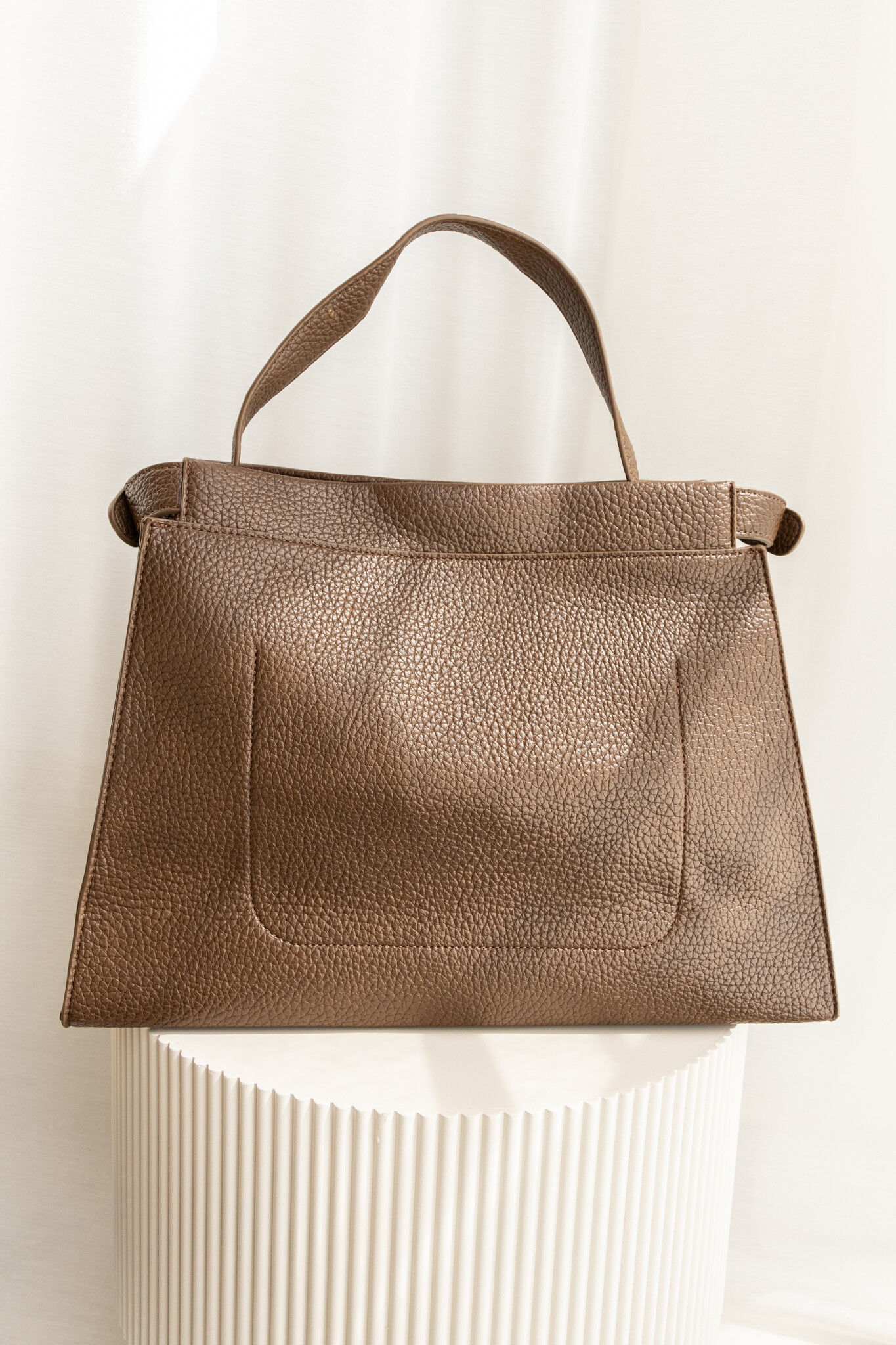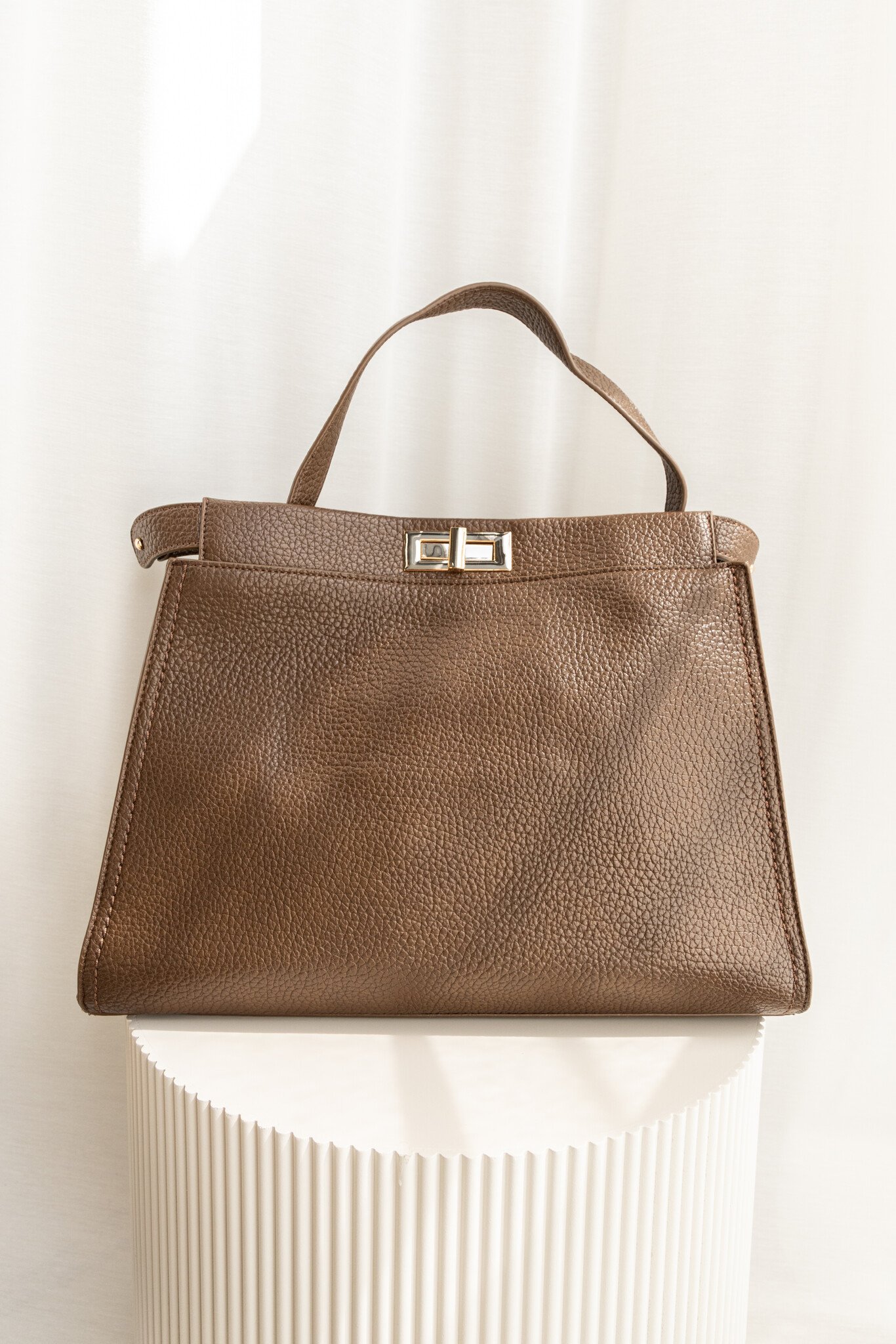 Ontdek deze stijlvolle bruine tas van stevig leerlook materiaal. De tas heeft een middenhandvat en een verstelbare band. Je kunt haar ook makkelijk crossbody dragen, ideaal voor onderweg. Het gouden sluitdetail voegt een chique touch toe, waardoor deze tas moeiteloos elke outfit een upgrade geeft. Van kantoor tot diner. Elegant, praktisch en tijdloos!