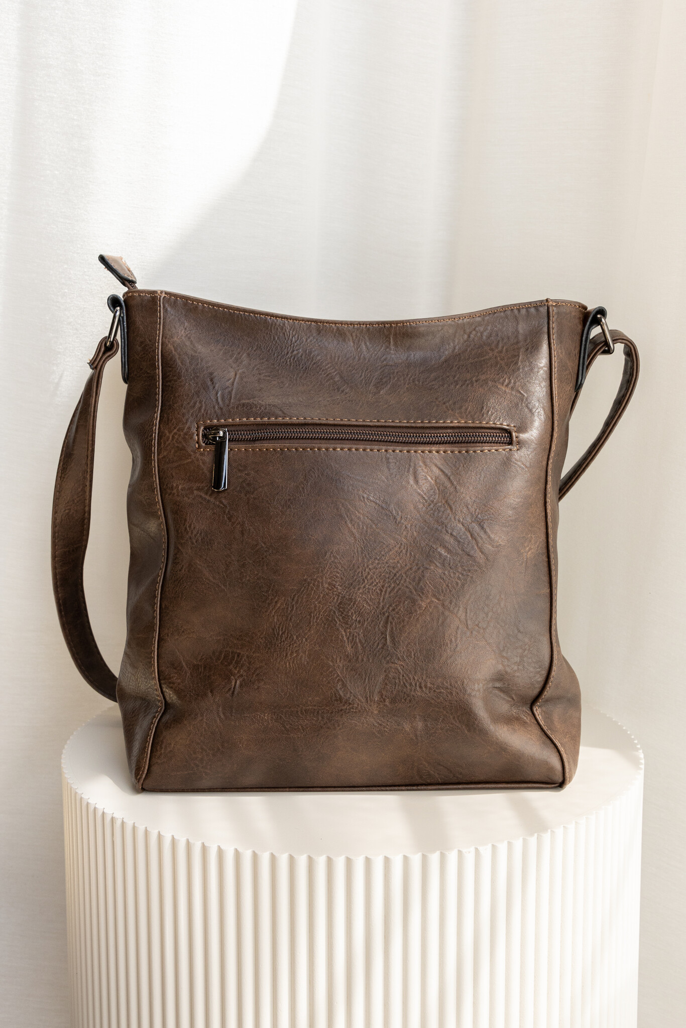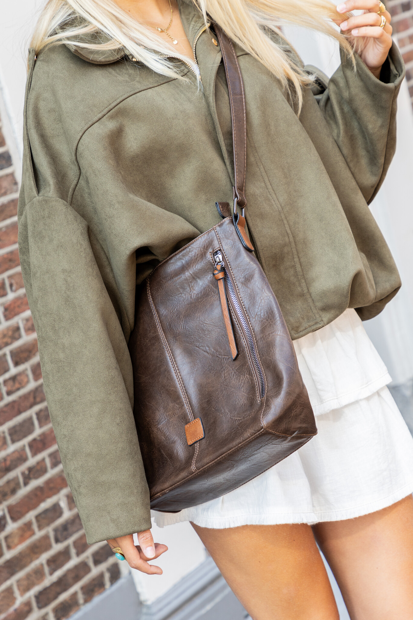 Maak je look compleet met Indy, de ultieme crossbody. Deze tas in stoere bruine leerlook is voorzien van zilverkleurige ritsdetails aan de voorkant voor een edgy touch. Door de verstelbare band kan je hem crossbody dragen of aan één schouder. Binnenin vind je meerdere vakken, ideaal om al je essentials mee te nemen. Perfect voor every day of een citytrip!