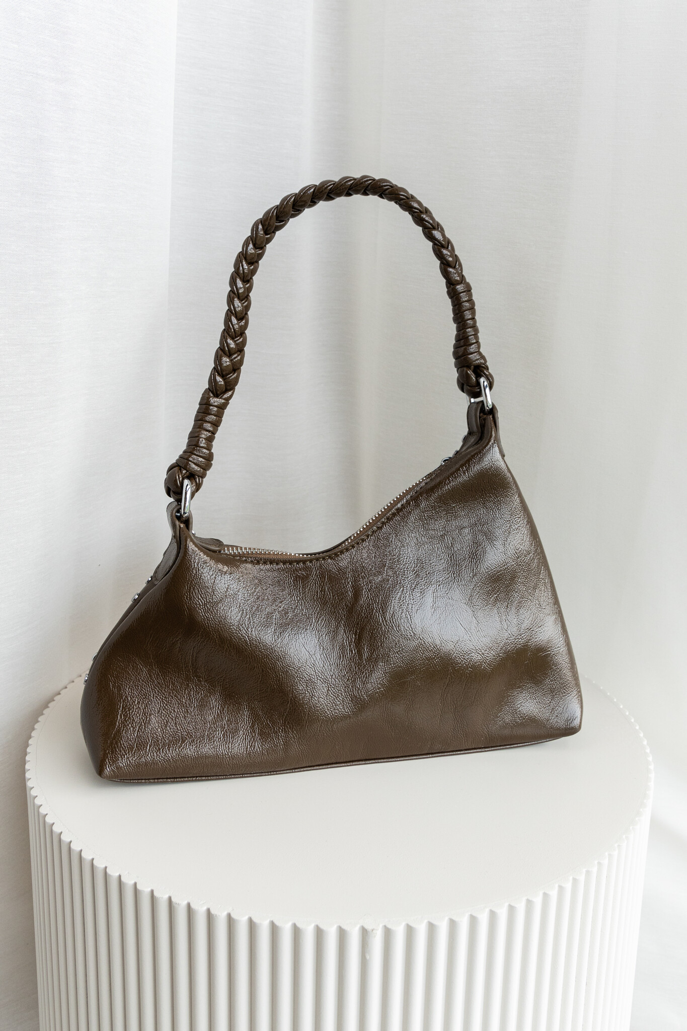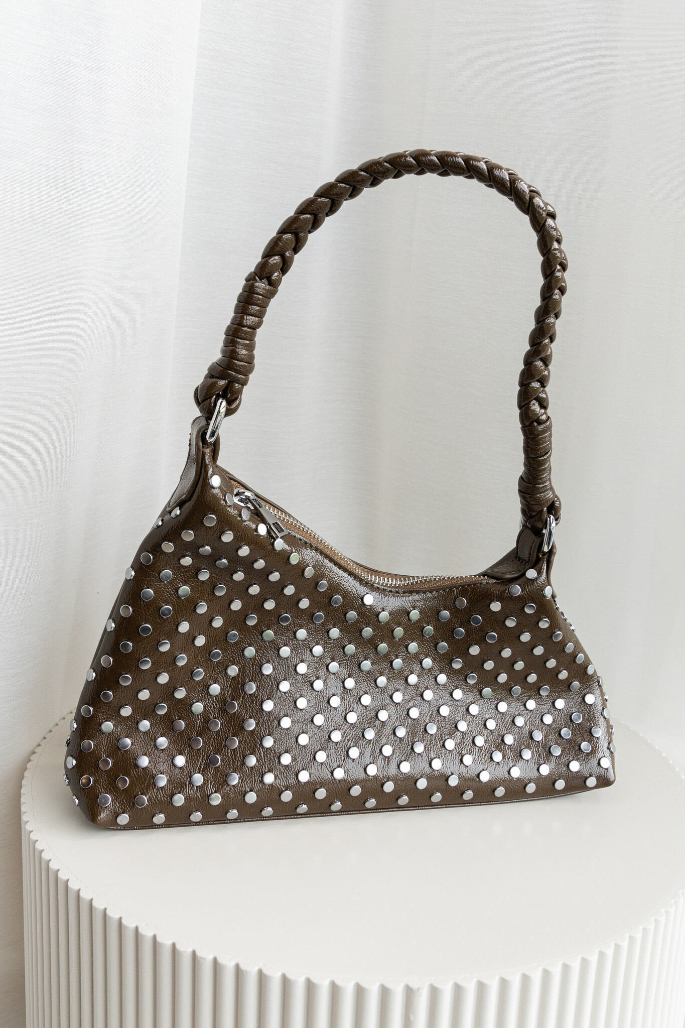 Maak een statement met dit schoudertasje! Gemaakt van glimmend imitatieleer en volledig versierd met zilveren studs voor een bold, edgy look. Het gevlochten handvat en de asymmetrische vorm geven een speelse look. Liever handsfree? Gebruik de bijgeleverde crossbody band. Perfect voor een avondje uit, festival of whenever you feel like turning heads.