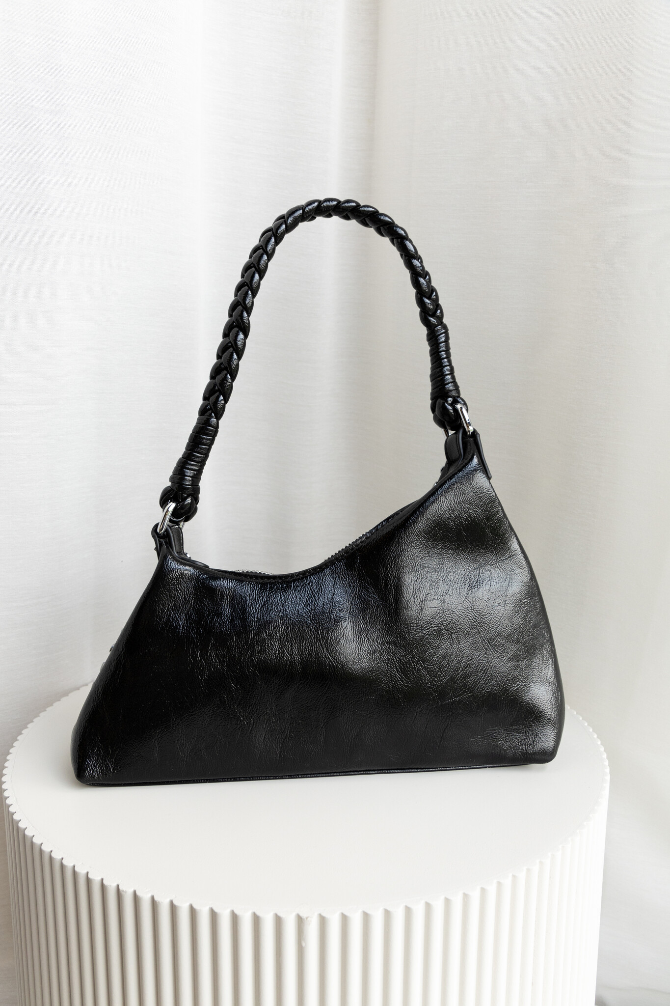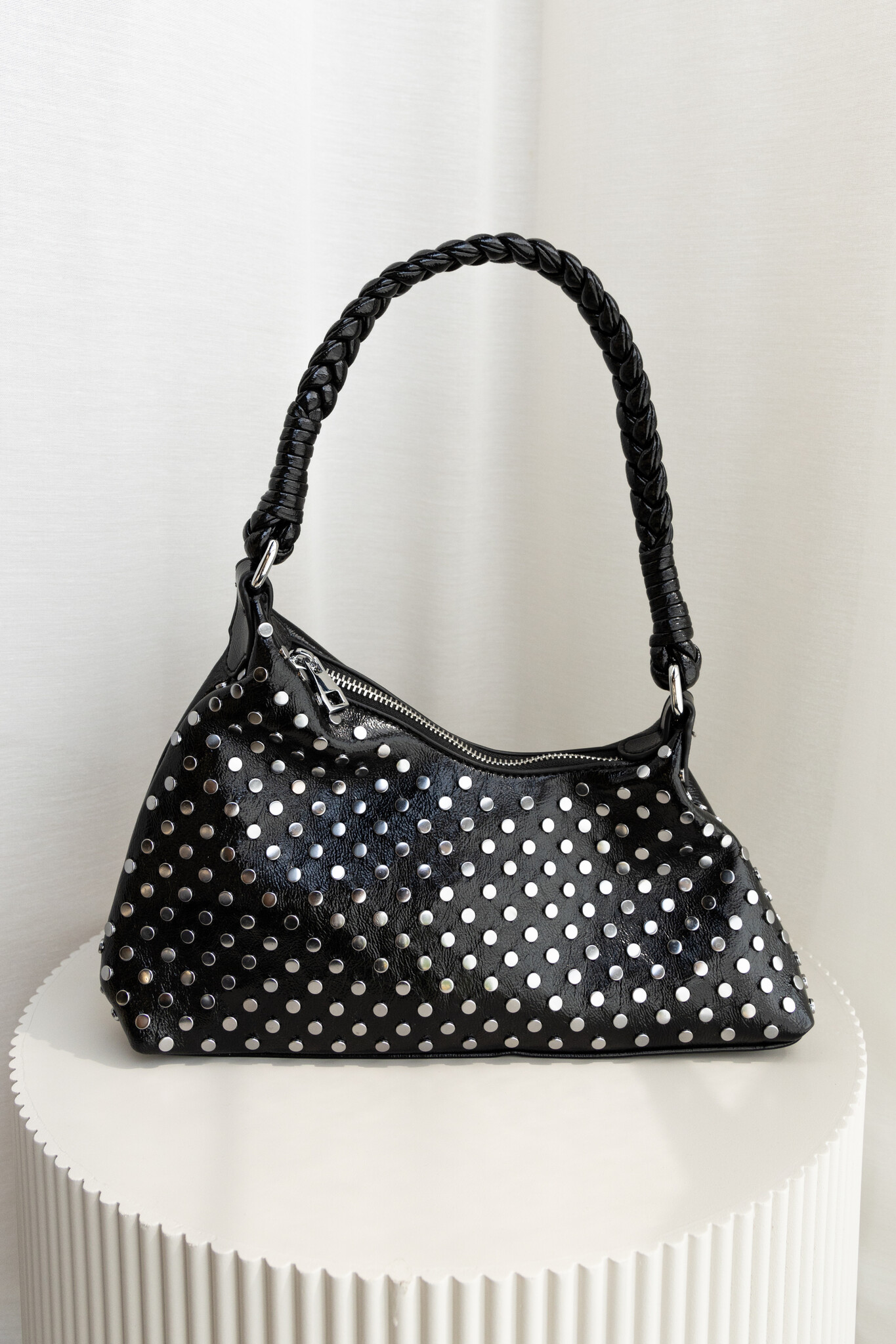 Maak een statement met dit zwarte schoudertasje! Gemaakt van glimmend imitatieleer en volledig versierd met zilveren studs voor een bold, edgy look. Het gevlochten handvat en de asymmetrische vorm geven een speelse look. Liever handsfree? Gebruik de bijgeleverde crossbody band. Perfect voor een avondje uit, festival of whenever you feel like turning heads.