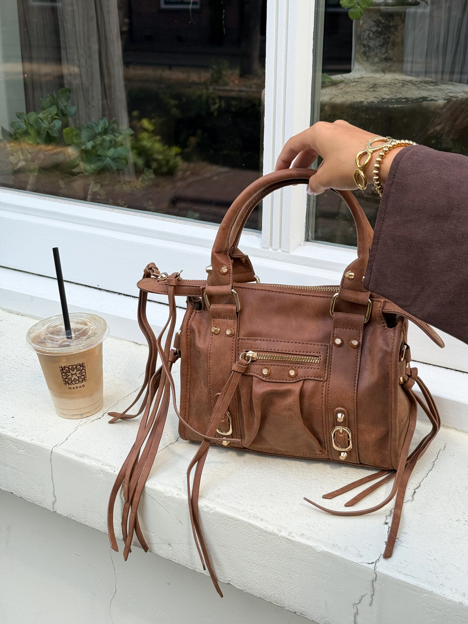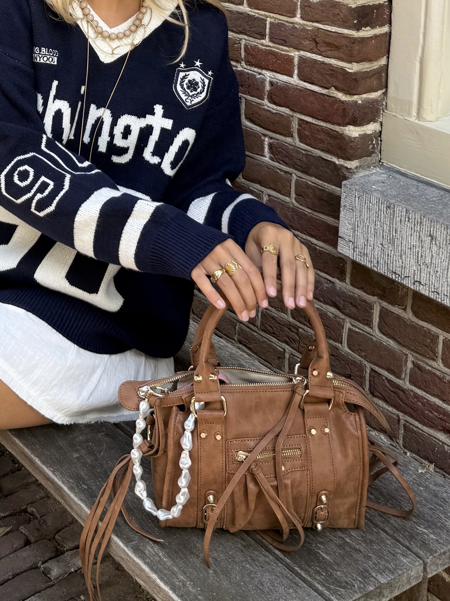 Stijlvolle tas in faux suède look met luxe gouden details. Voorzien van ritsvak aan de voorkant én binnenkant, plus extra hengsel om ook crossbody te dragen.