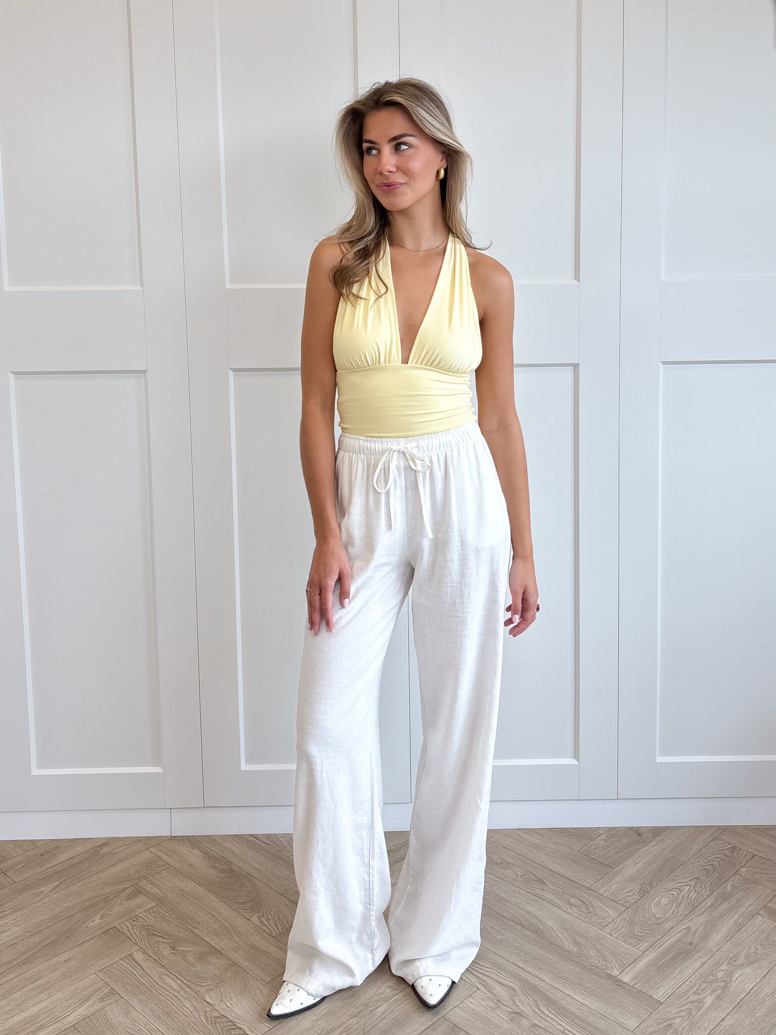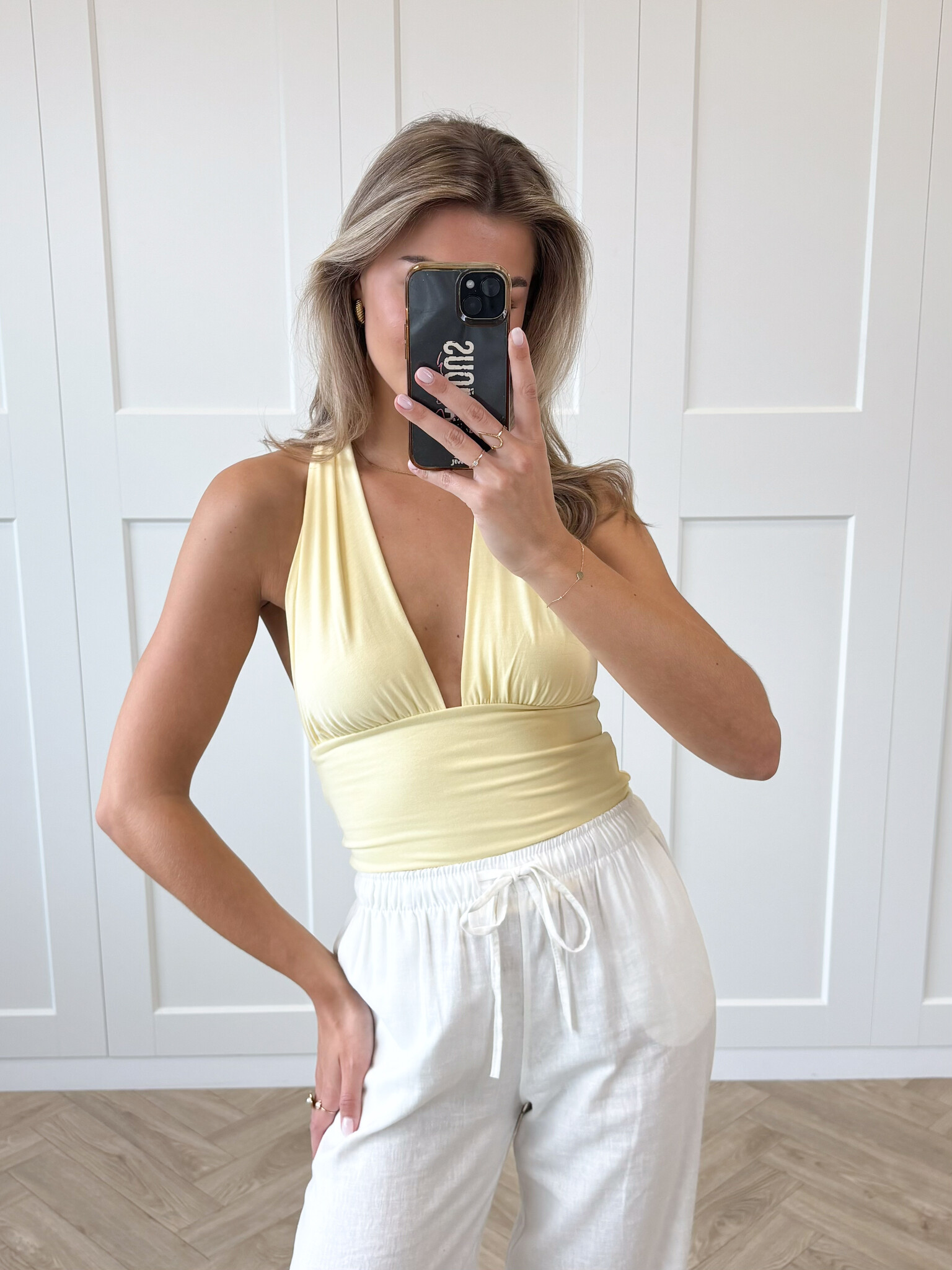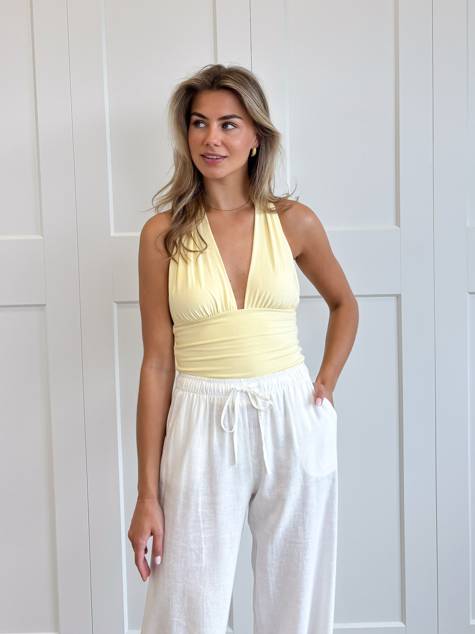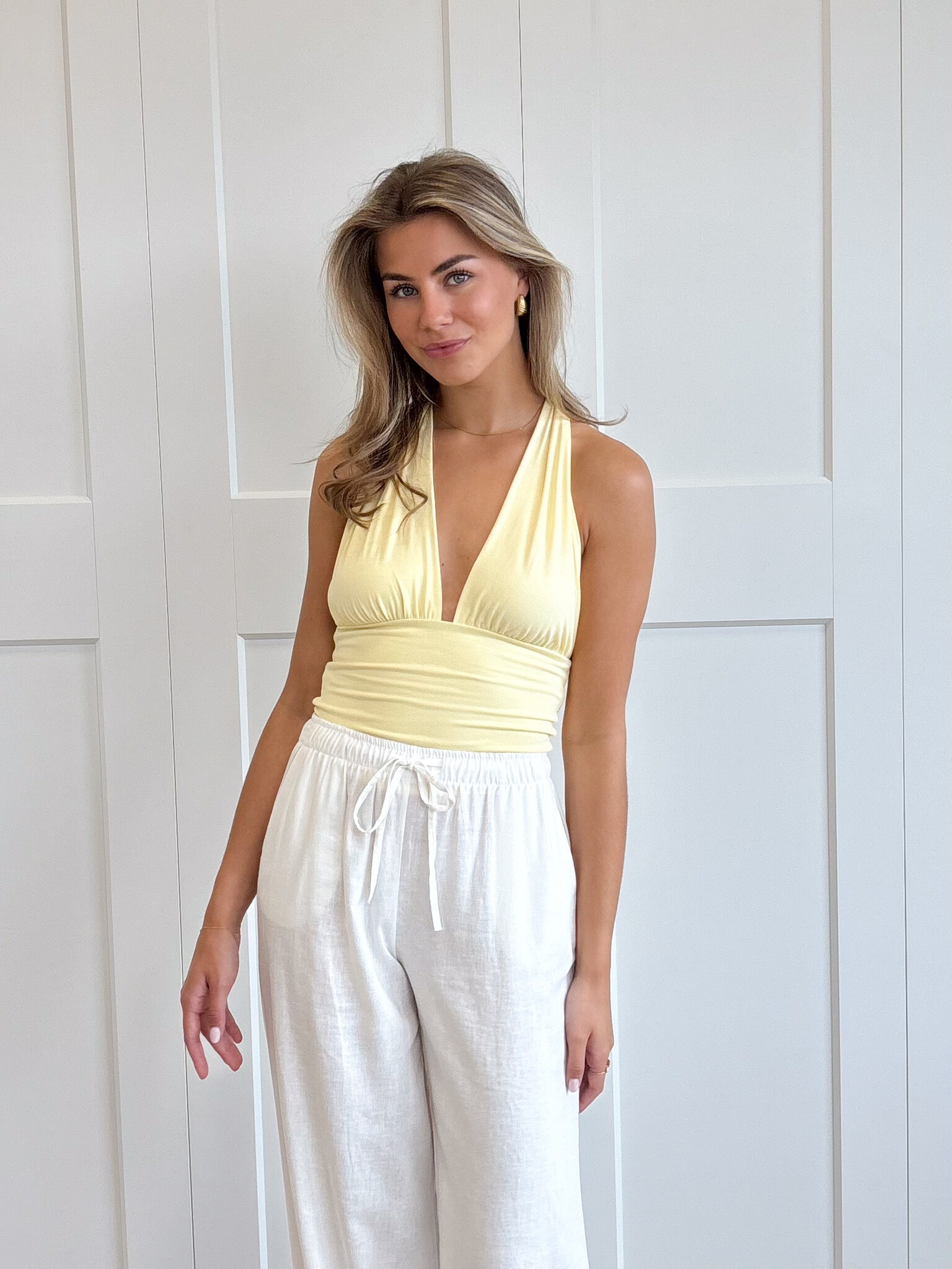 De Esmee haltertop is een must-have basic met een chique twist. De diepe V-hals en de fijne nekstrik accentueren je schouders, terwijl de zachte, licht stretchy stof zorgt voor een comfortabele, nauwsluitende pasvorm. Combineer Esmee met een baggy jeans en sneakers voor een festival outfit, of draag haar onder een blazer voor een dinner night.