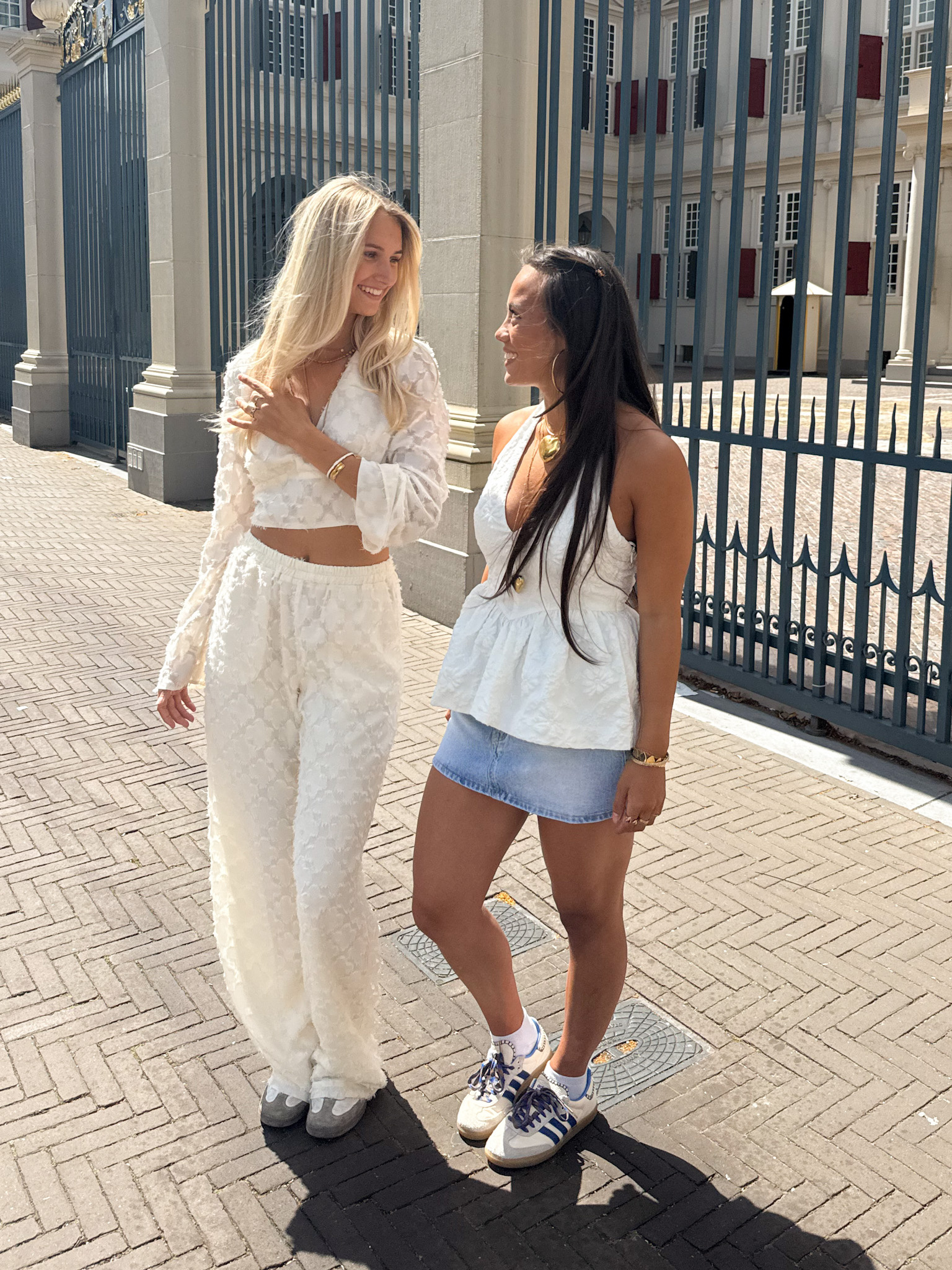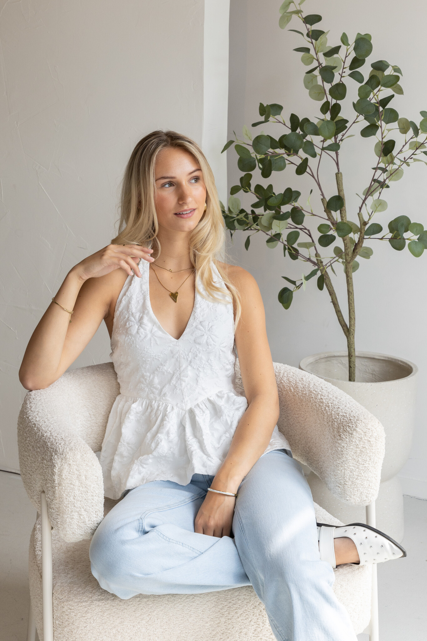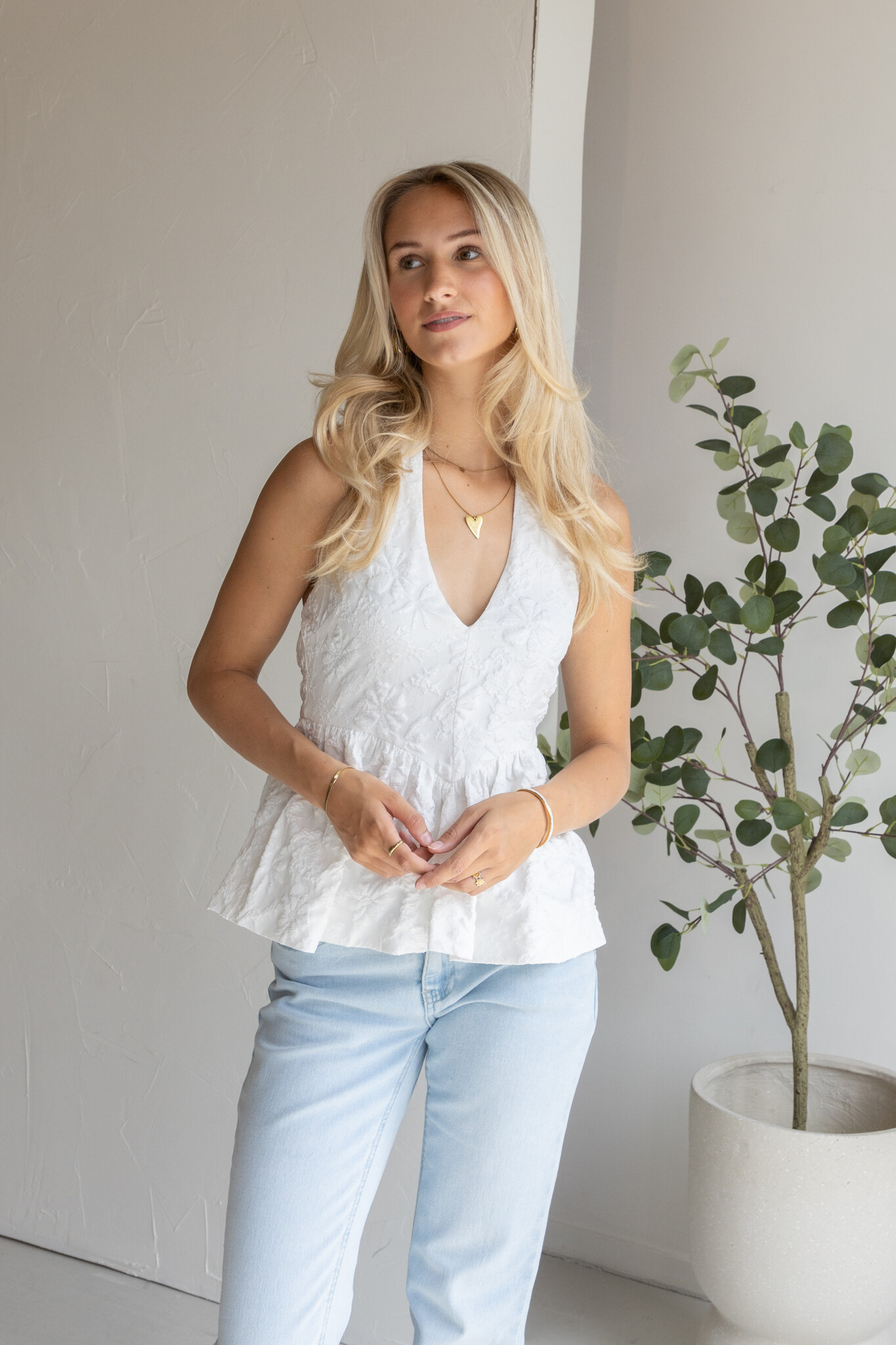 De Fleur top is jouw nieuwe zomerse favoriet. Gemaakt van een luchtige stof met subtiele bloemenstructuur. De haltertop heeft een V-hals en een stretchy rug. Door het peplum effect bij de taille krijgt de top een speelse vorm. Combineer haar met een high-waisted short of een wijde jeans voor een casual look, of met een rok en sandalen voor een date night.