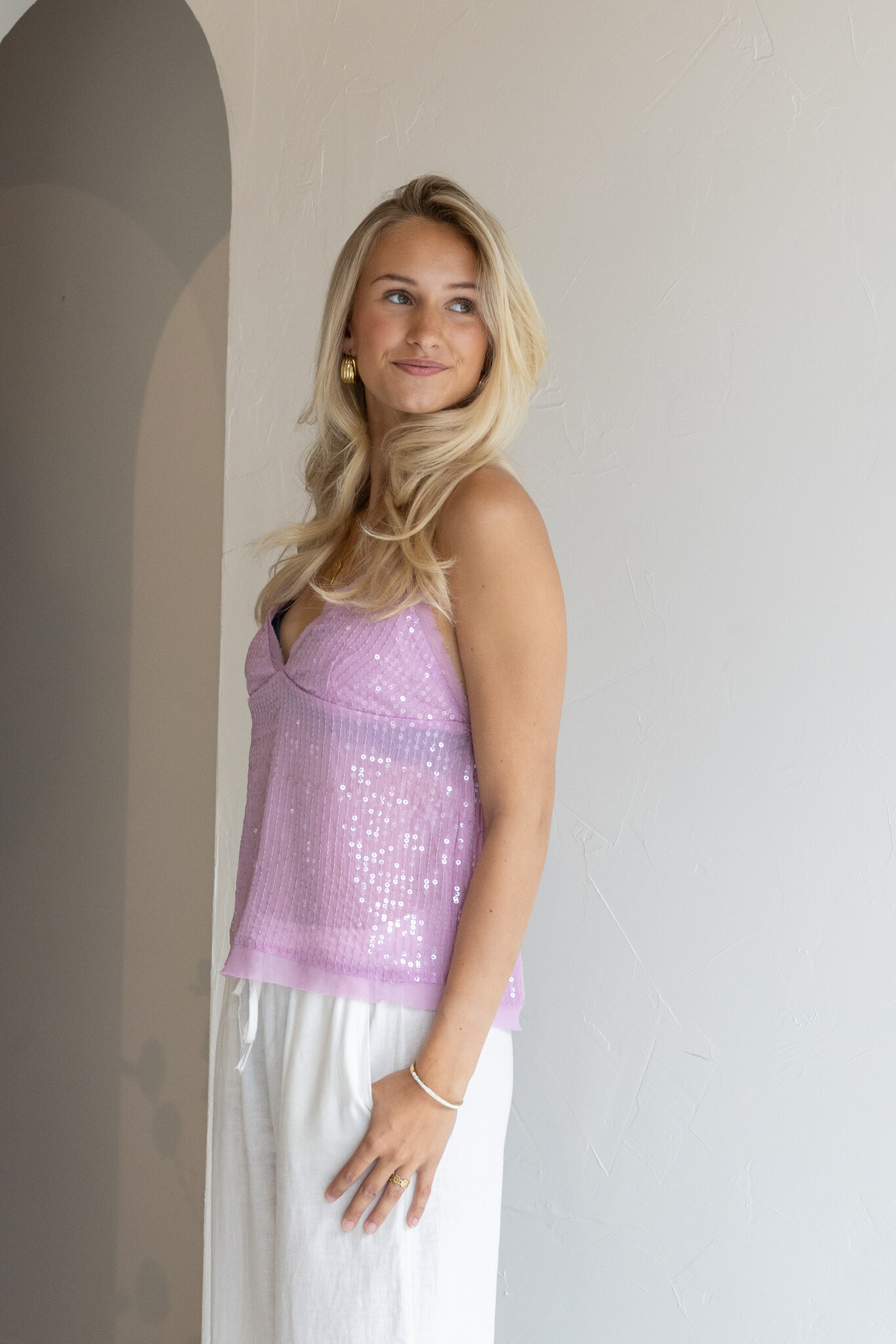 Top Julie is gemaakt om in te shinen. Deze paarse haltertop is versierd met pailletten voor een extra spark. De diepe V-hals en de dunne bandjes die je in je nek knoopt zorgen voor een open rug. De stof is licht doorschijnend, wat zorgt voor een luchtig en speels effect, perfect voor festivals! Stijl de top met een denim short, chunky boots en zonnebril voor een edgy look.