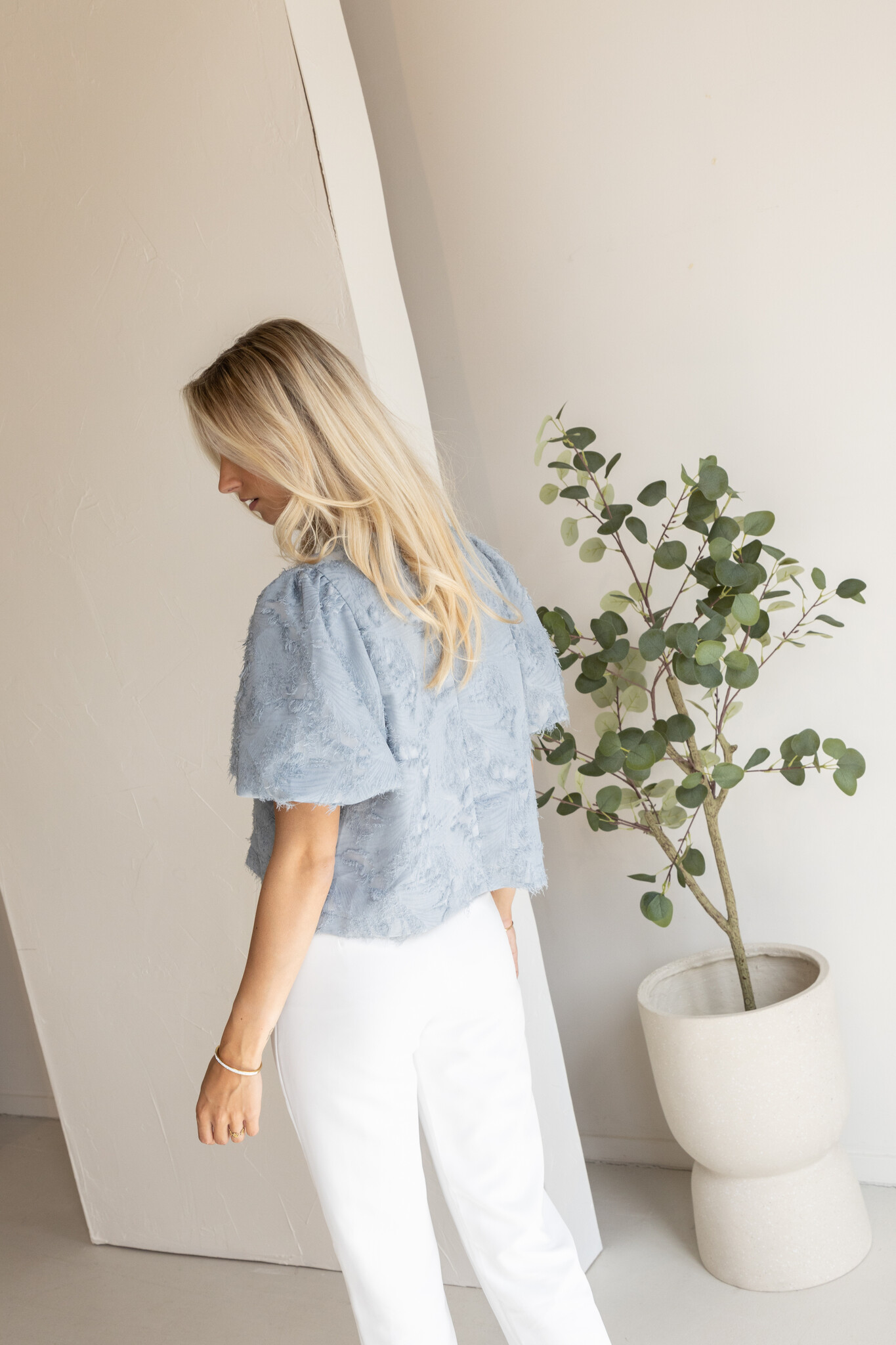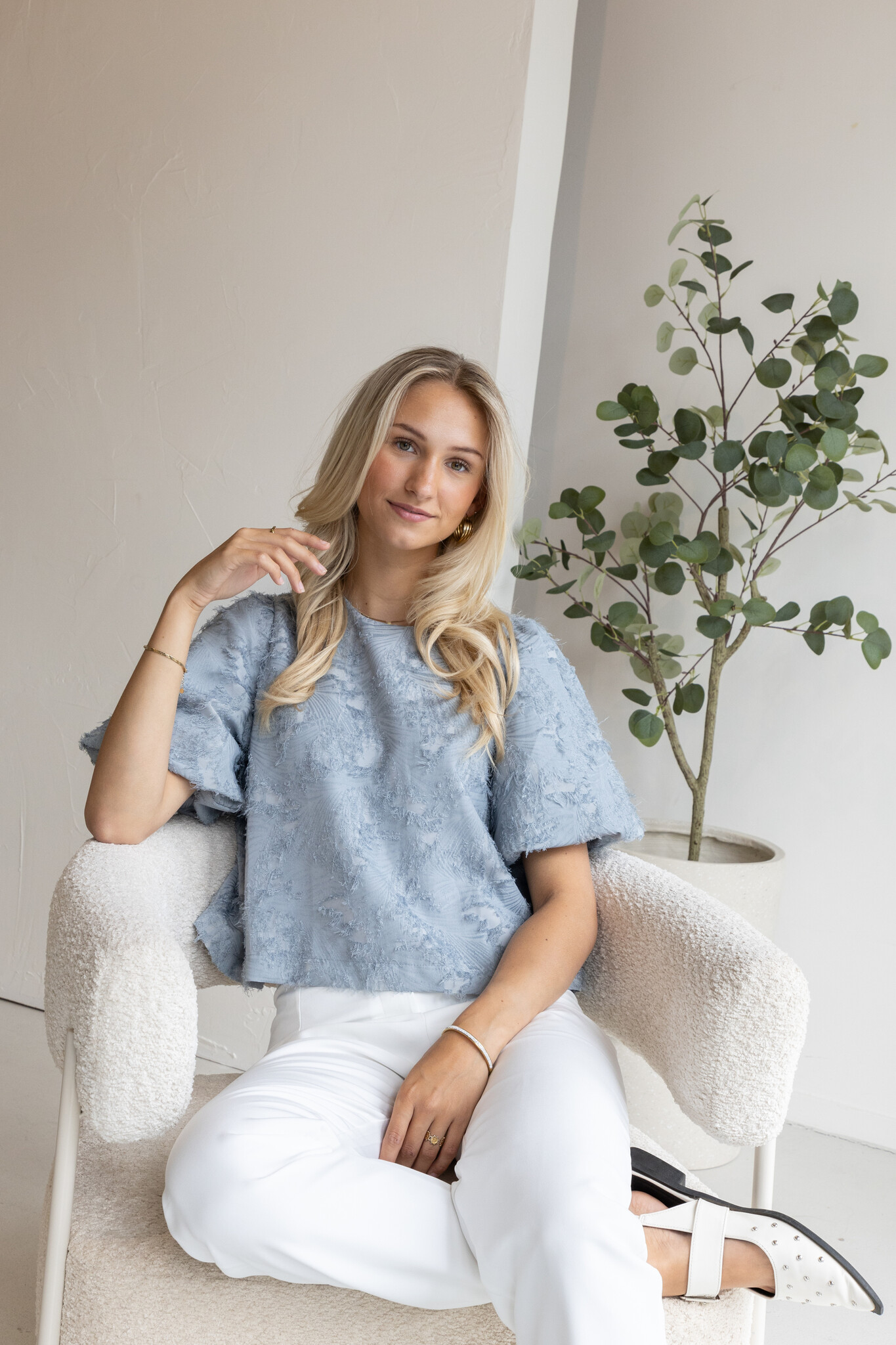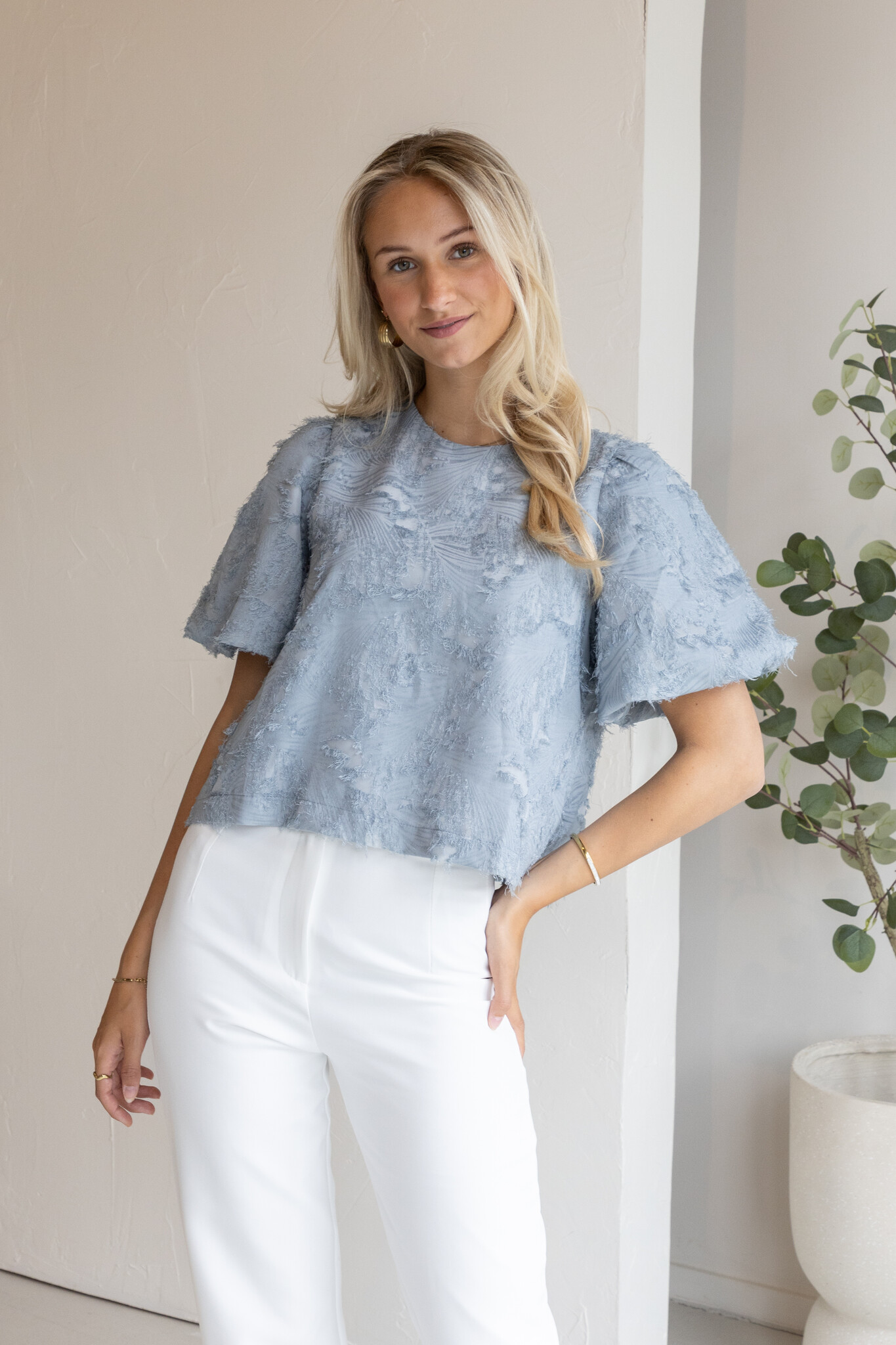Deze blauwe top is alles wat je zoekt voor een frisse, zomerse look. Gemaakt van een bijzondere structuurstof met een zachte, fluffy finish. De top heeft korte, subtiele pofmouwtjes en een soepele pasvorm. Perfect voor een zomerfeest, etentje of als speelse touch bij een jeans of maxi-rok. Voeg sieraden en een sandaaltje toe en je bent klaar om te stralen. Comfortabel, stijlvol en net even anders.