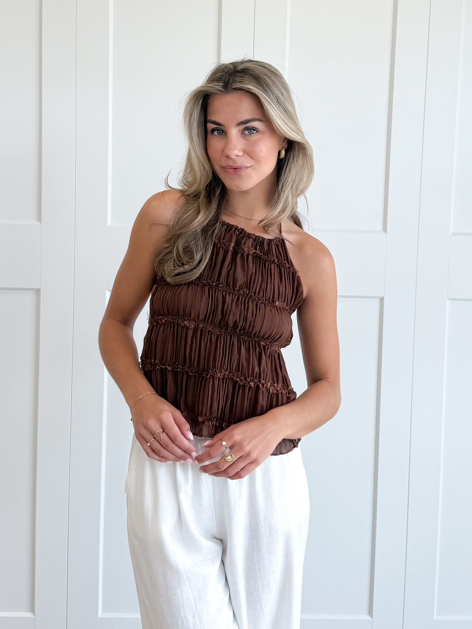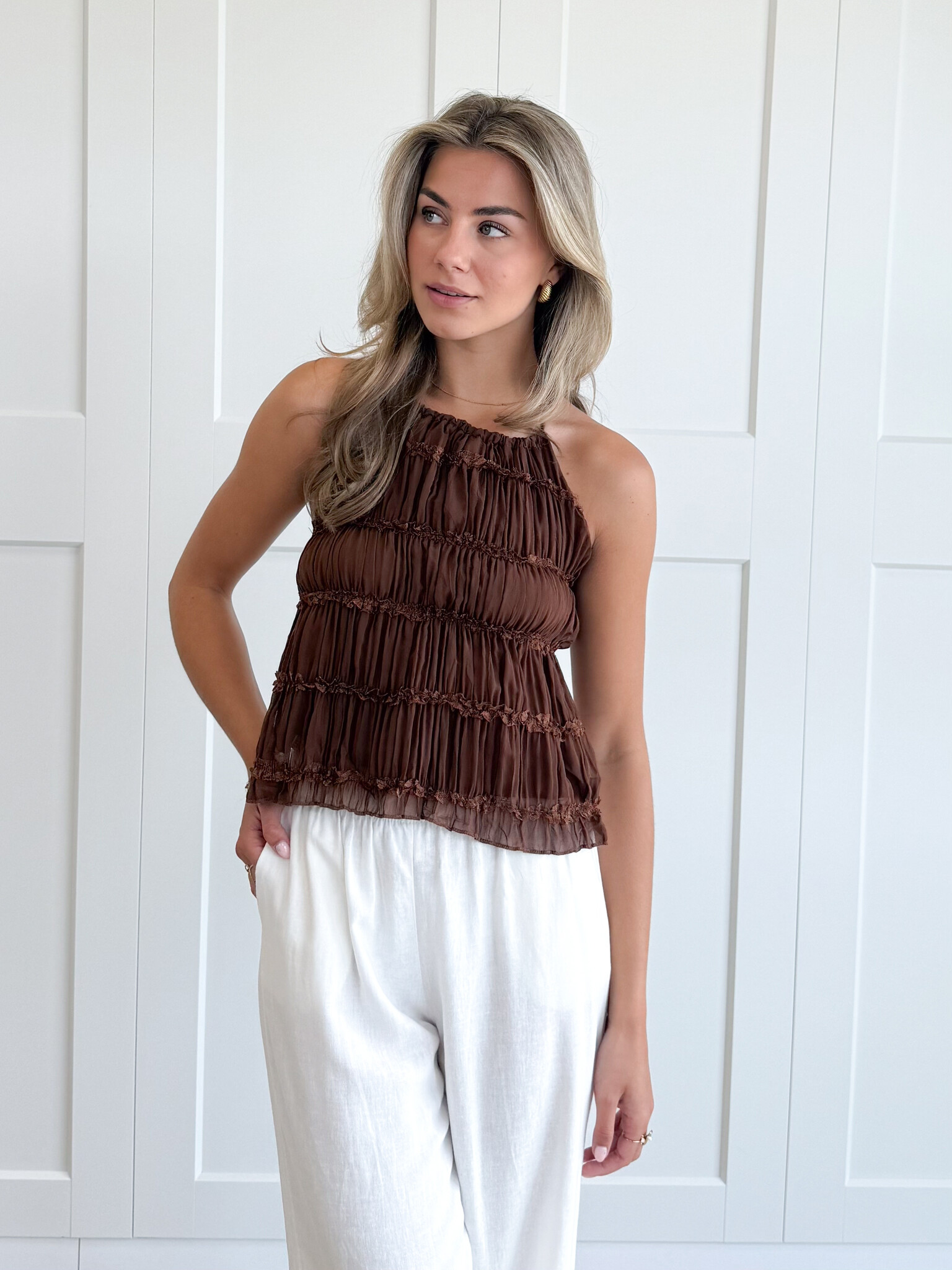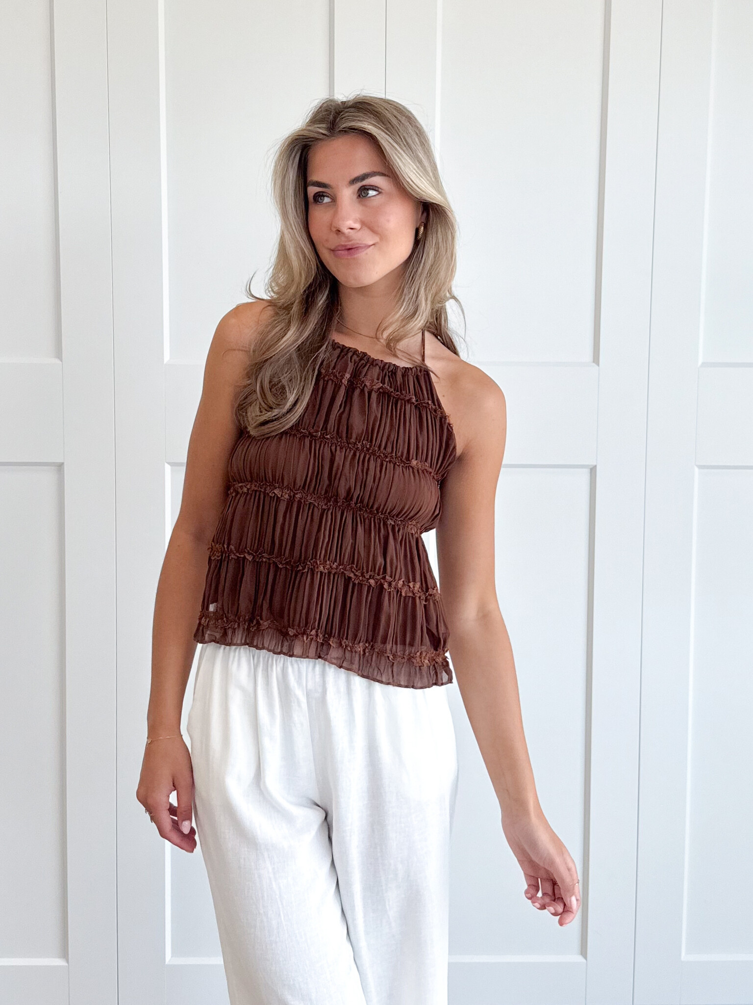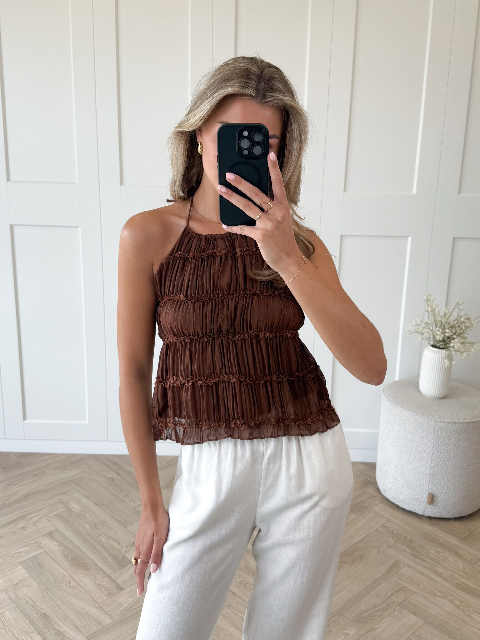 Op zoek naar een top die zowel speels als stijlvol is? Deze bruine top heeft het allemaal: zachte ruches, een mooie geraffelde structuur én een open achterkant voor een verrassende twist. De top sluit perfect aan op je lichaam door de lichte stretch en zorgt voor een flatterende, vrouwelijke fit.