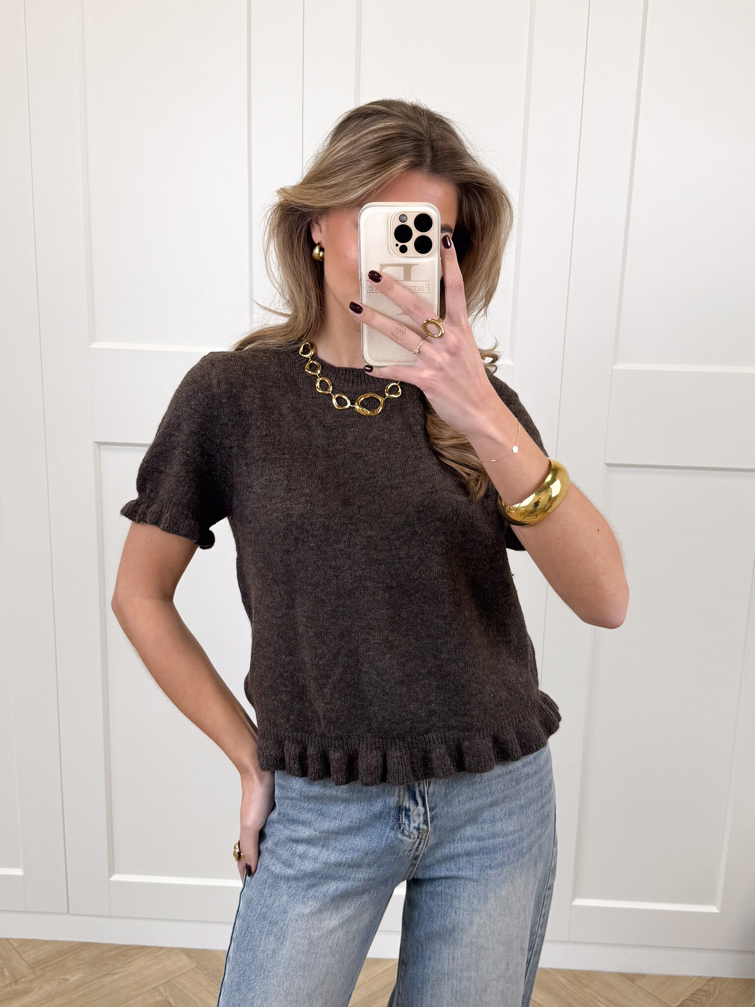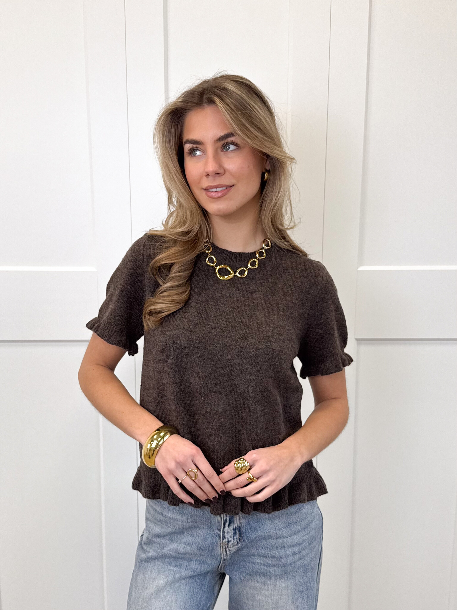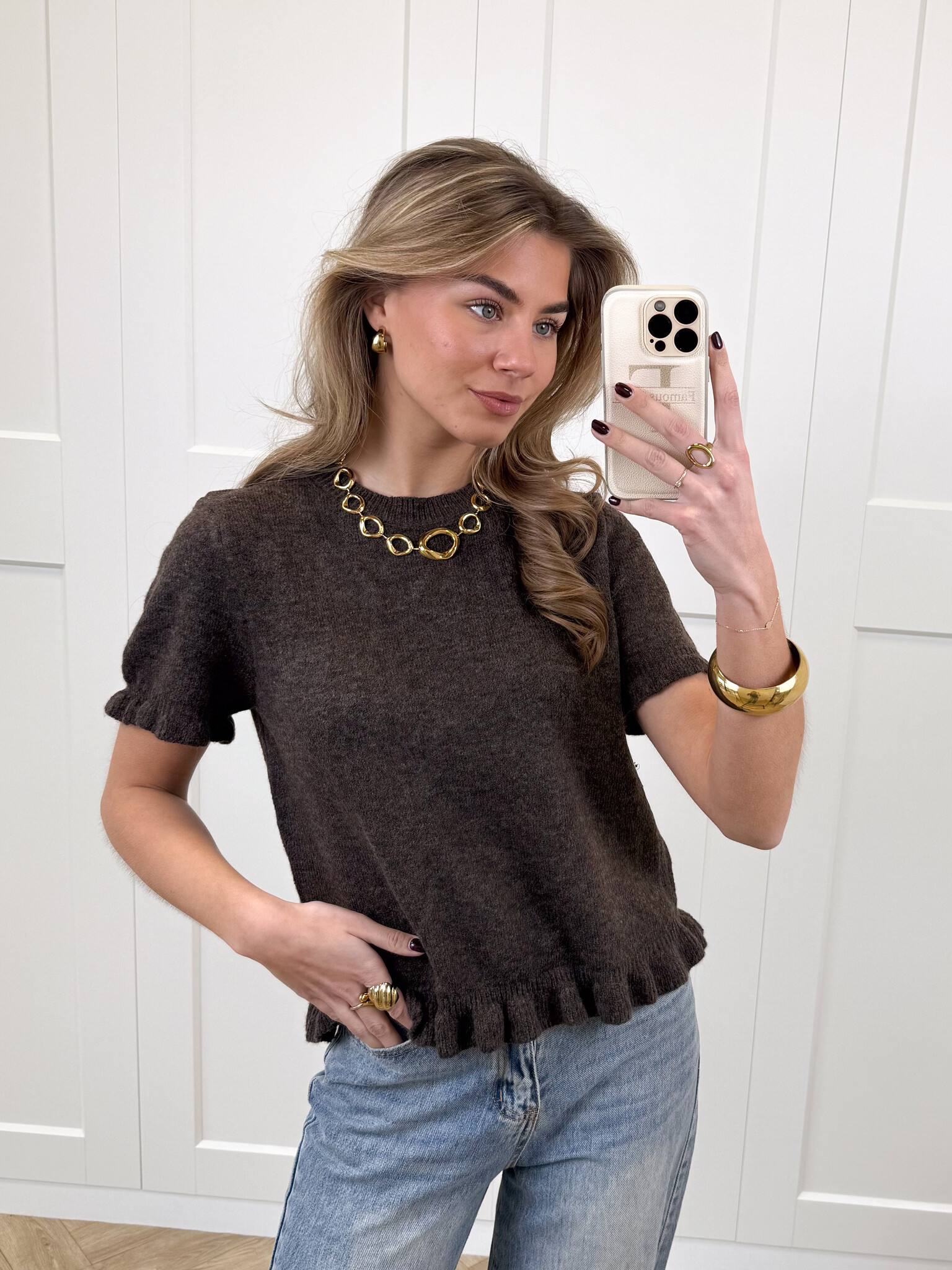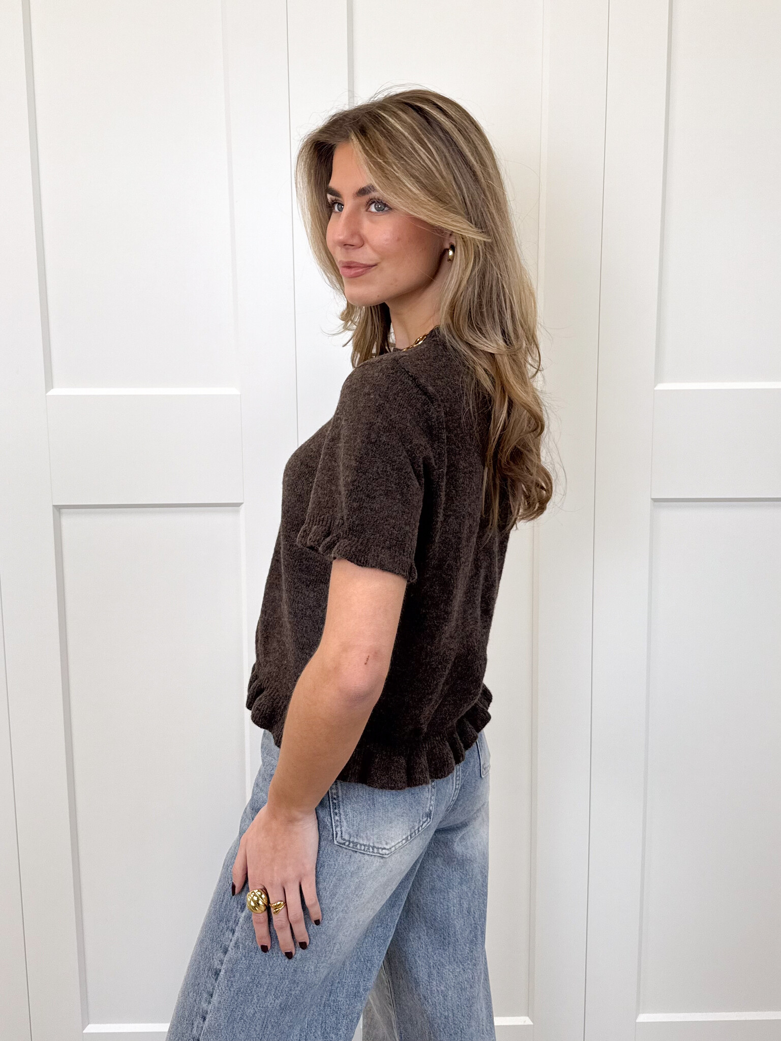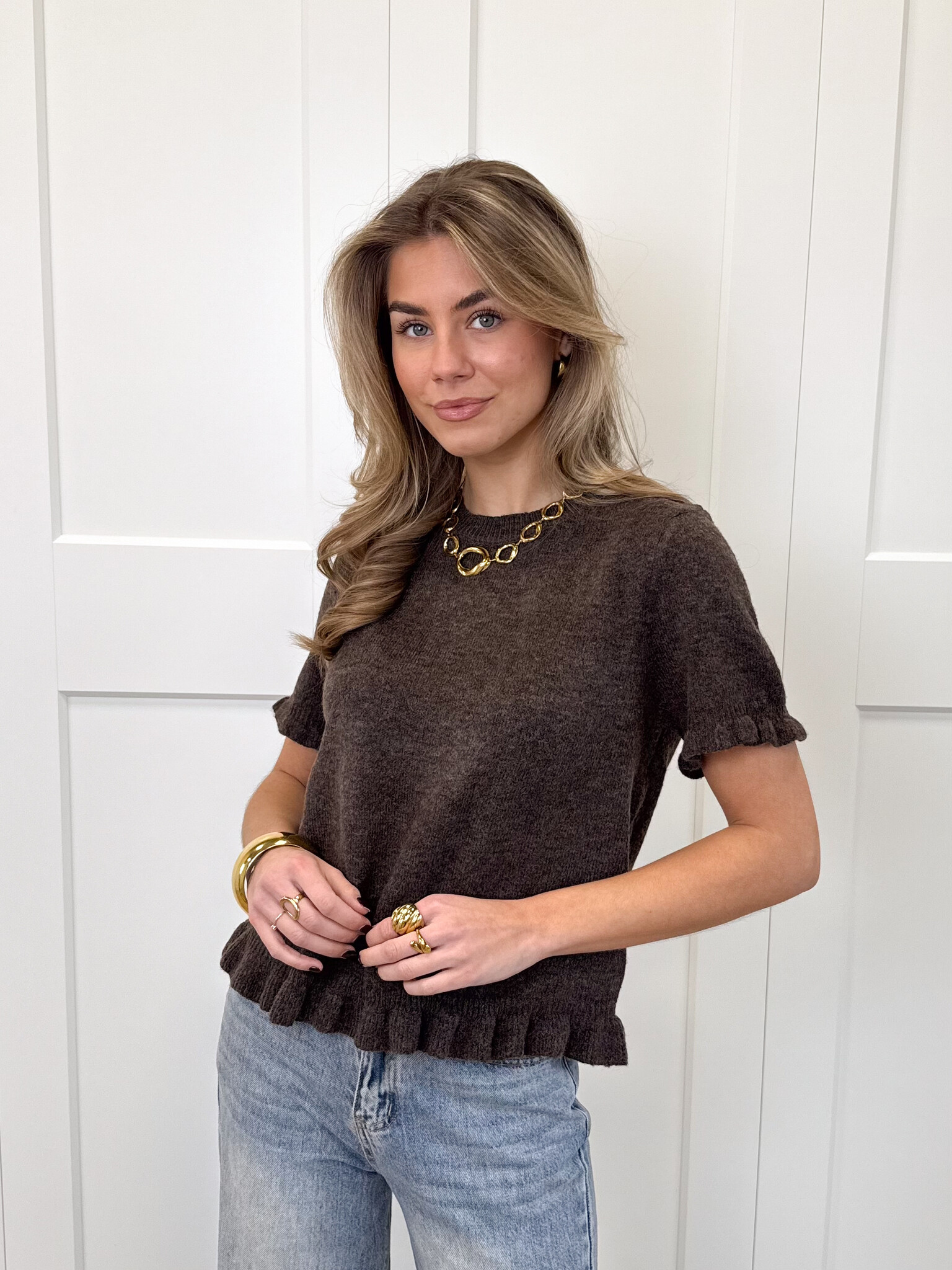Dit bruine topje is een echte must-have voor een girly en cozy garderobe. De zachte wolmix voelt heerlijk warm en comfortabel aan, perfect voor frisse dagen. De fijne, verfijnde details aan de onderkant en bij de mouwen geven het topje een romantische en vrouwelijke touch, waardoor het net dat beetje extra krijgt. De pasvorm valt mooi en is makkelijk te combineren met een jeans, rok of pantalon voor een casual chic look. Ideaal voor een dagje shoppen, een koffiedate of een ontspannen dag op school of werk. Dit topje straalt warmte, comfort en stijl uit en laat je er moeiteloos girly en verzorgd uitzien.