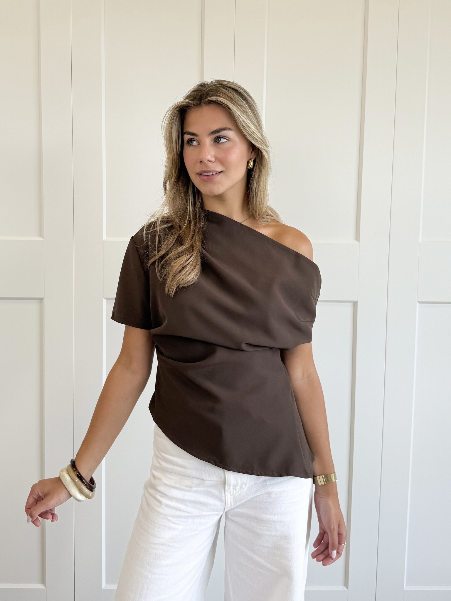 Op zoek naar een top die zowel speels als stijlvol is? Deze one off shoulder top heeft het allemaal: een ritssluiting en ook iets aan stretch. De top sluit perfect aan op je lichaam door de lichte stretch en zorgt voor een flatterende, vrouwelijke fit.