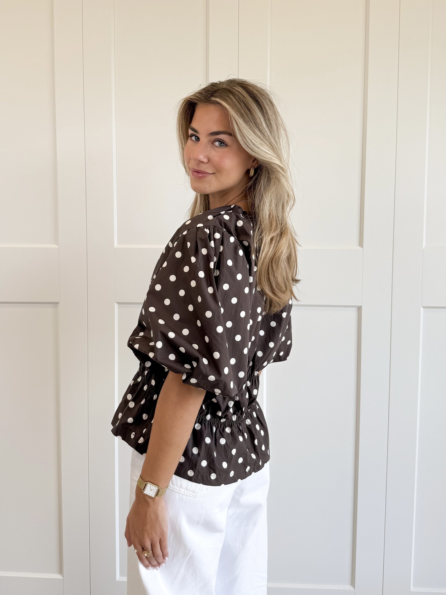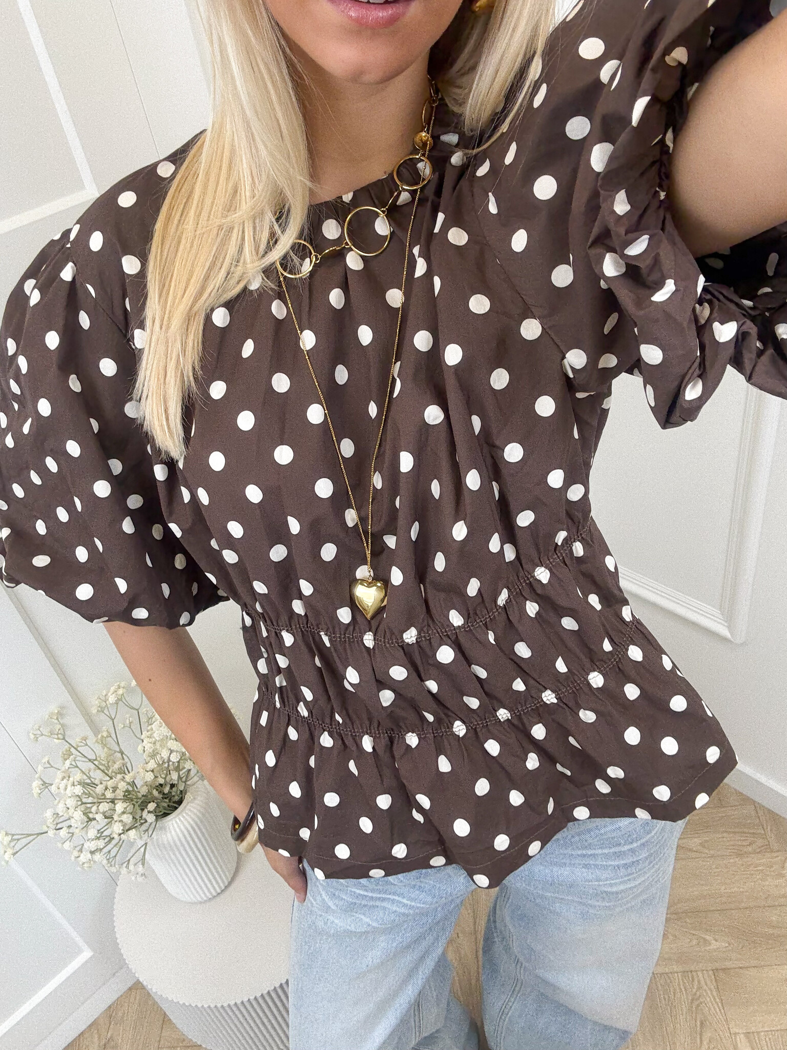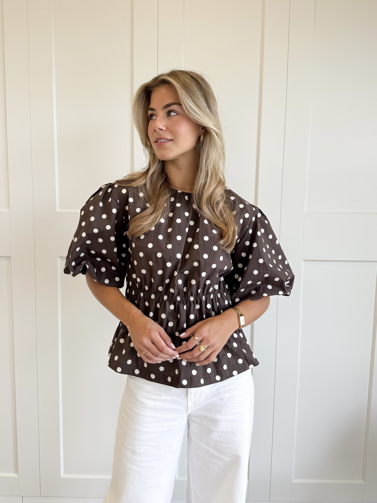 Deze bruine top met beige polkadots/ witte stippen is een elegante en vrouwelijke toevoeging aan je garderobe. Het getailleerde model en de oversized korte pofmouwen en hoge boothals geven een speelse uitstraling. Perfect te combineren met een jeans voor een casual look of een rok voor een nettere outfit.
