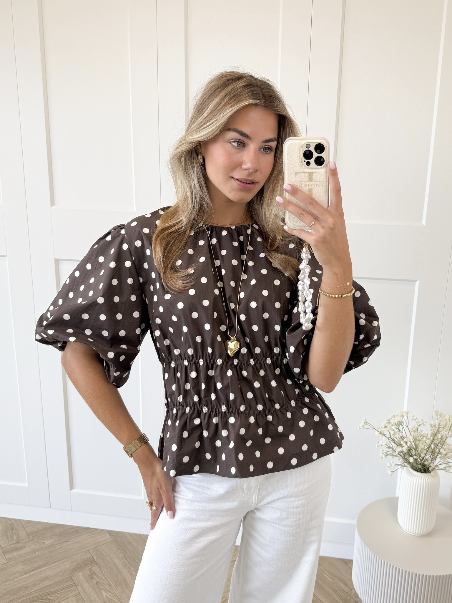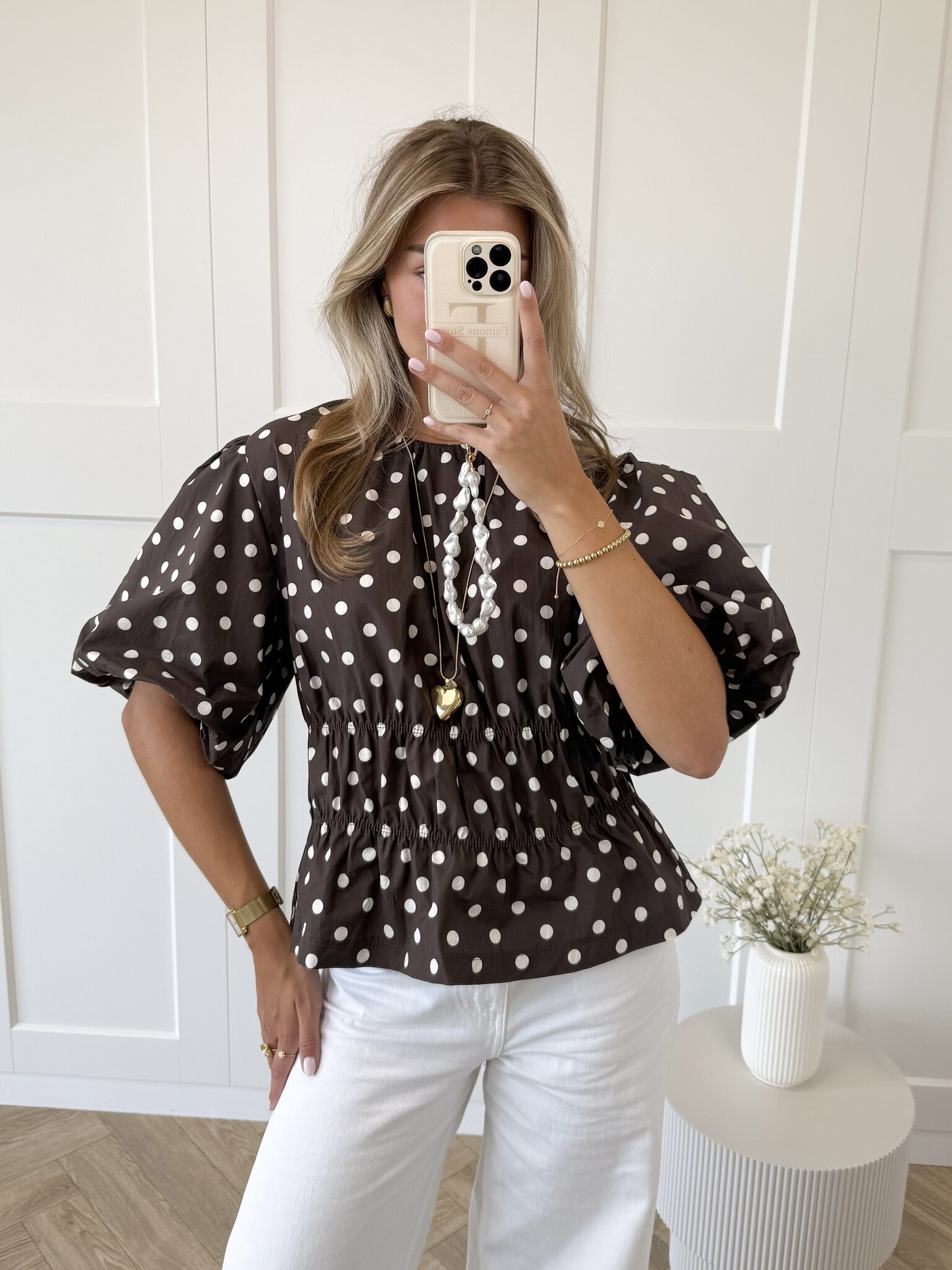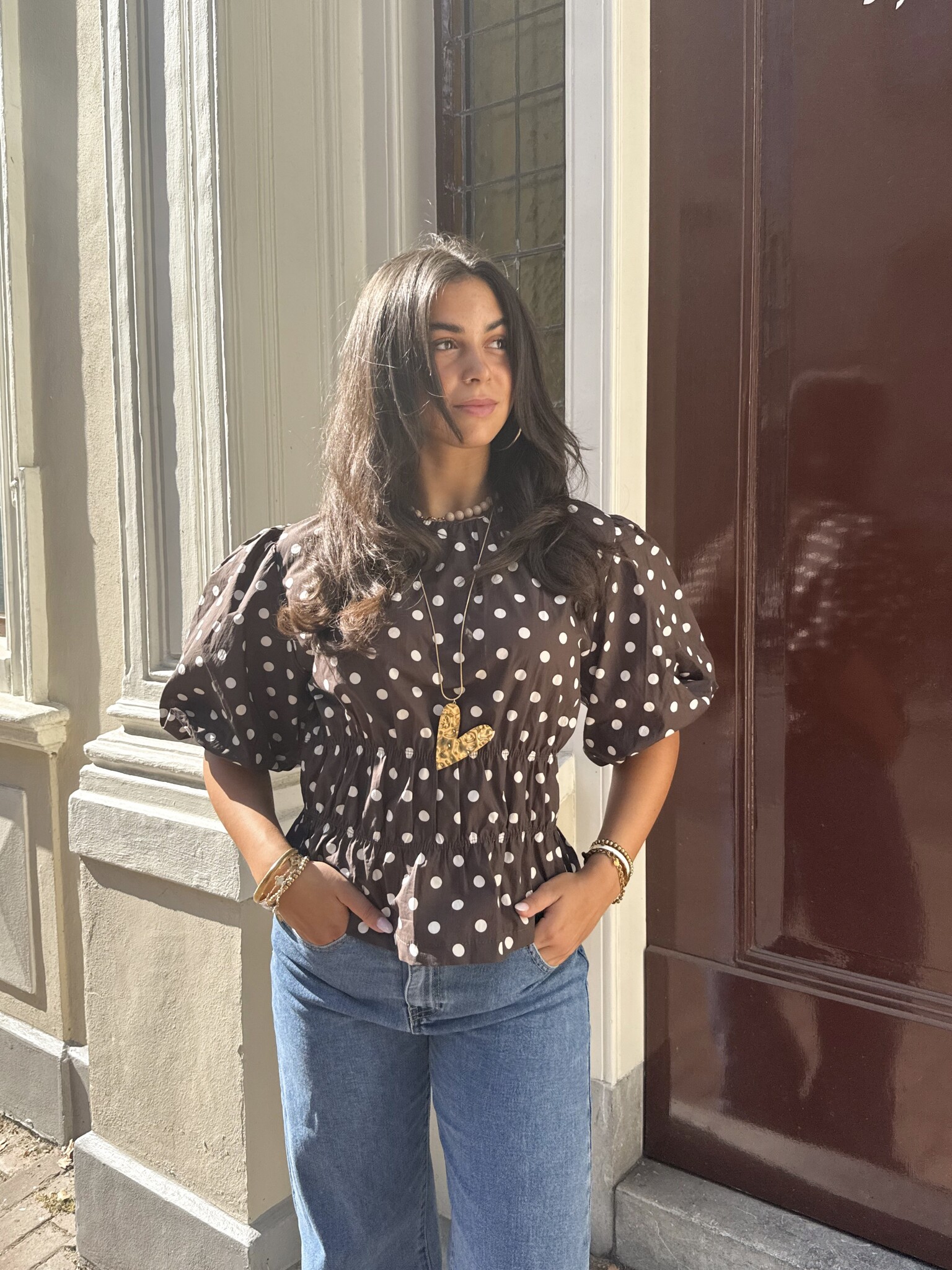 Deze bruine top met beige polkadots/ witte stippen is een elegante en vrouwelijke toevoeging aan je garderobe. Het getailleerde model en de oversized korte pofmouwen en hoge boothals geven een speelse uitstraling. Perfect te combineren met een jeans voor een casual look of een rok voor een nettere outfit.