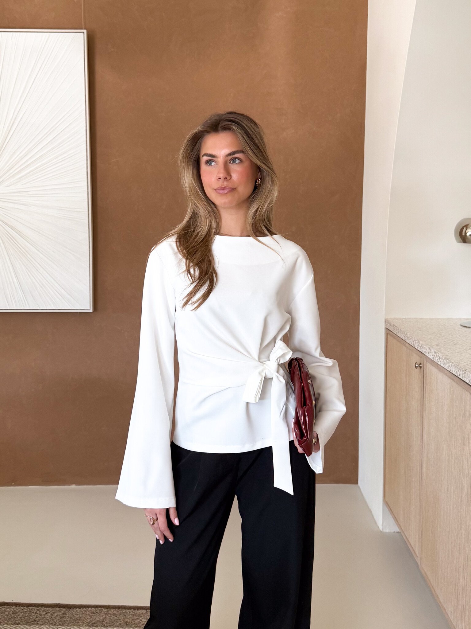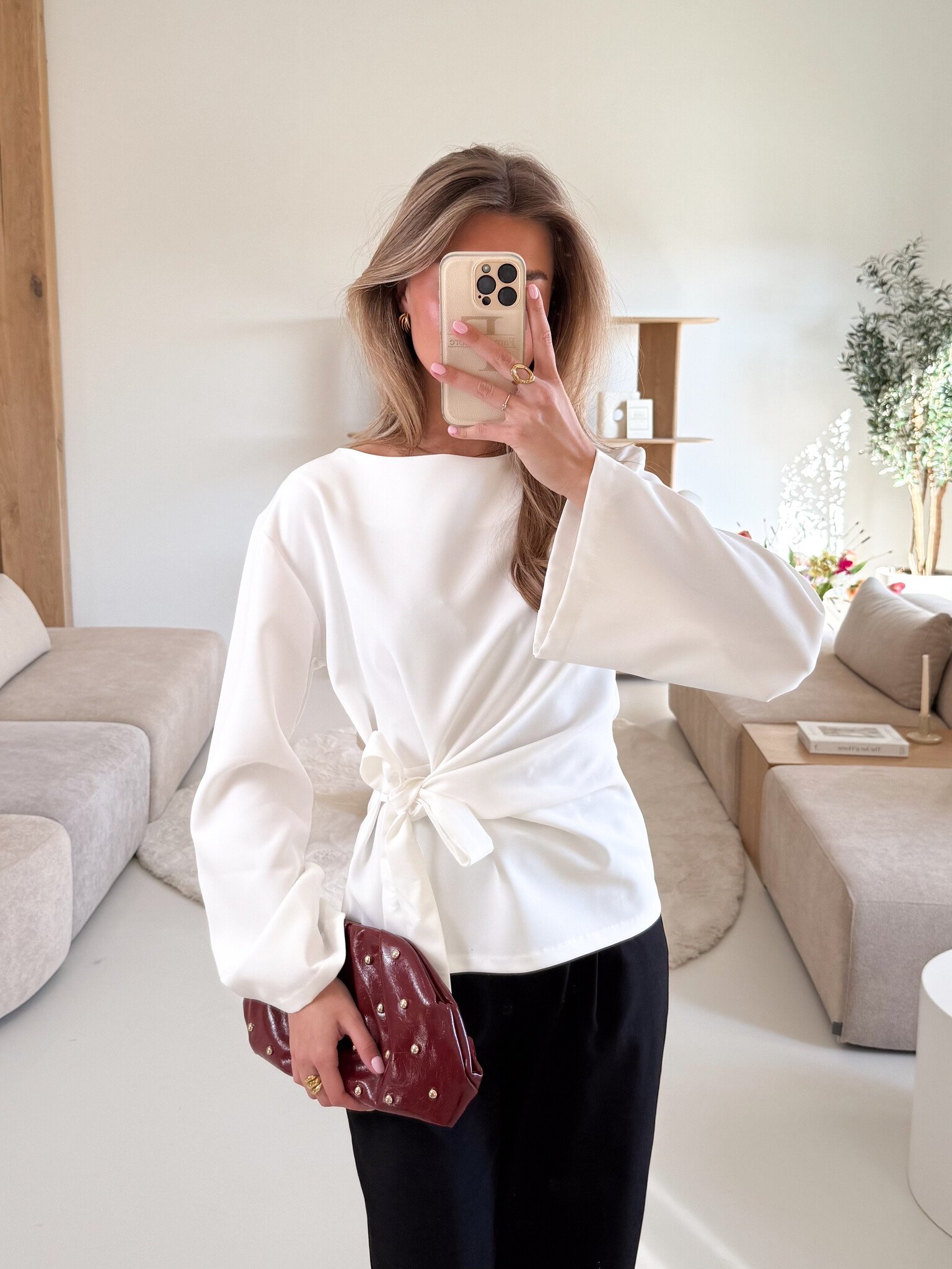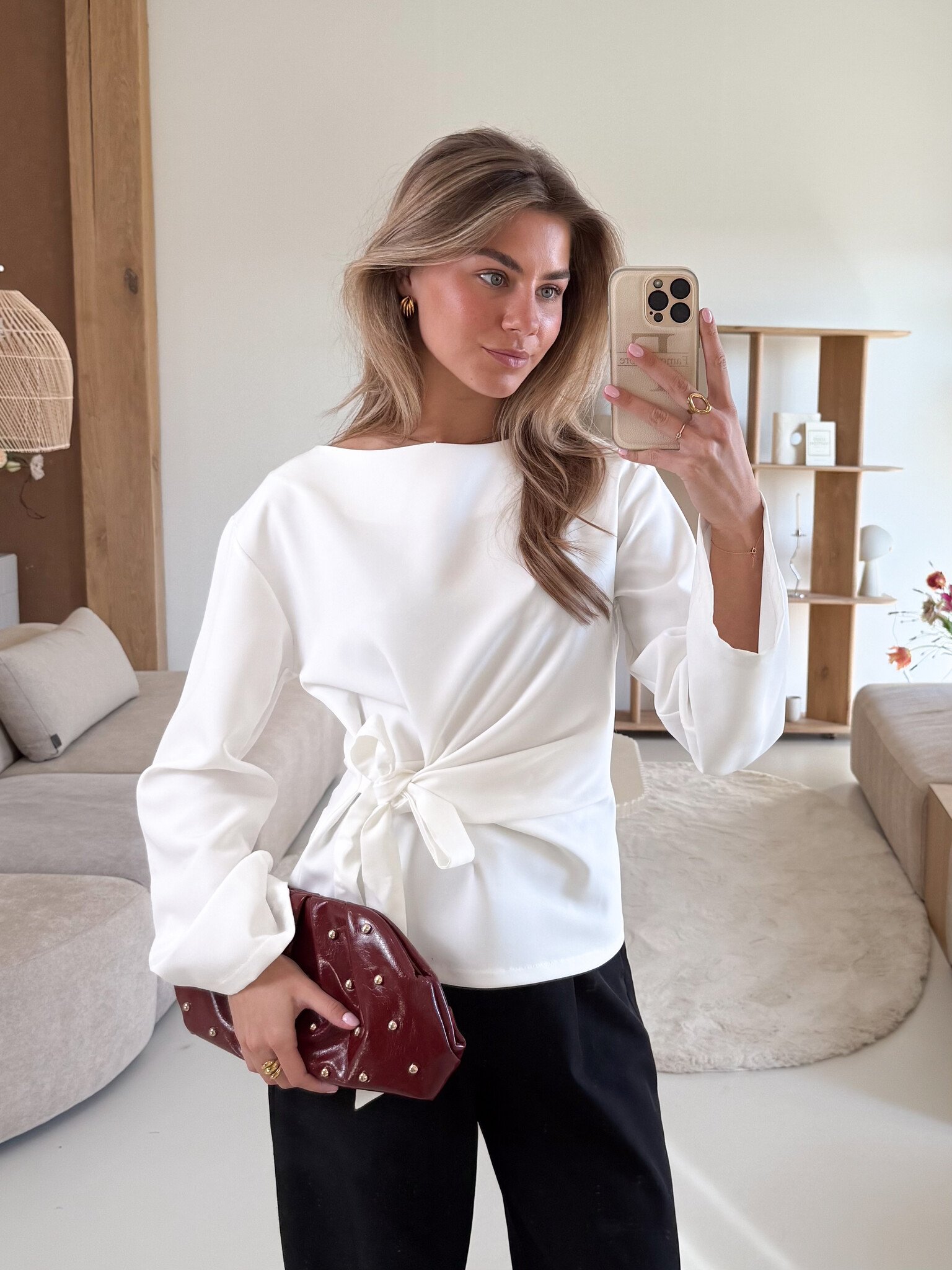 Deze top straalt pure elegantie uit en is een echte eyecatcher in je garderobe. De lange mouwen en getailleerde pasvorm zorgen voor een vrouwelijke en flatterende look. Het extra stofdetail dat je kunt strikken geeft een speels maar chic accent en laat je taille mooi uitkomen. De zachte stof voelt comfortabel aan en maakt het item fijn om zowel overdag als ’s avonds te dragen. Combineer met een pantalon voor een classy vibe of met een jeans voor een meer casual maar stijlvolle outfit. Perfect voor etentjes, feestjes of een date night waar je net iets meer wilt shinen ✨