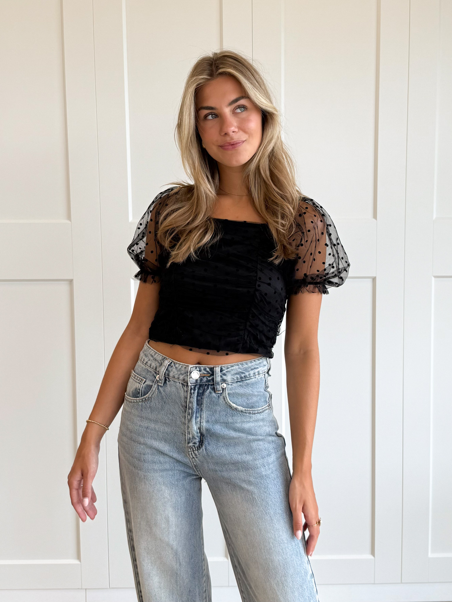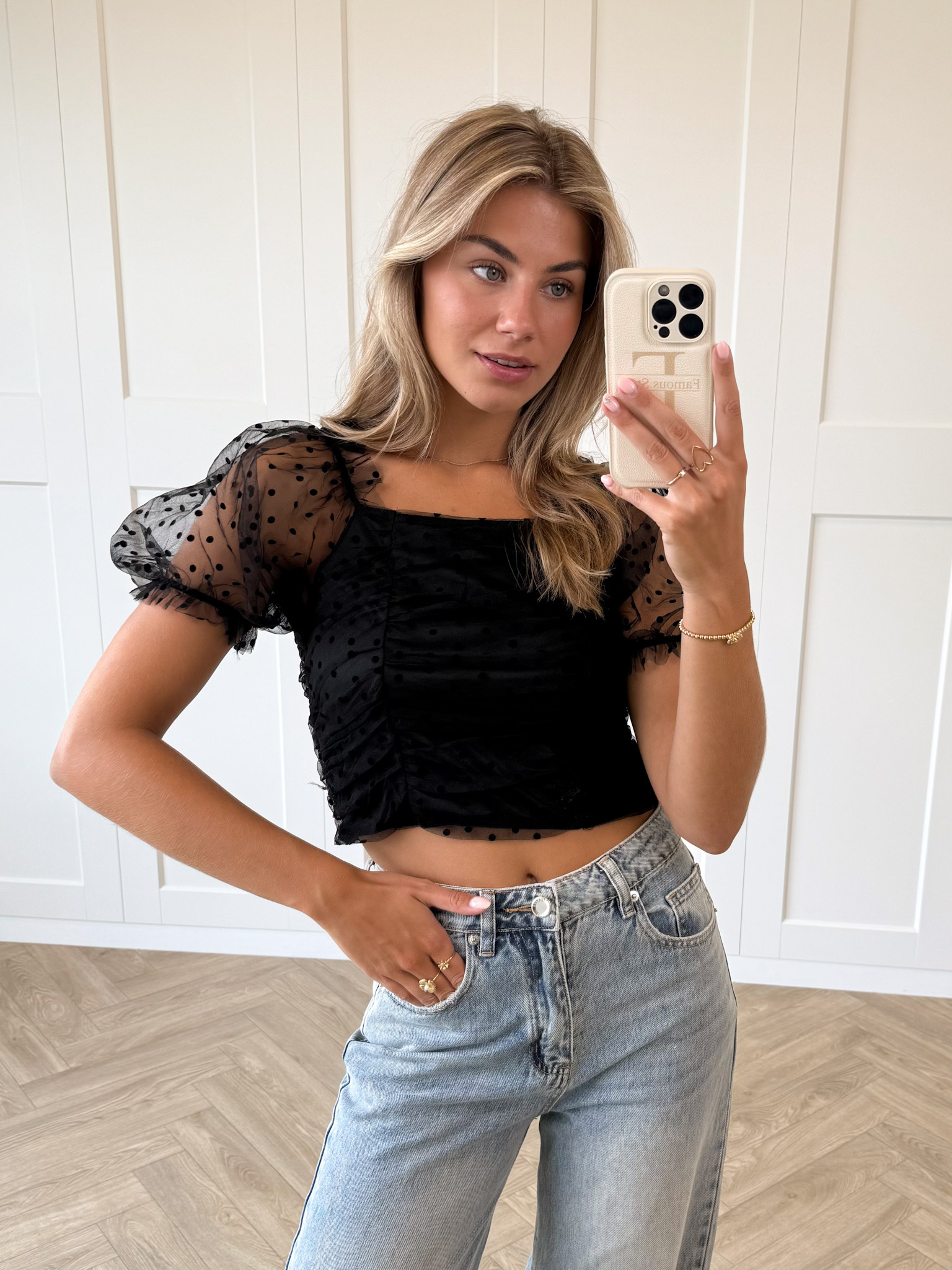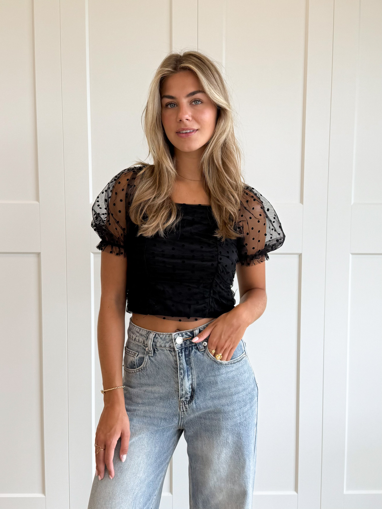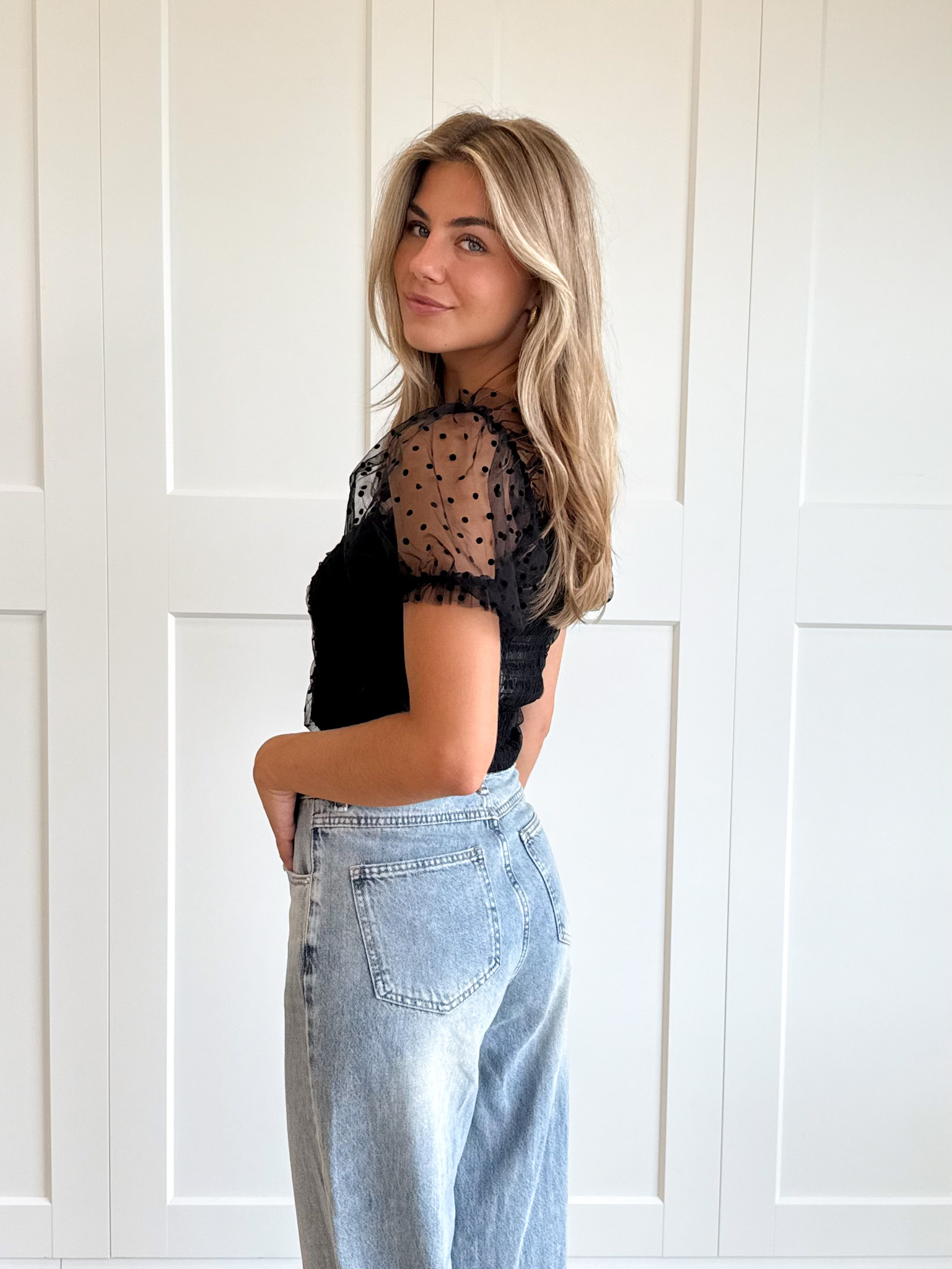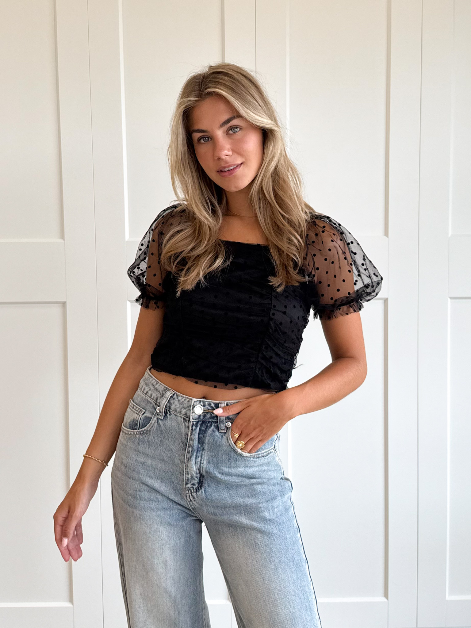 De Livia Top heeft speelse pofmouwtjes van transparante tule en zijn versierd met subtiele polkadots. De body heeft een gesmokte structuur die mooi aansluit en super stretchy zit dankzij de elastische rug. Combineer deze top met een wijde jeans of een chique rok en je bent ready voor een avond uit of een zomerse borrel. Romantisch, stijlvol en comfy tegelijk!