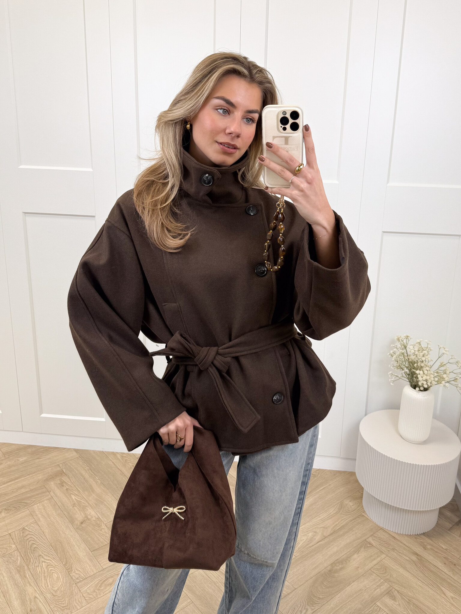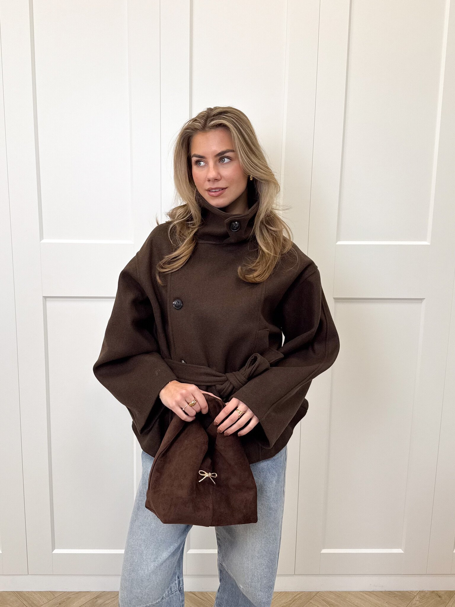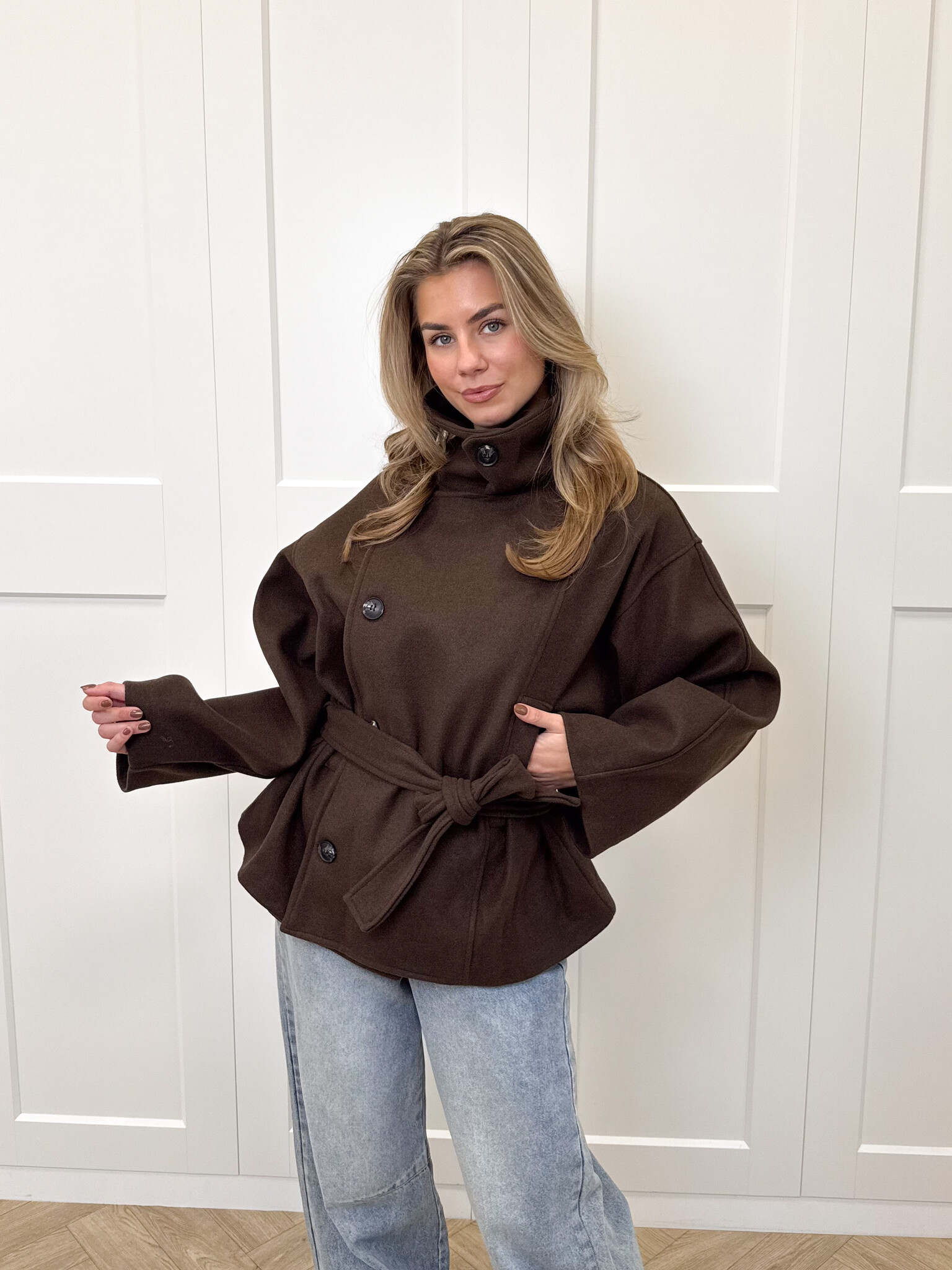 Deze korte wollen trenchcoat is de perfecte mix tussen warm, stijlvol en super vrouwelijk. De hoge kraag zorgt voor een chique uitstraling én extra warmte op koude dagen. De klassieke knoopsluiting en het ceintuur in de taille geven je silhouette een mooie shape, terwijl de praktische zakken de jas zowel elegant als functioneel maken. Dankzij de kortere lengte is hij ideaal om te combineren met jeans, pantalons of een rok van casual tot office chic. Of je nu onderweg bent naar school, werk of een city stroll, deze coat maakt elke outfit moeiteloos classy.