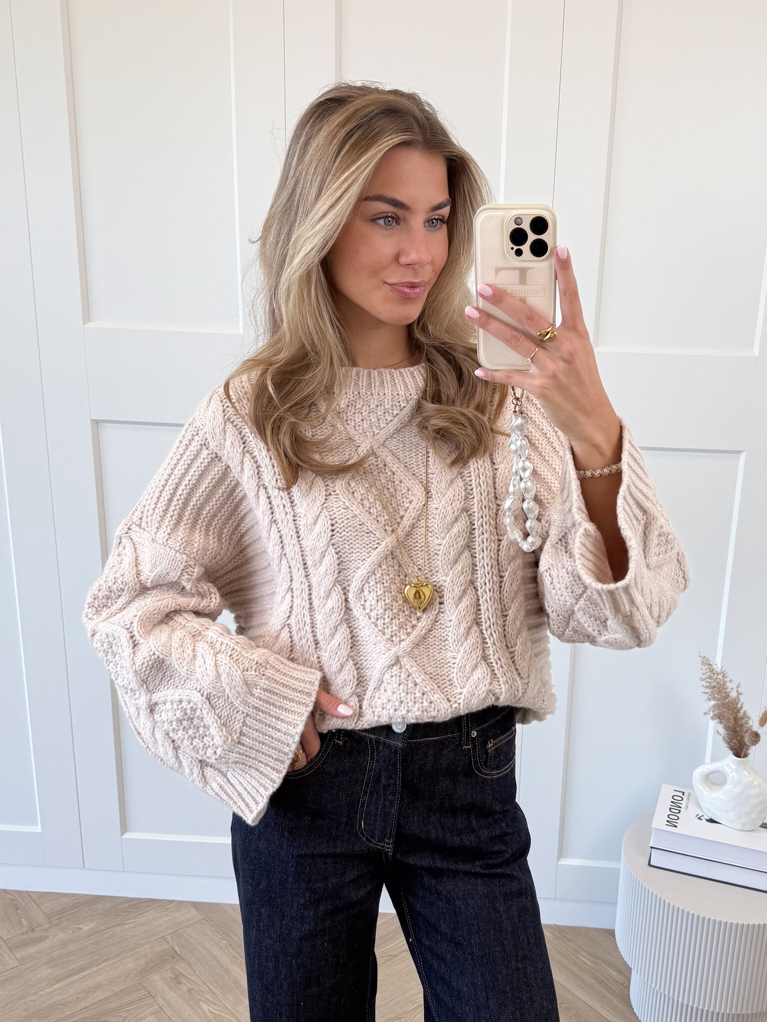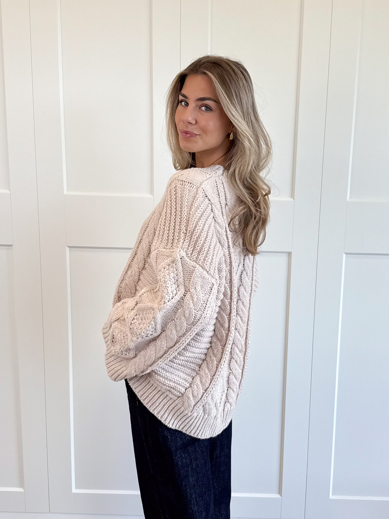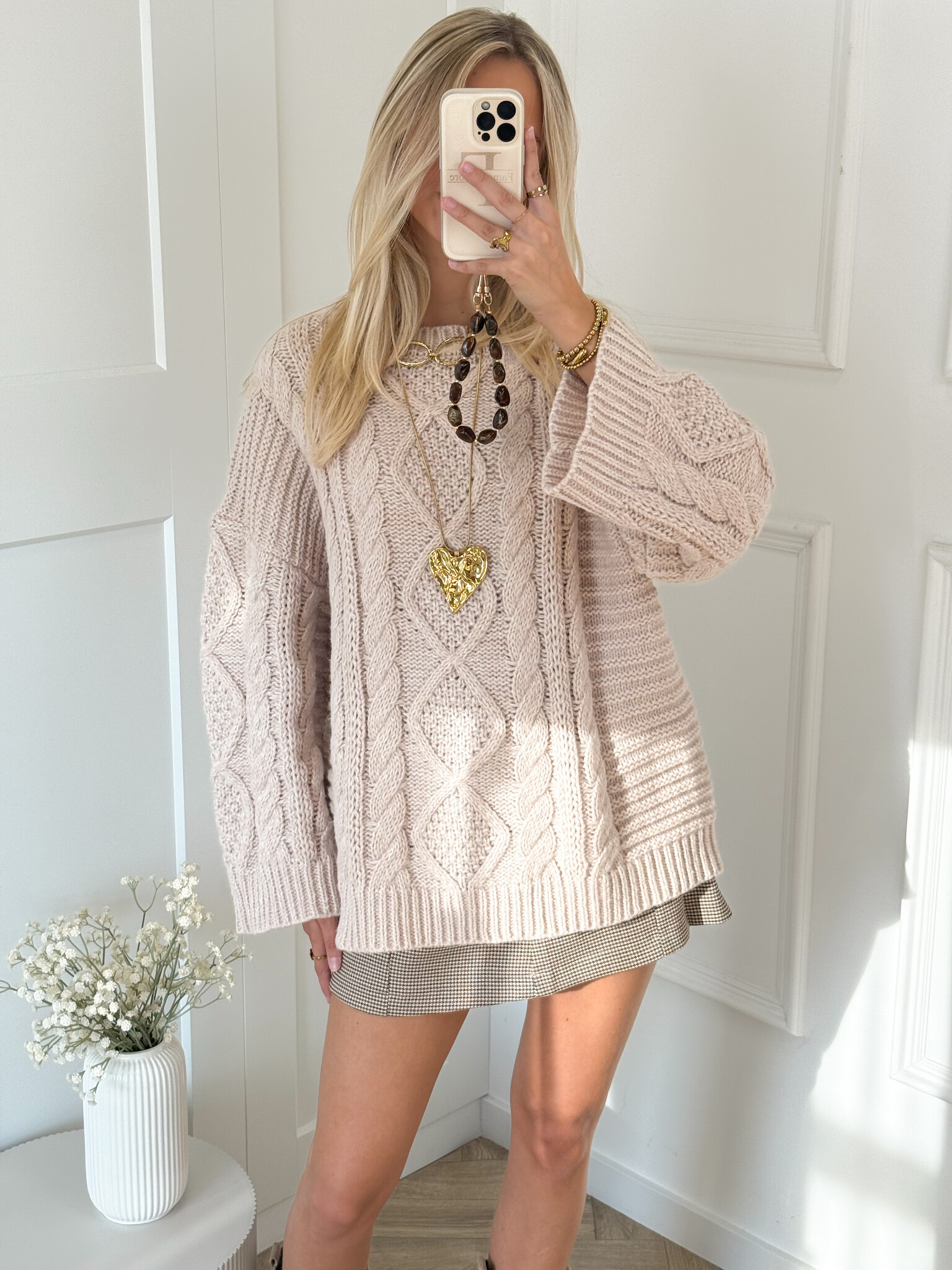 Deze beige kabeltrui wordt jouw ultieme cozy essential. De klassieke kabelstructuur geeft haar een tijdloze uitstraling, terwijl de oversized fit zorgt voor een relaxte en trendy look. Gemaakt van een warme, zachte knit die je heerlijk warm houdt tijdens koude dagen. Combineer haar casual met jeans of draag over een jurk voor een speelse herfststijl. Een trui die comfort en stijl moeiteloos samenbrengt.