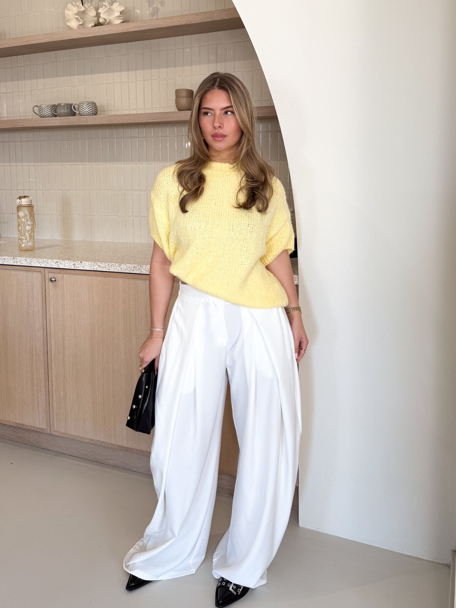 De fijne stof voelt heerlijk zacht aan op je huid en houdt je toch lekker warm, zelfs op frisse dagen. Dankzij het tijdloze design kun je dit truitje eindeloos combineren. Draag het casual met een jeans en sneakers voor een relaxte vibe, of ga voor een meer geklede look door het te stylen met een rok en een blazer. Het korte mouwenmodel geeft een speels en eigentijds effect, waardoor het truitje niet te zwaar oogt maar juist een frisse twist krijgt.