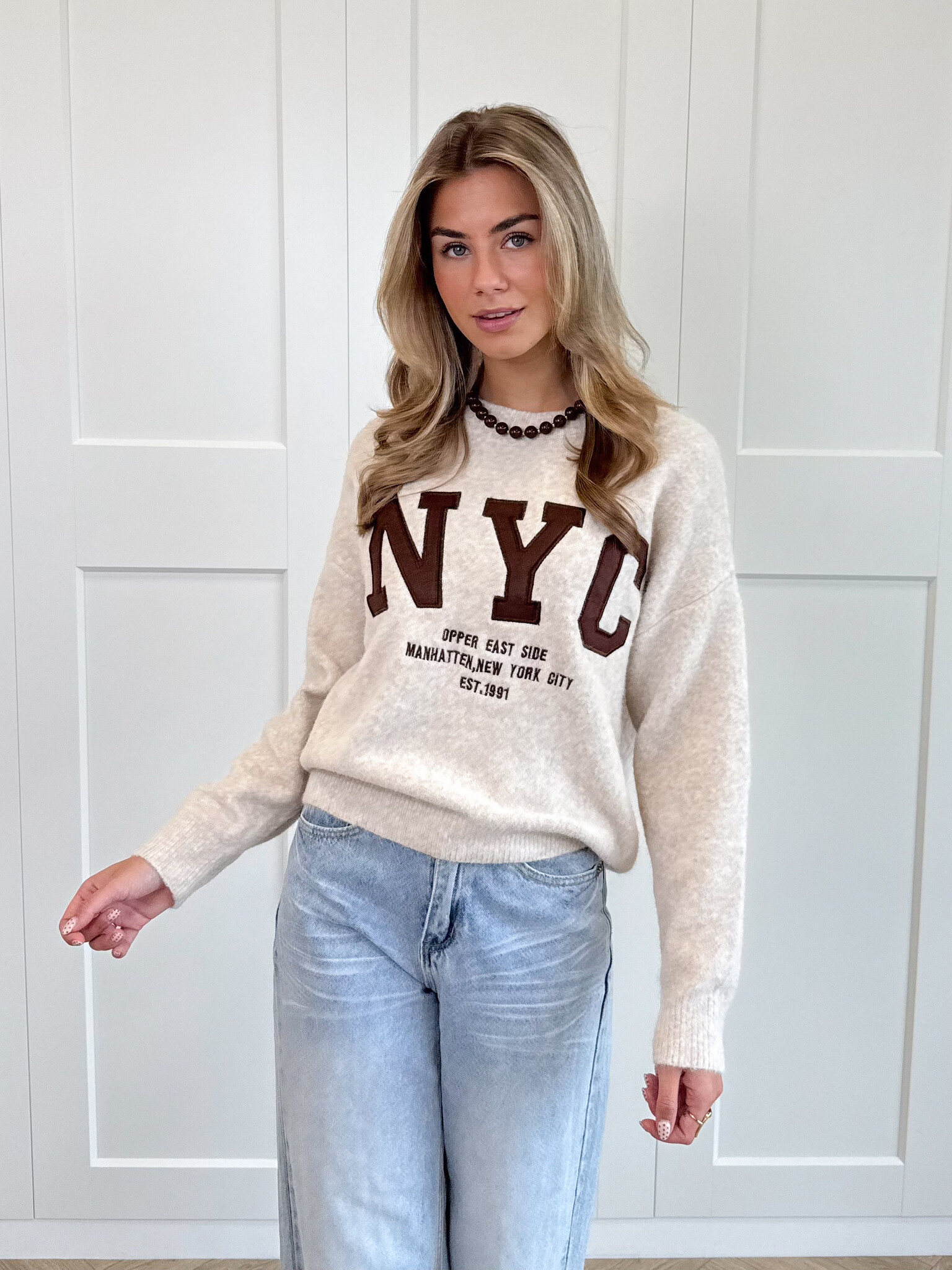 Deze zachte wollige sweater met NYC print is dé perfecte mix van comfort en stijl. De stof voelt heerlijk warm en fluffy aan, waardoor je hem het liefst elke dag draagt. De opvallende NYC tekst op de voorkant geeft een stoere, urban vibe en maakt de trui ideaal voor meiden en vrouwen die houden van streetstyle fashion.