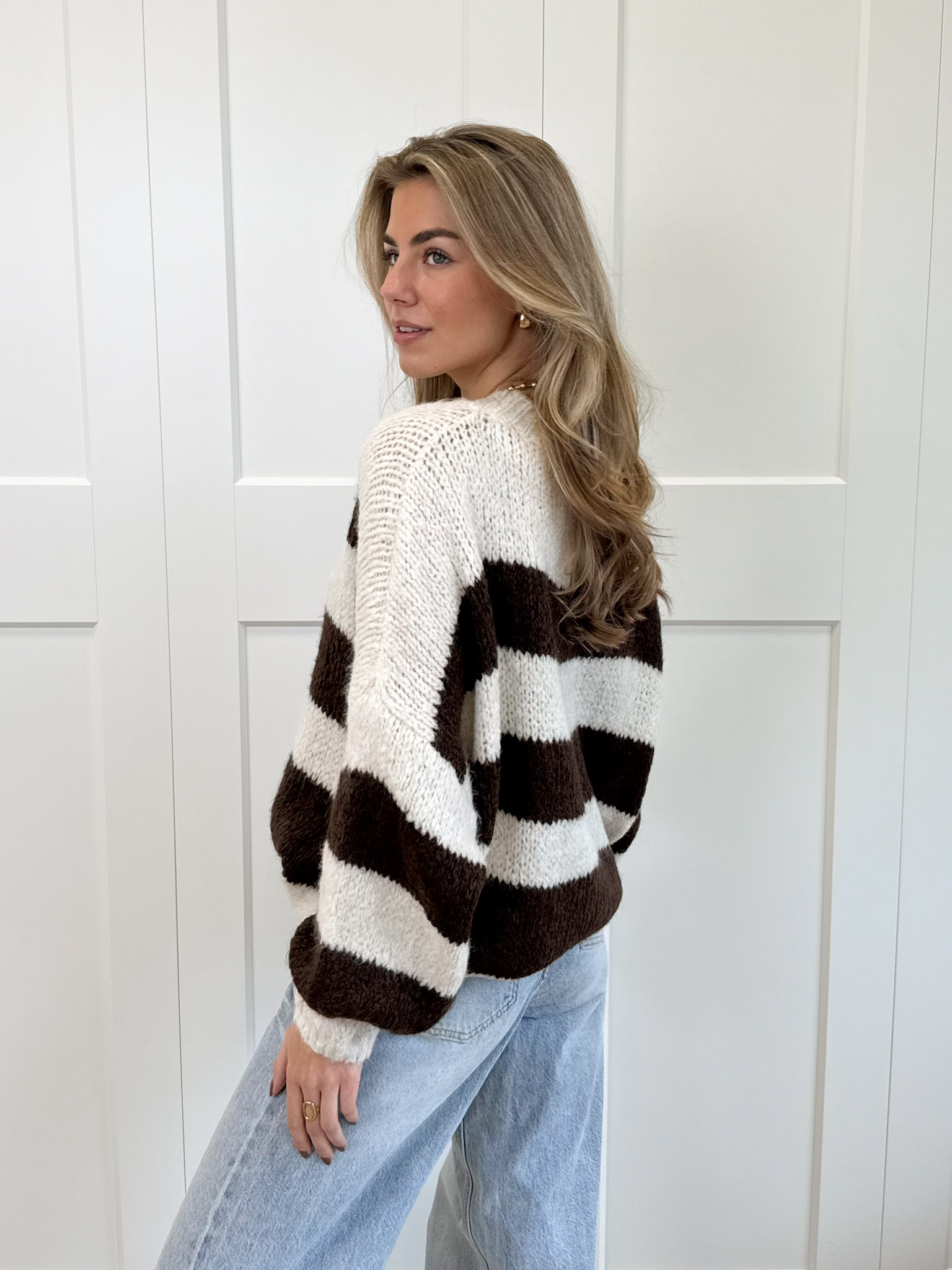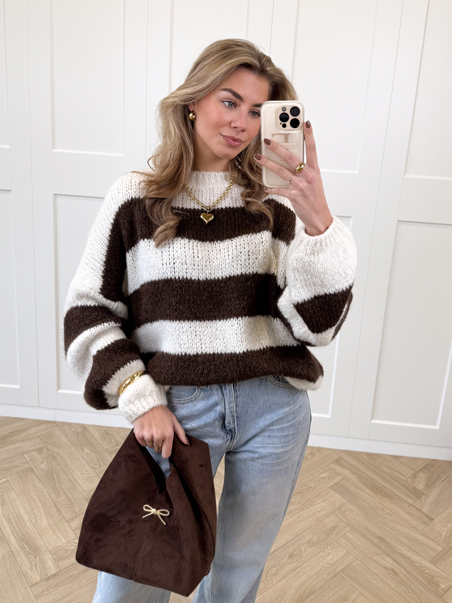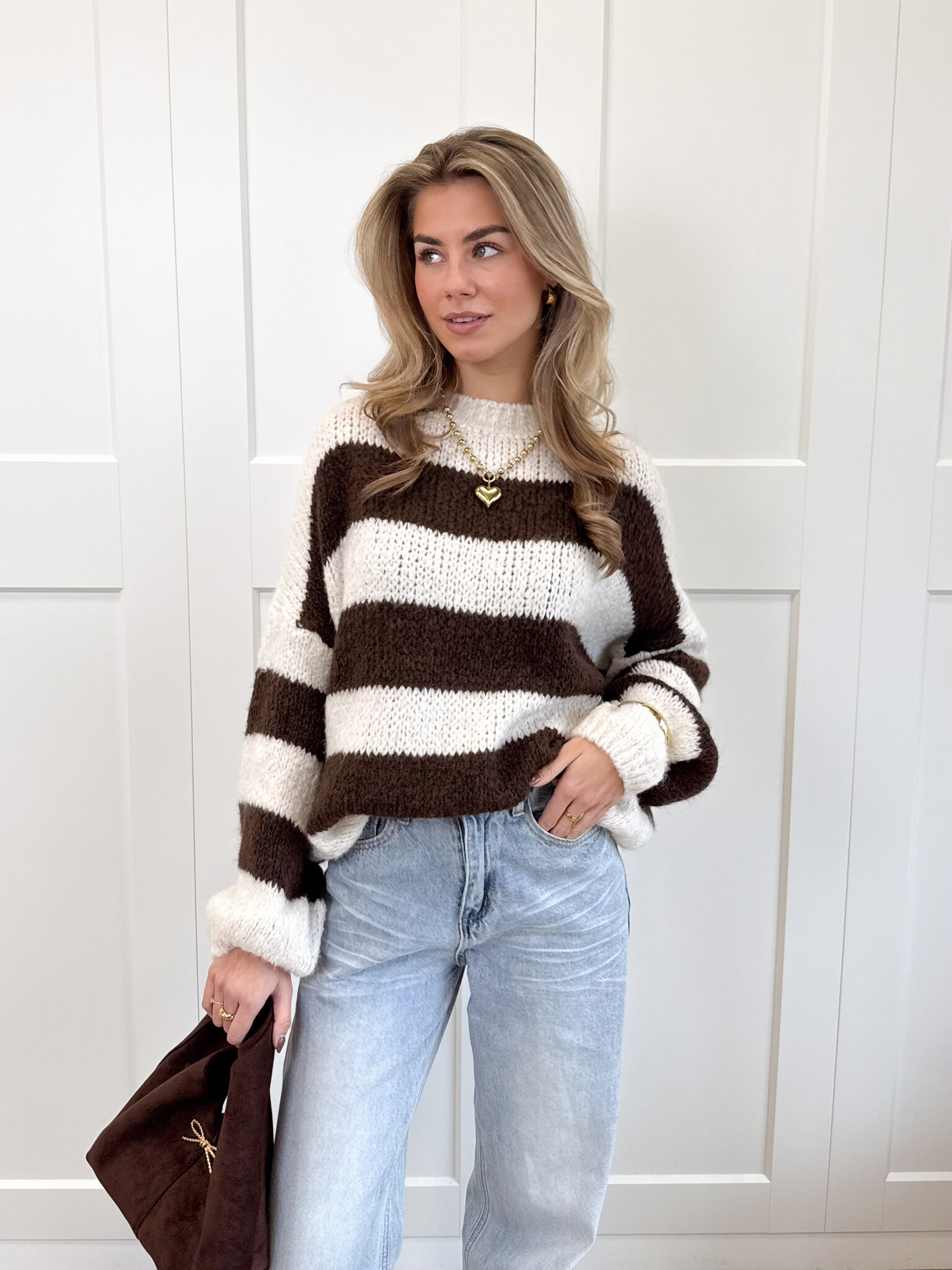 Deze knit trui is gemaakt voor iedereen die houdt van warmte, comfort en effortless style. De zachte, gebreide stof voelt heerlijk cozy aan en maakt dit item ideaal voor zowel koude dagen als relaxte momenten thuis. De strepen zorgen voor een frisse, speelse uitstraling, terwijl de knitstructuur de trui die typische comfy look geeft waar je het hele seizoen niet zonder wilt. De pasvorm is relaxed maar vrouwelijk, waardoor hij mooi valt en makkelijk te combineren is met jeans, denim skirt of zelfs een nette pantalon. Door de zachte knit draagt de trui prettig zonder te kriebelen en blijft hij mooi in vorm. Perfect voor een casual schooldag, een kantoorlook met een twist of een koffiedate met vriendinnen. Dit is zo’n trui die je keer op keer uit je kast pakt: warm, zacht, trendy en super easy te stylen!