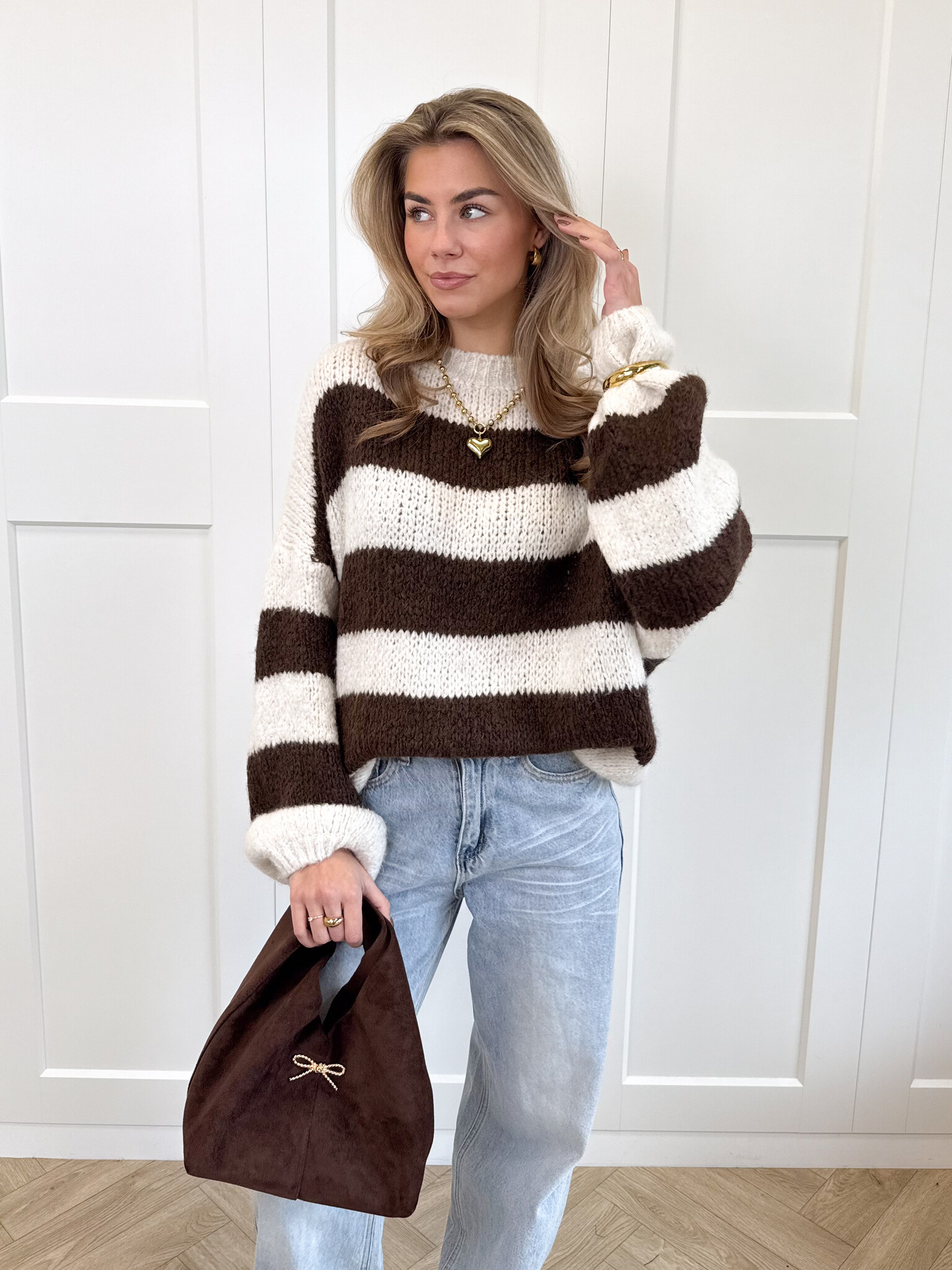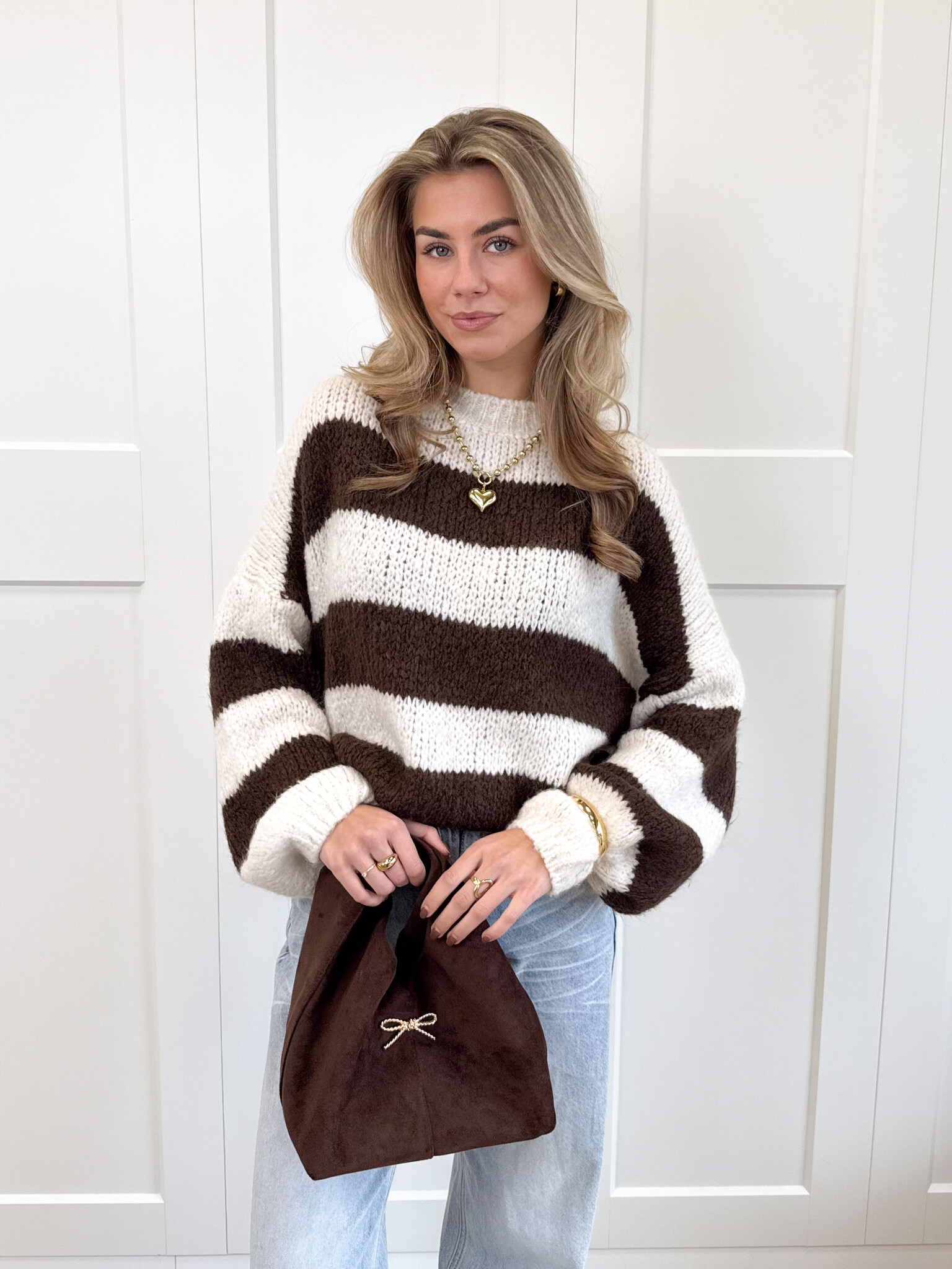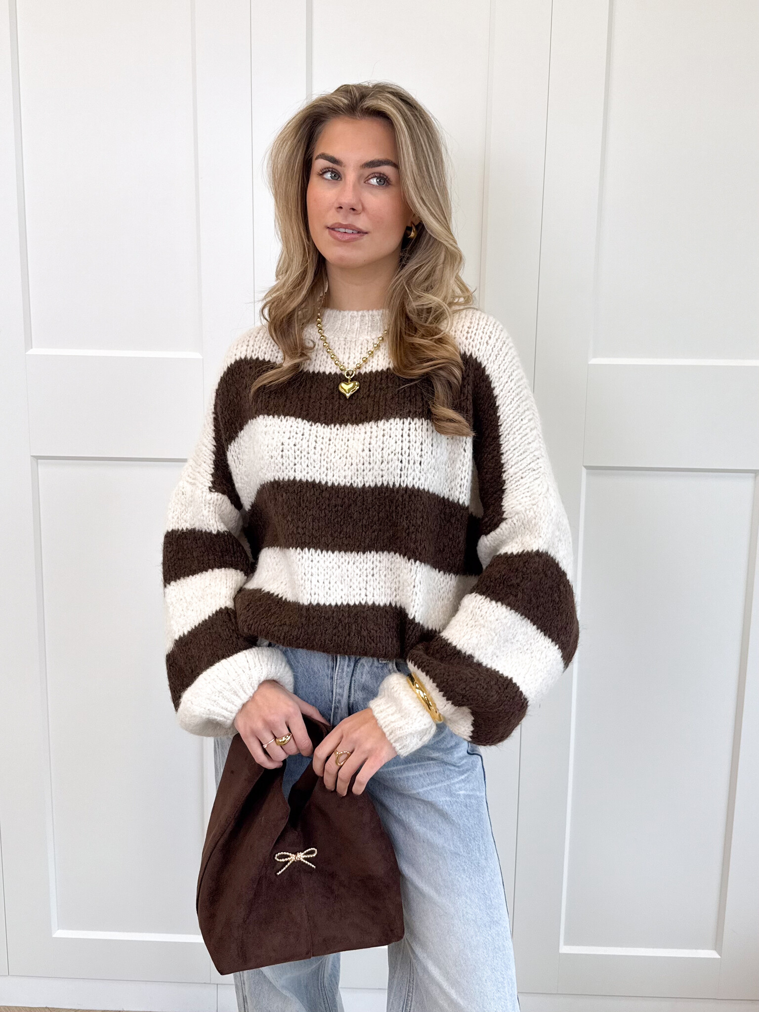 Deze knit trui is gemaakt voor iedereen die houdt van warmte, comfort en effortless style. De zachte, gebreide stof voelt heerlijk cozy aan en maakt dit item ideaal voor zowel koude dagen als relaxte momenten thuis. De strepen zorgen voor een frisse, speelse uitstraling, terwijl de knitstructuur de trui die typische comfy look geeft waar je het hele seizoen niet zonder wilt. De pasvorm is relaxed maar vrouwelijk, waardoor hij mooi valt en makkelijk te combineren is met jeans, denim skirt of zelfs een nette pantalon. Door de zachte knit draagt de trui prettig zonder te kriebelen en blijft hij mooi in vorm. Perfect voor een casual schooldag, een kantoorlook met een twist of een koffiedate met vriendinnen. Dit is zo’n trui die je keer op keer uit je kast pakt: warm, zacht, trendy en super easy te stylen!