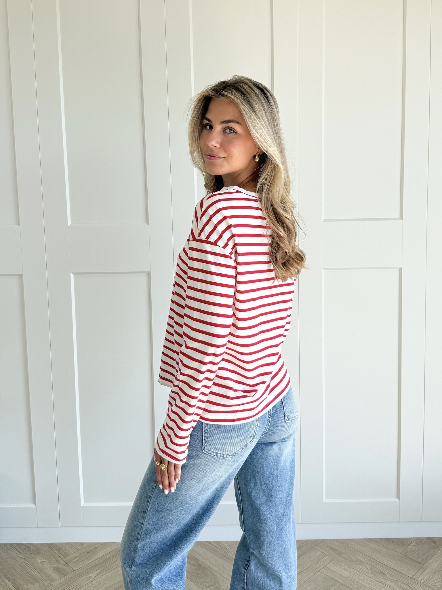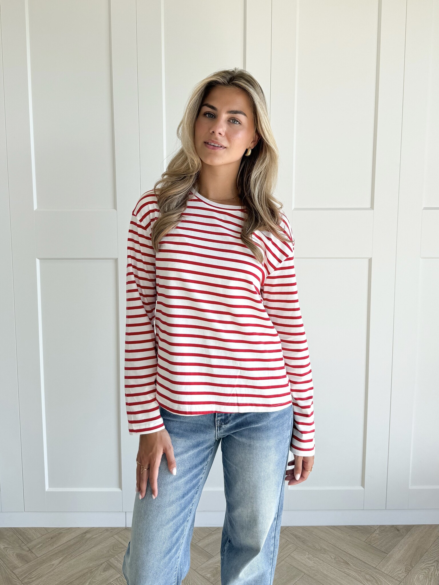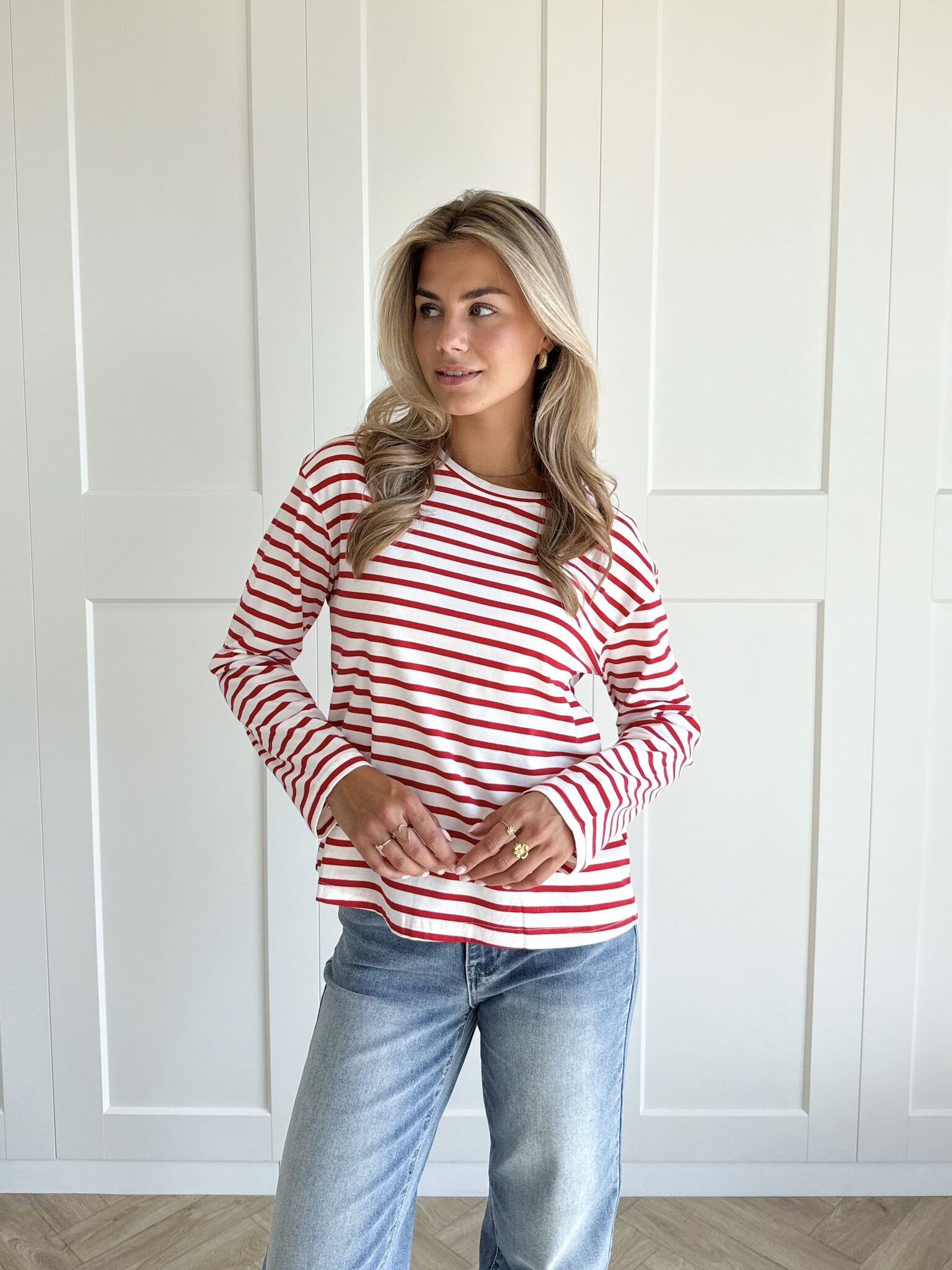 Dit is je nieuwe casual must-have! Dit gestreepte longsleeve shirt combineert wit en rood in een relaxed design met ronde hals en lange mouwen. Kies een maatje groter voor de perfecte oversized fit, ideaal om te combineren met jeans, wide leg pants of een rokje. Comfortabel, stijlvol en helemaal ready voor elke dag.