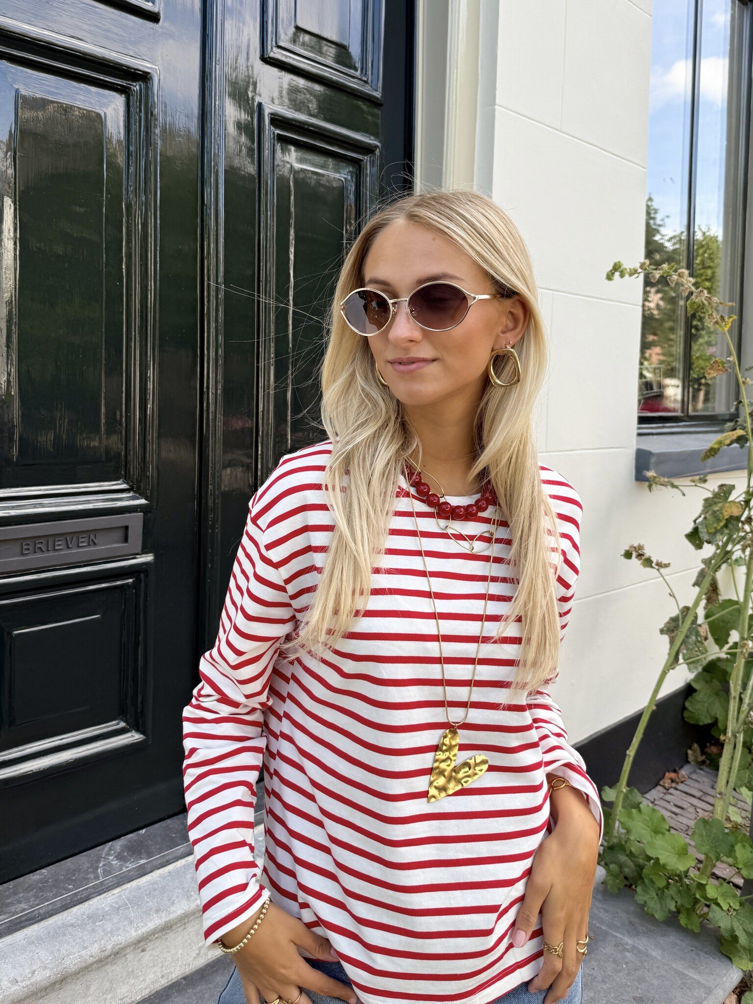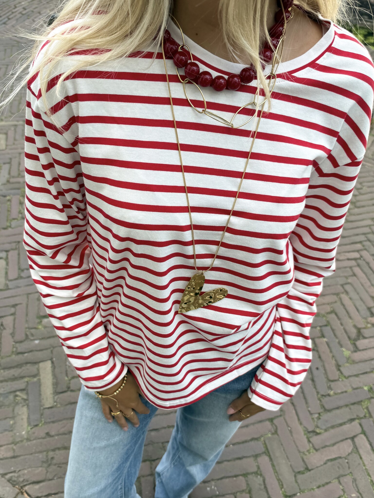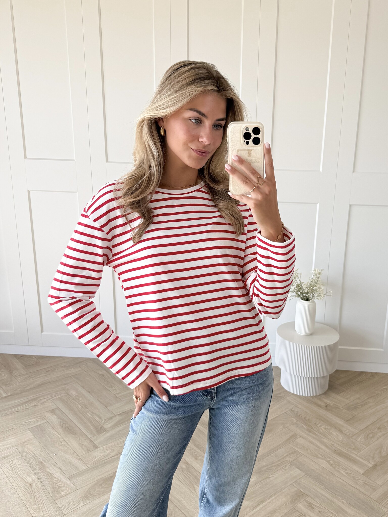 Dit is je nieuwe casual must-have! Dit gestreepte longsleeve shirt combineert wit en rood in een relaxed design met ronde hals en lange mouwen. Kies een maatje groter voor de perfecte oversized fit, ideaal om te combineren met jeans, wide leg pants of een rokje. Comfortabel, stijlvol en helemaal ready voor elke dag.