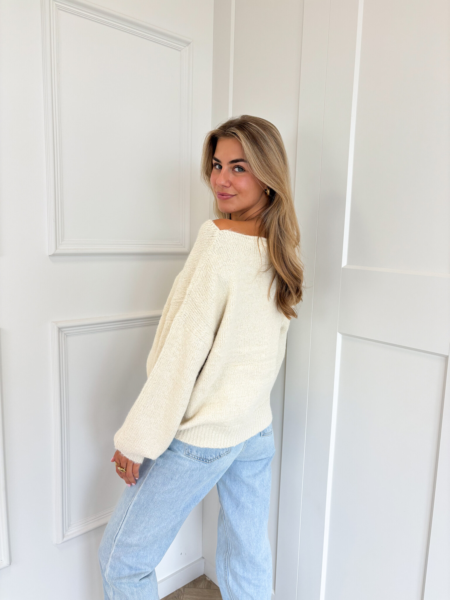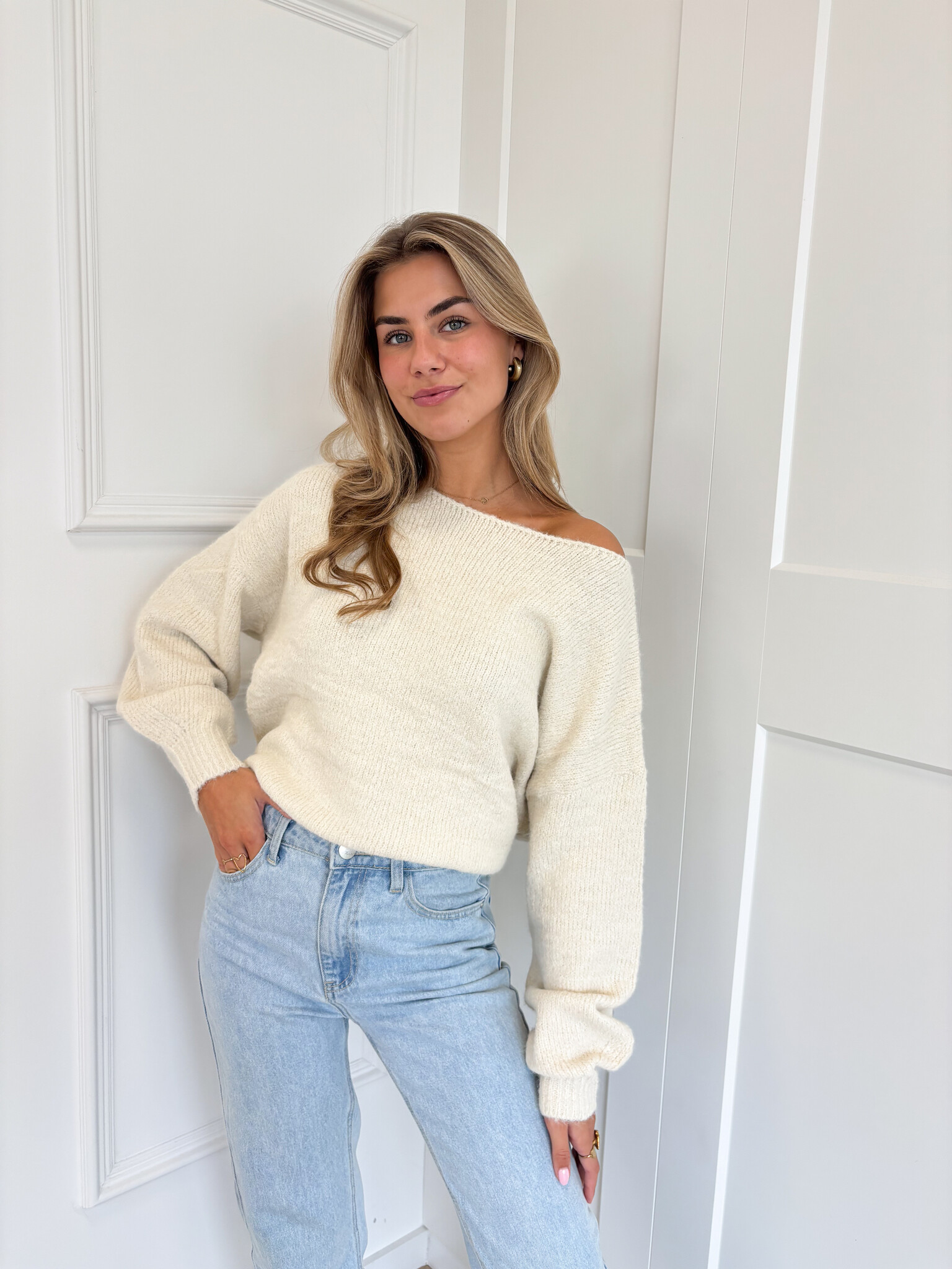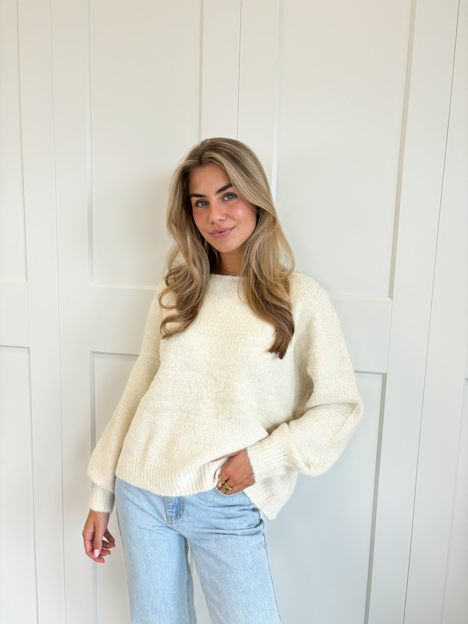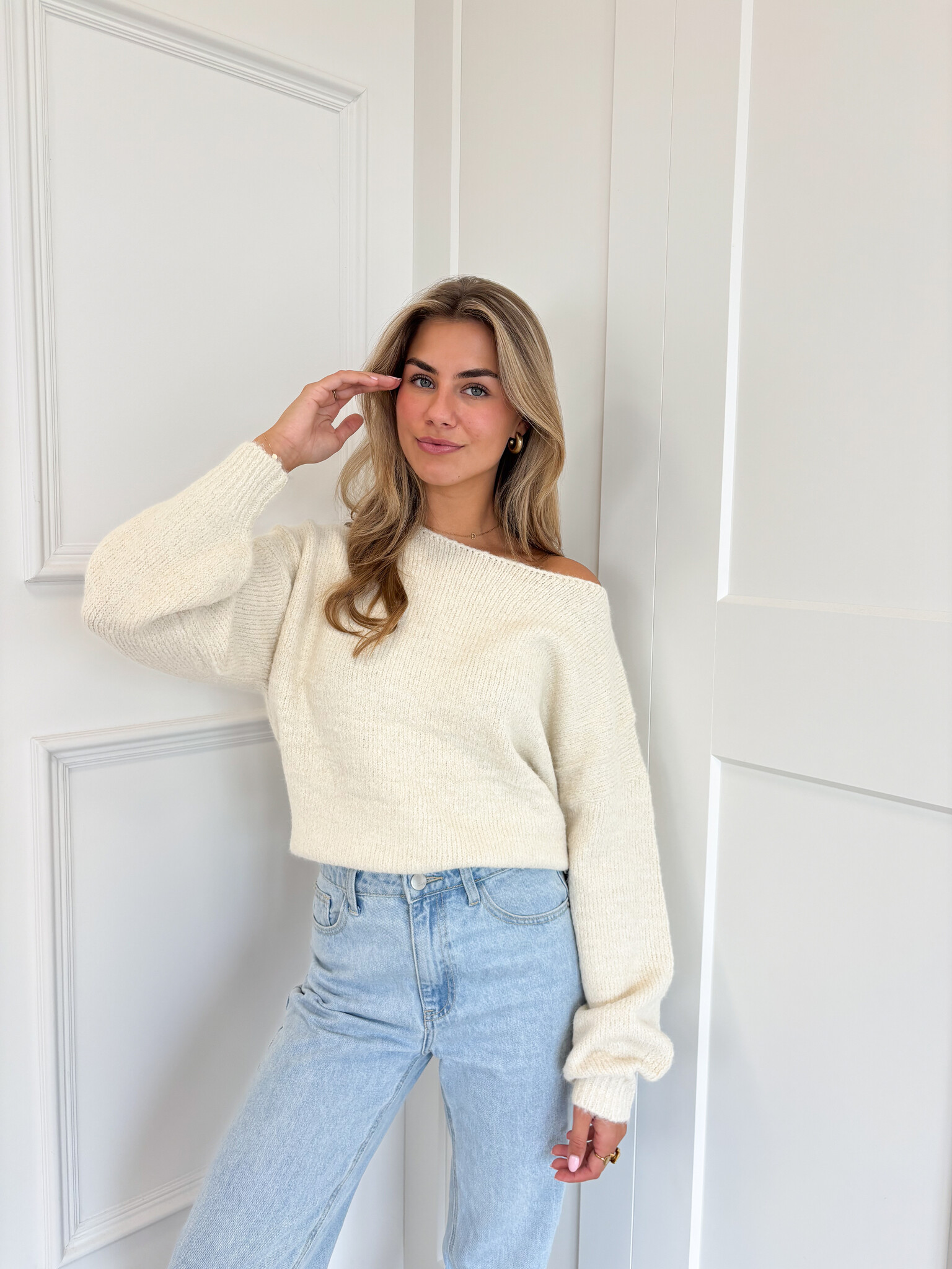De perfecte basic trui! Er zit een kleine gouden glitter in verwerkt, waardoor het een echte eye catcher is. De musthave die je gemakkelijk overal op kan combineren. De mouw heeft een pof. Om je outfit helemaal af te maken kan je de trui ook een beetje off shoulder dragen. Je shopt deze sweater in meerdere kleuren!