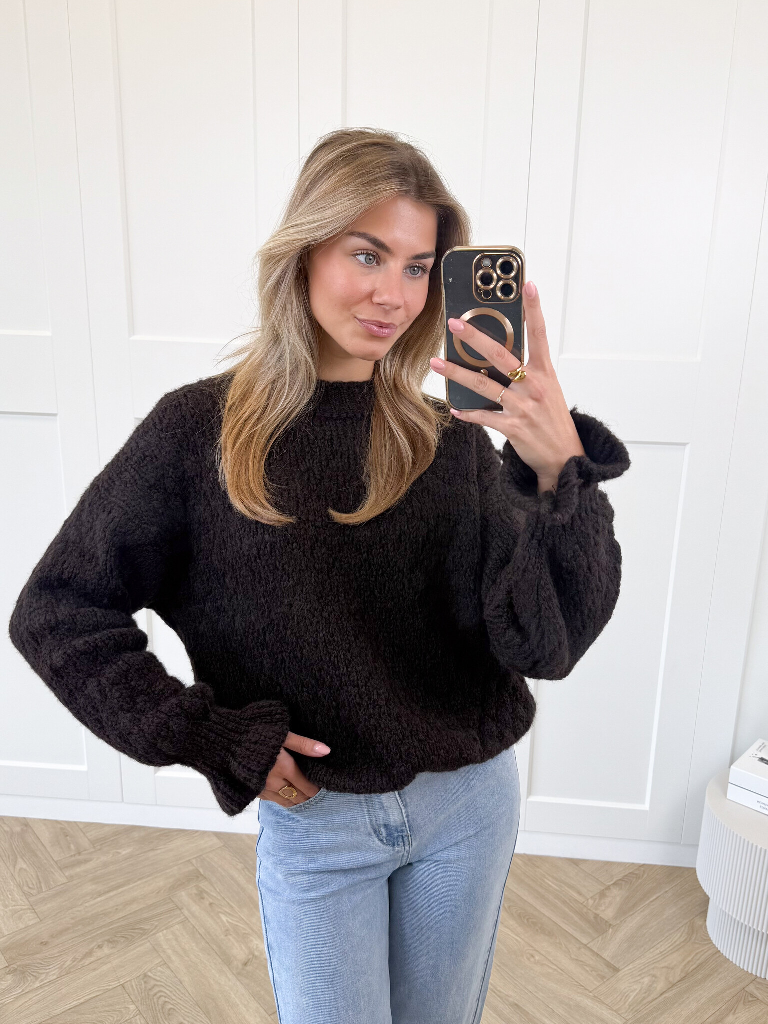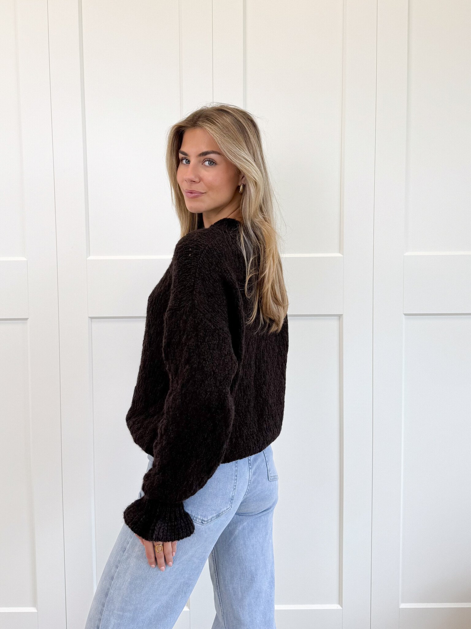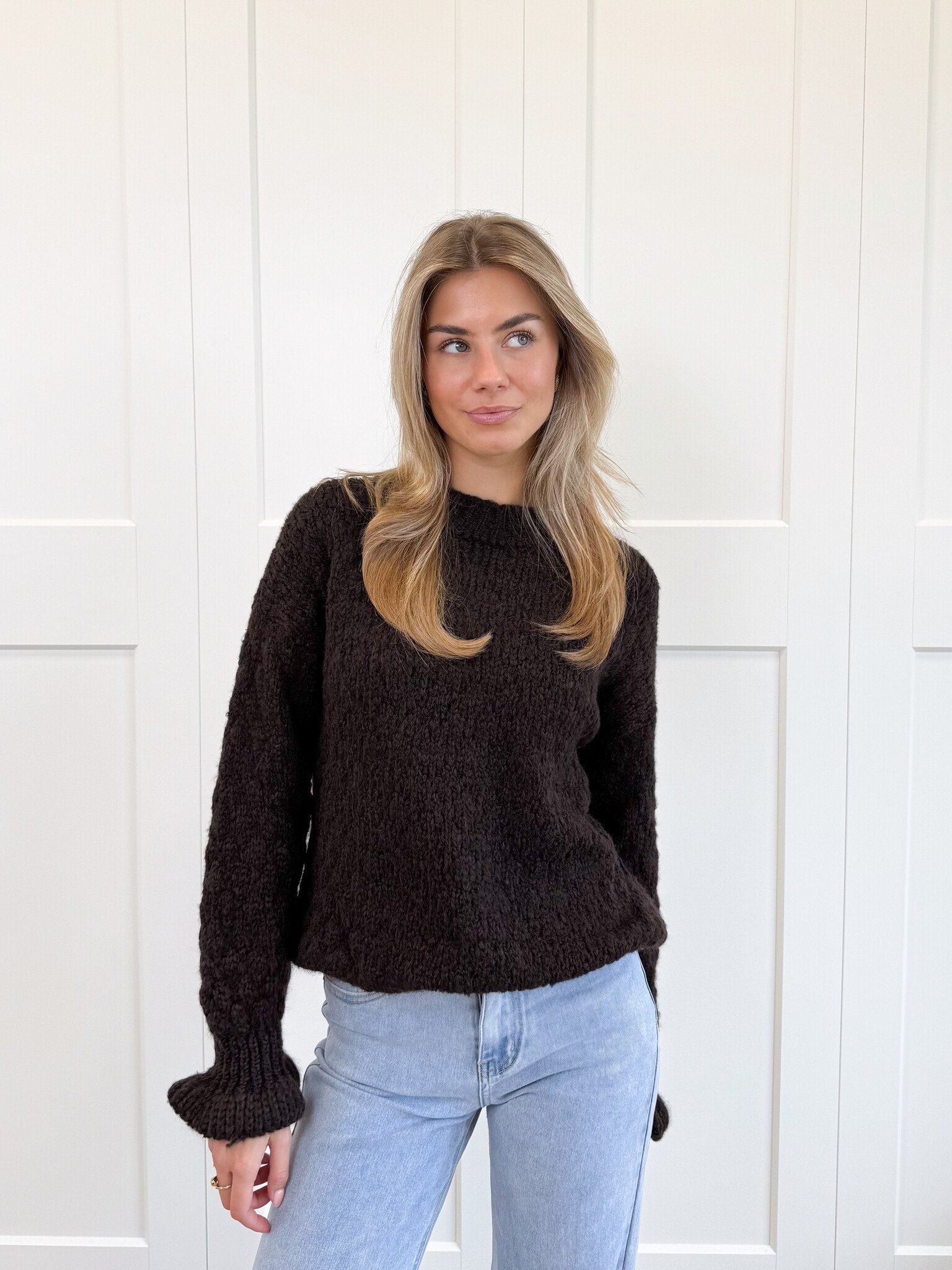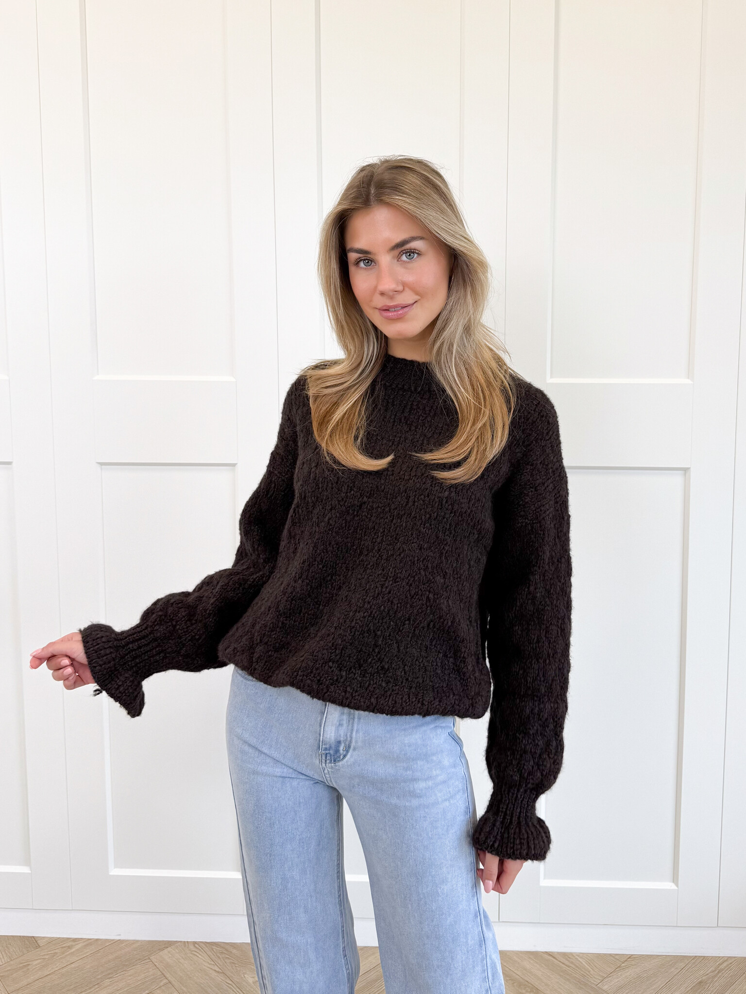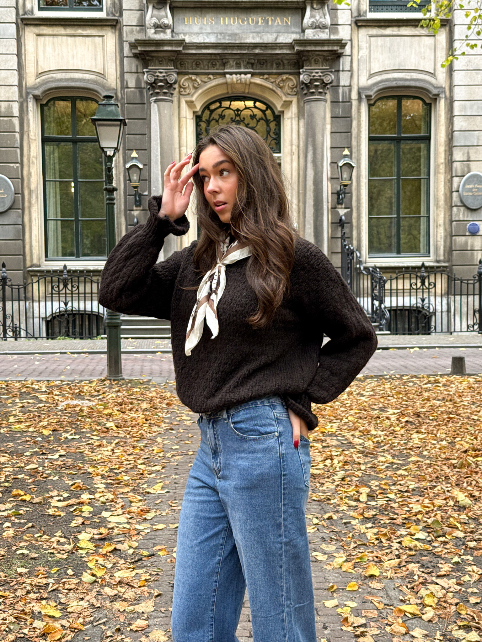 Deze bruine wollen trui is hét item dat je wilt dragen zodra het kouder wordt. De zachte trui voelt heerlijk warm aan en geeft je direct dat cozy gevoel. De relaxte fit zorgt voor een nonchalante, maar toch stijlvolle uitstraling. De bruine tint is tijdloos en makkelijk de combineren met een leuke jeans of een leuk rokje. De trui heeft een subtiele structuur die hem net dat beetje extra geeft. Kortom, alles wat je zoekt in een perfecte trui!