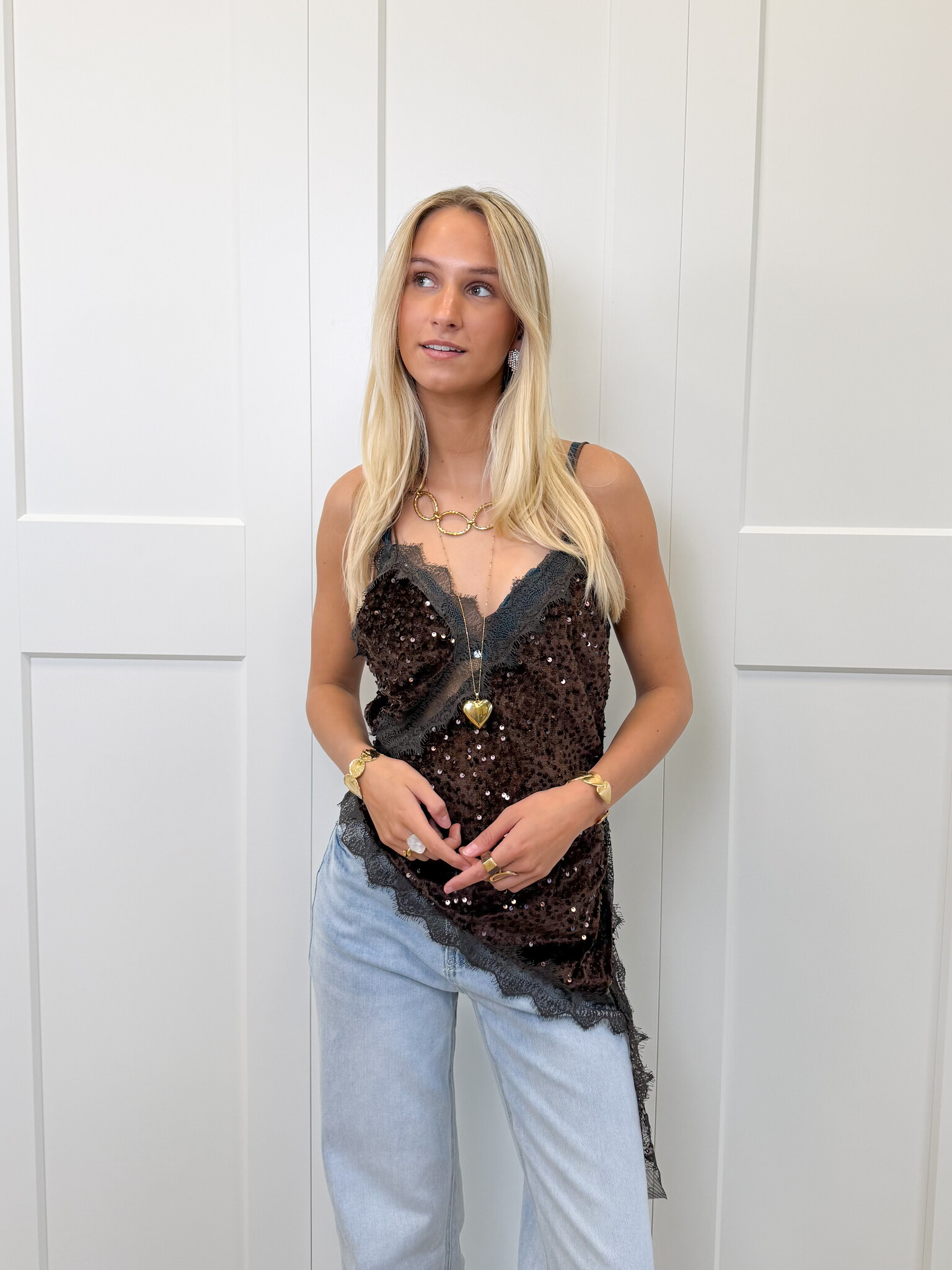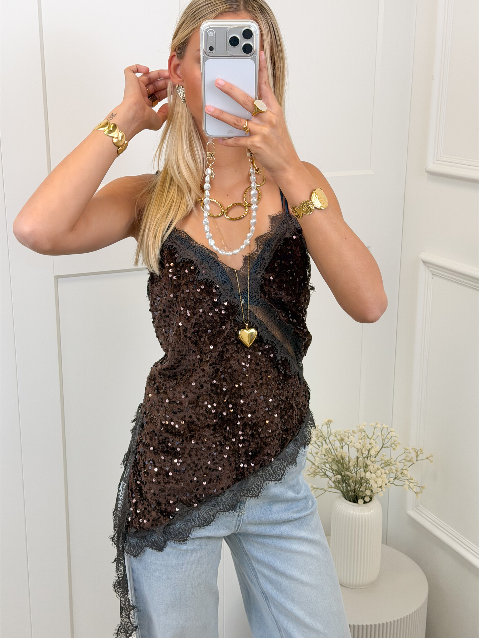 Deze bruine velvet pailletten lace top is de perfecte mix van vrouwelijkheid en elegantie. Het asymmetrische model en de spaghettibandjes zorgen voor een speels, maar verfijnd silhouet. De kanten details met pailletten geven de top een romantische party look.