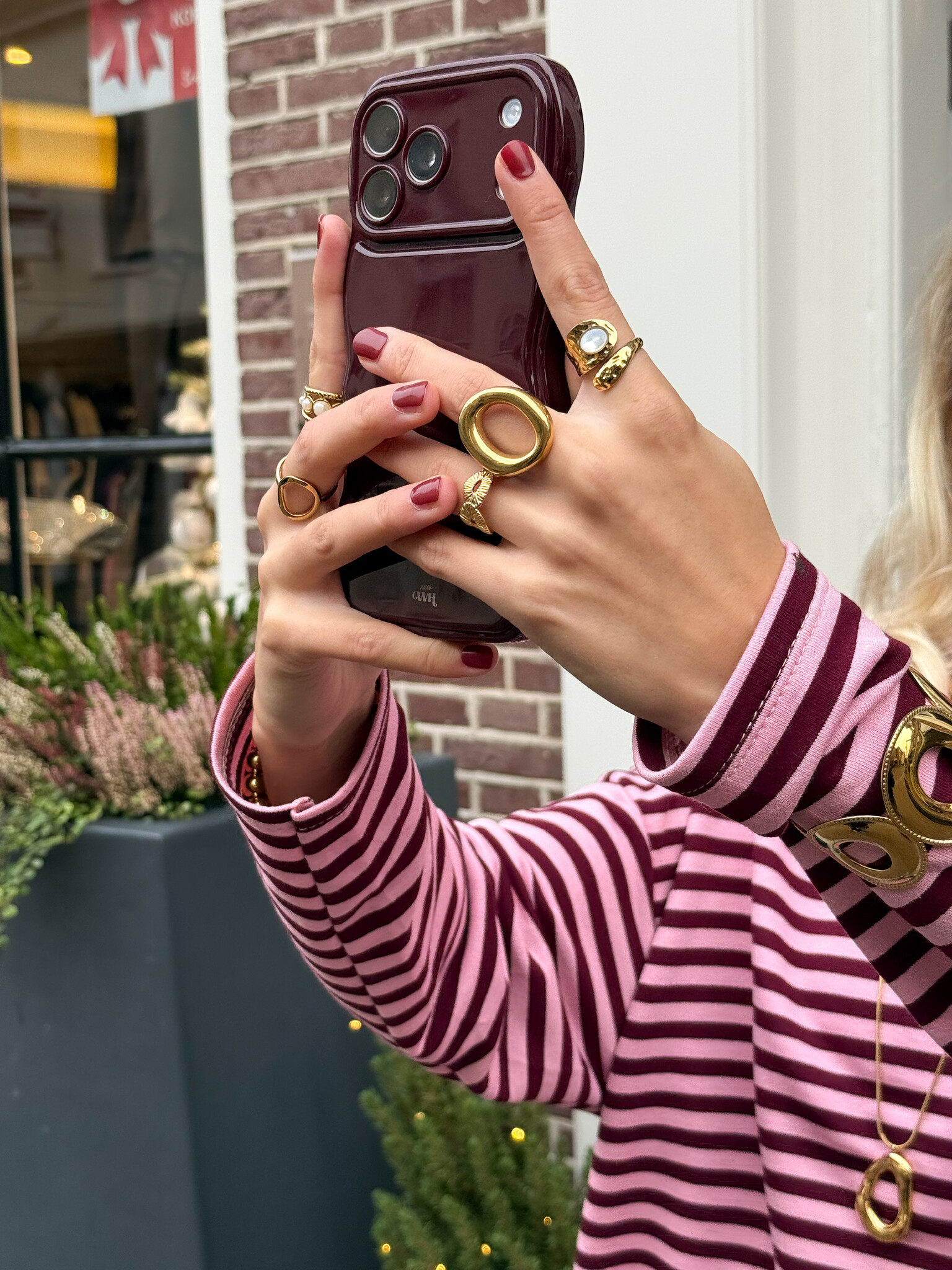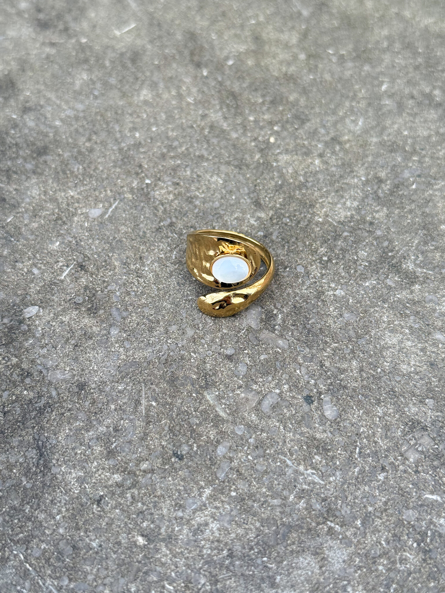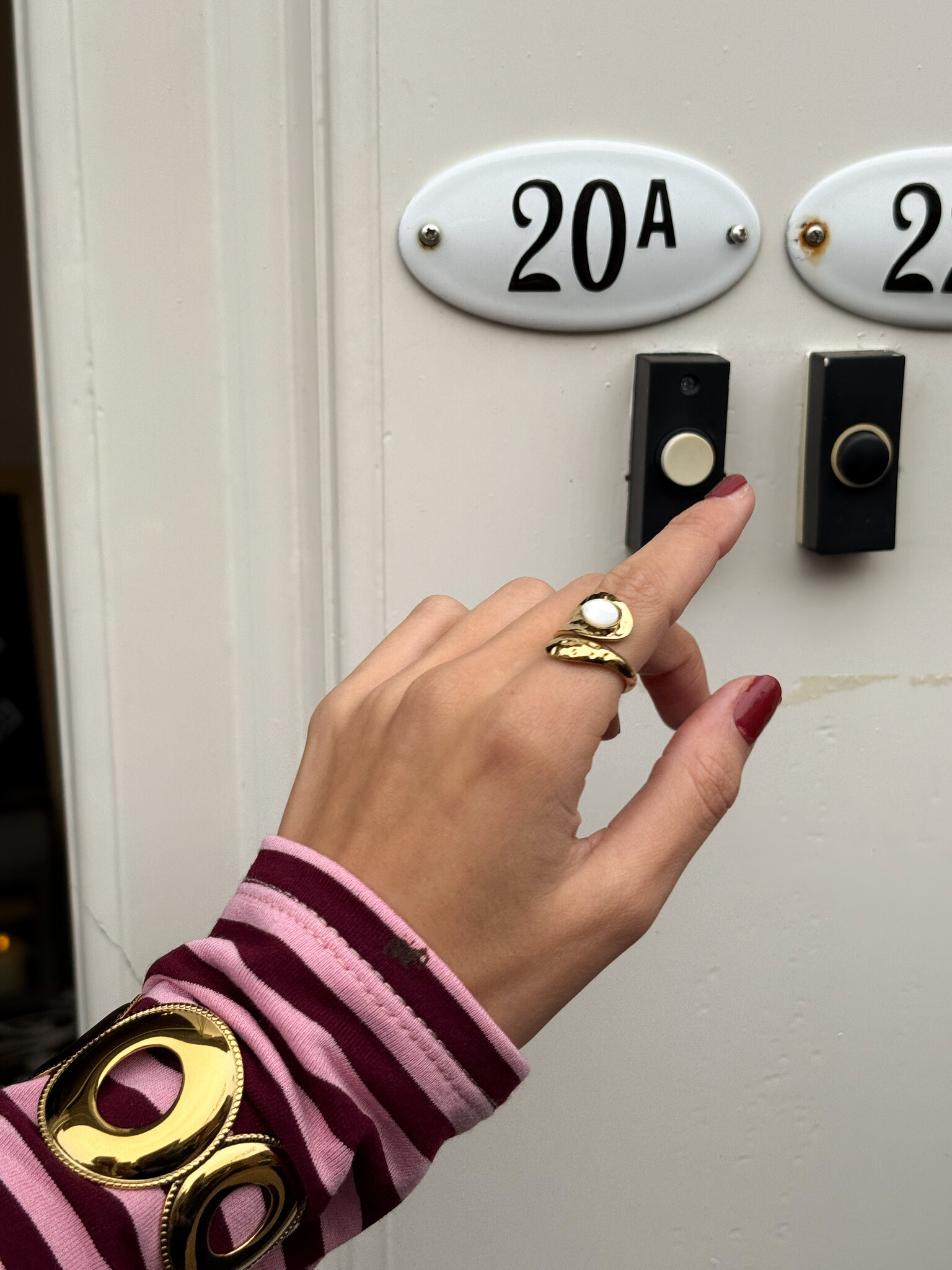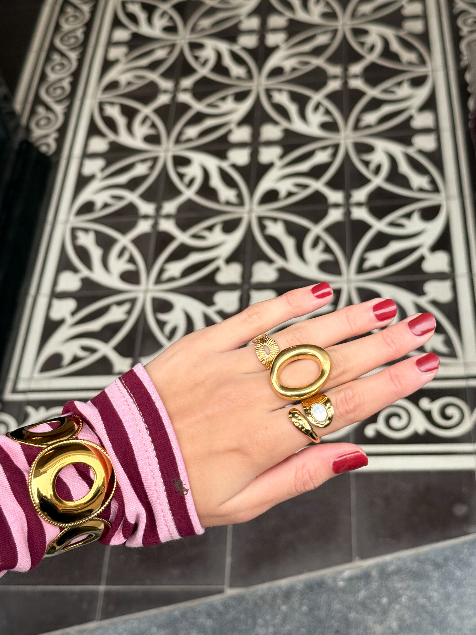 Deze goudkleurige ring met parelsteen straalt pure elegantie en femininiteit uit. De zachte glans van de parelsteen geeft het ontwerp een classy en girly uitstraling, terwijl de goudkleur zorgt voor een tijdloze look. Dankzij de verstelbare pasvorm zit de ring comfortabel om elke vinger en is hij ideaal voor dagelijks gebruik én speciale gelegenheden. Het design is subtiel maar opvallend genoeg om je outfit net dat extra detail te geven. Perfect om solo te dragen voor een minimalistische vibe of te combineren met andere ringen voor een trendy stacked look. Een musthave accessoire voor liefhebbers van zachte, elegante sieraden met een girly twist.