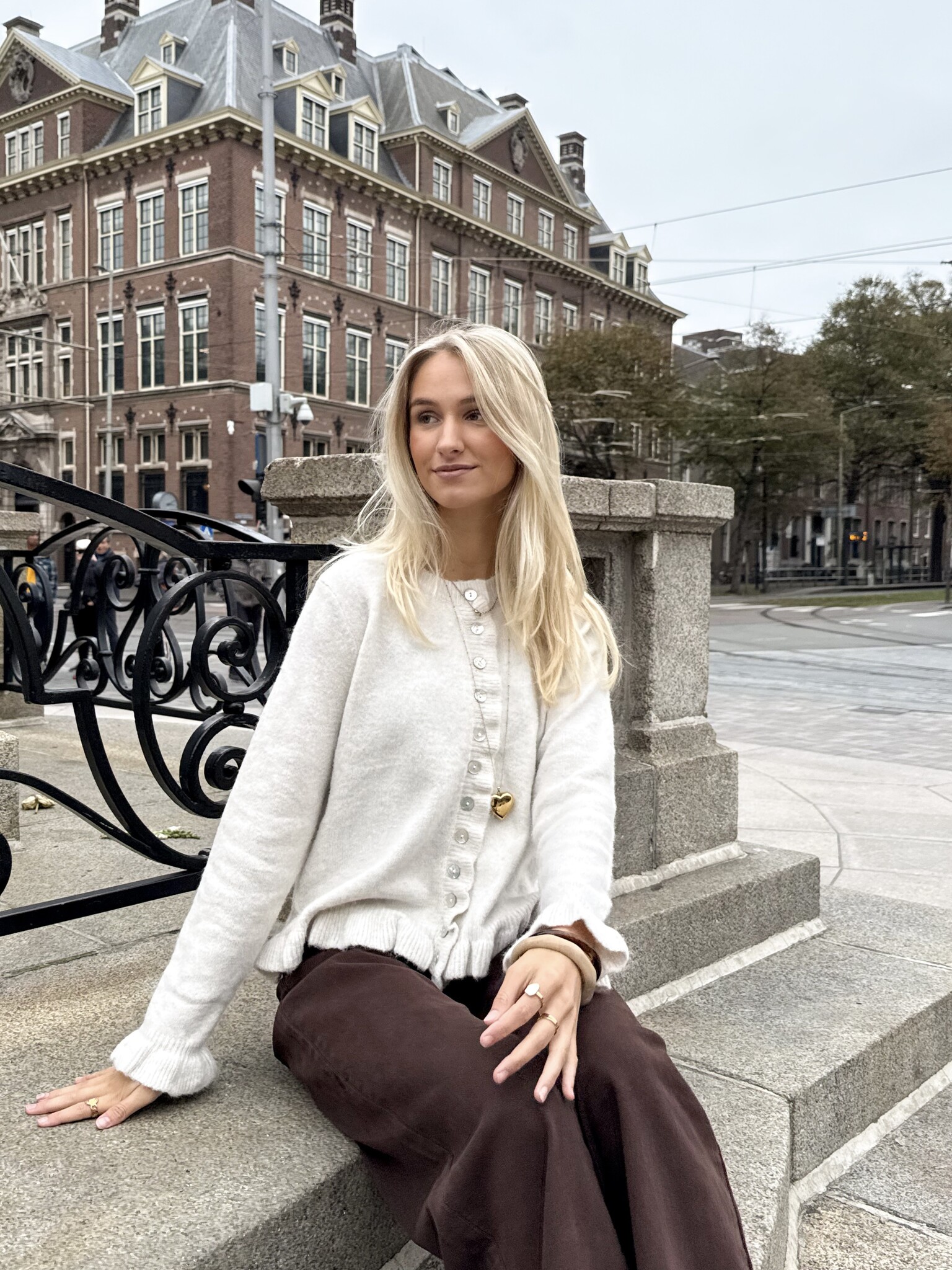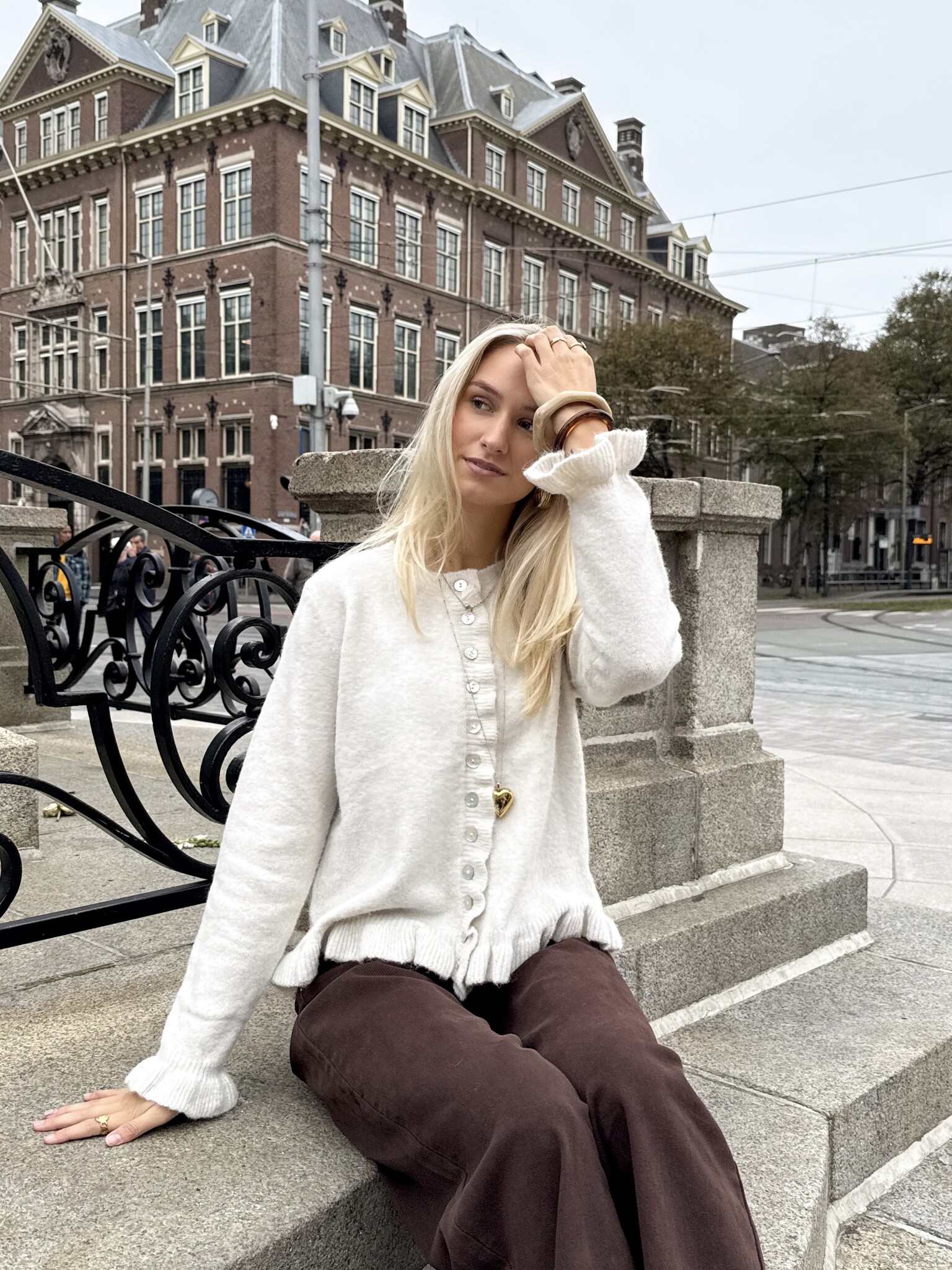 Dit beige vest met lange mouwen is het perfecte item voor de dagen waarop je comfort wilt combineren met een leuke outfit. Het zachte materiaal voelt heerlijk aan en houdt je lekker warm. De knoopsluiting aan de voorkant geeft het vest een leuke touch, terwijl de subtiele rafel-details aan de mouwen en onderkant zorgen voor een nonchalante look. De neutrale beige tint maakt het makkelijk te combineren met vrijwel elke outfit!
