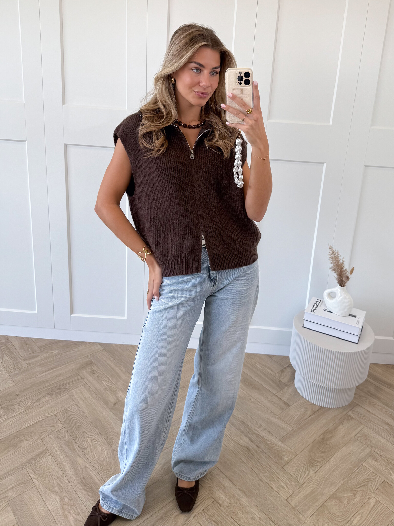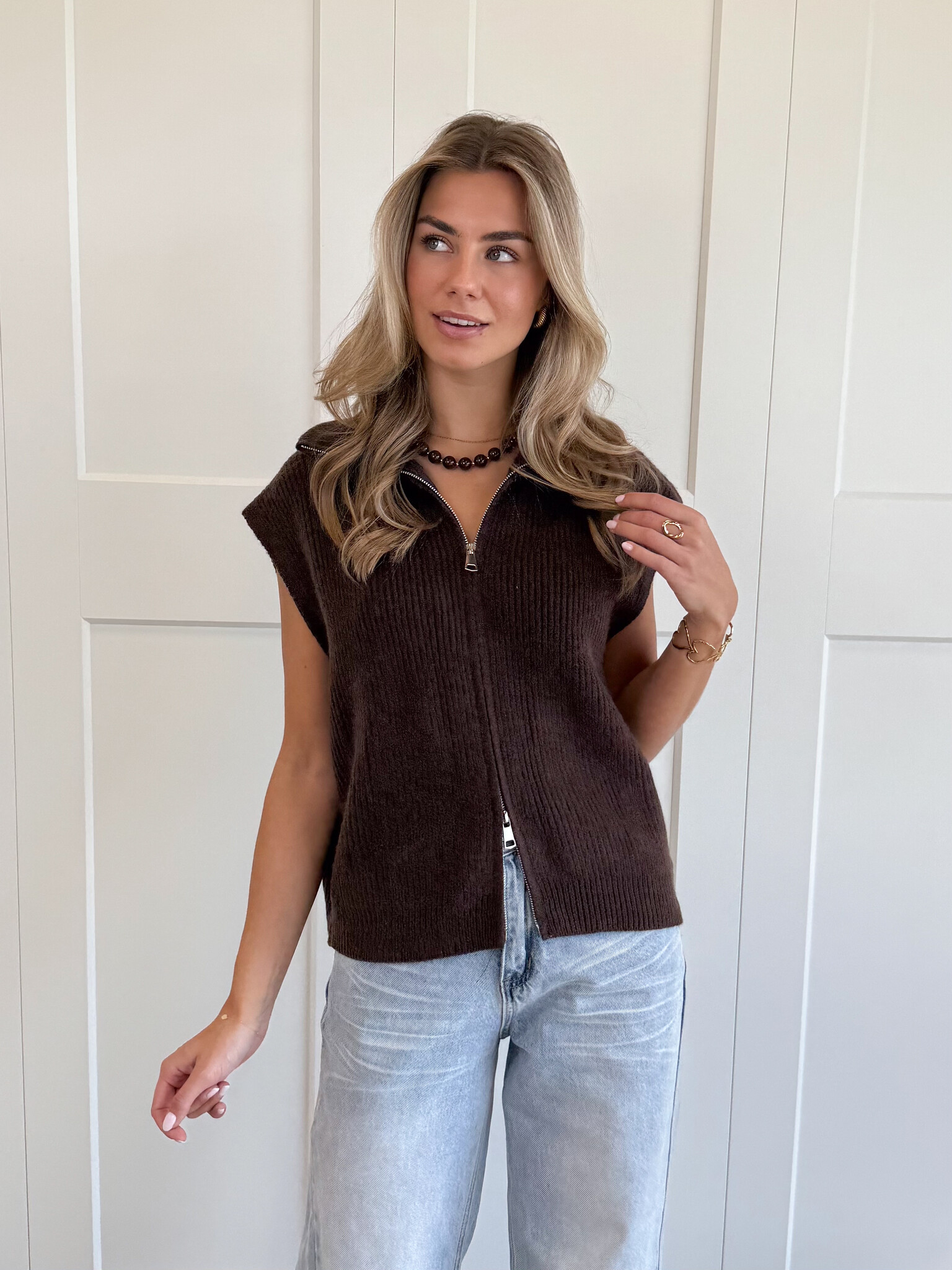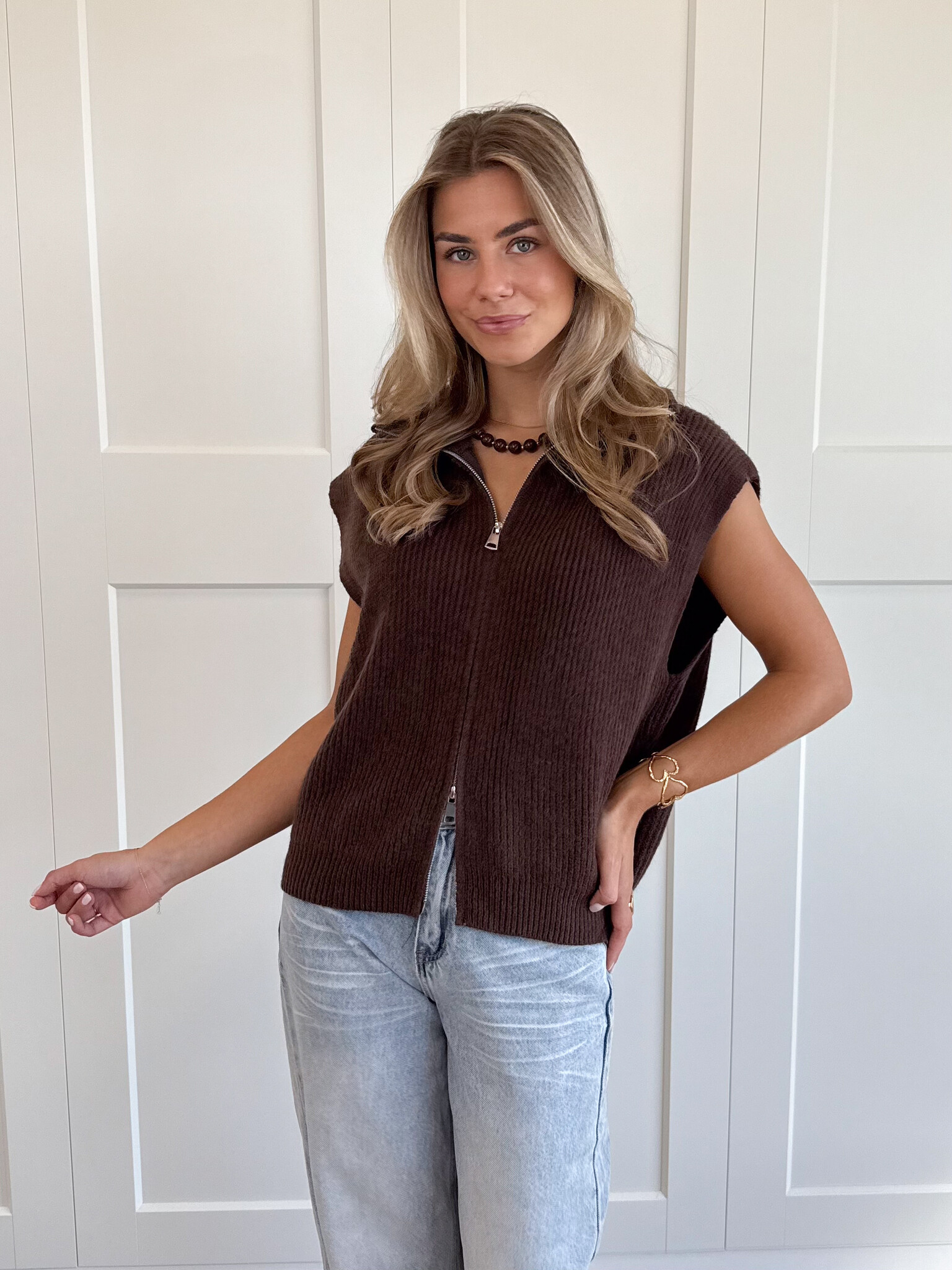 Maak kennis met dit bruine knit gilet. Een echte musthave voor jouw herfst- en wintergarderobe. Gemaakt van een zachte ribstof die heerlijk draagt, en afgewerkt met een kraag voor een stoere touch. De oversized fit geeft een relaxte uitstraling, terwijl de rits zowel van boven als onder open te maken is, zodat je haar op verschillende manieren kunt stylen. Draag het gilet over een longsleeve of blouse voor een gelaagde, cozy look.