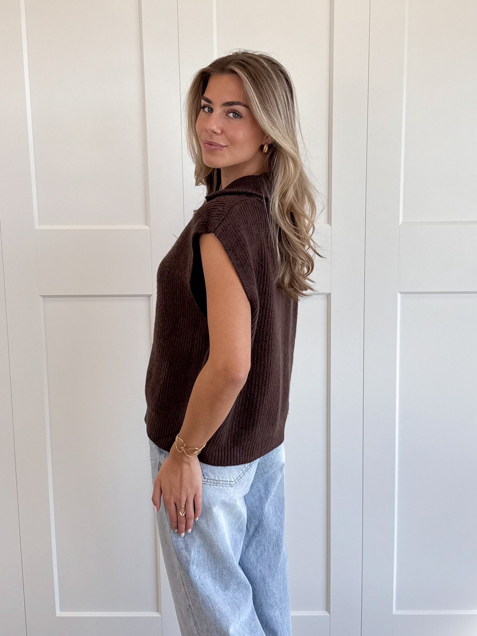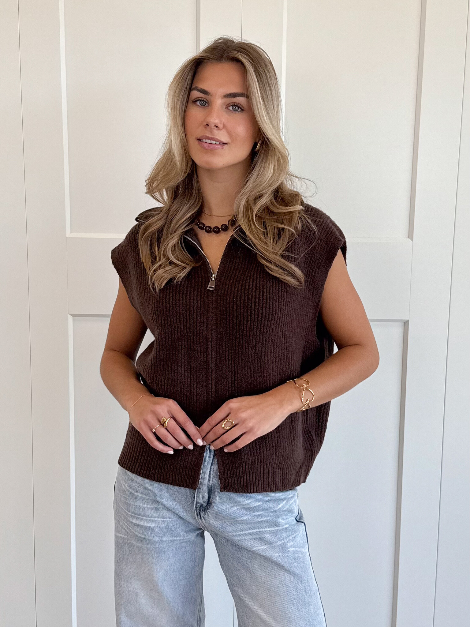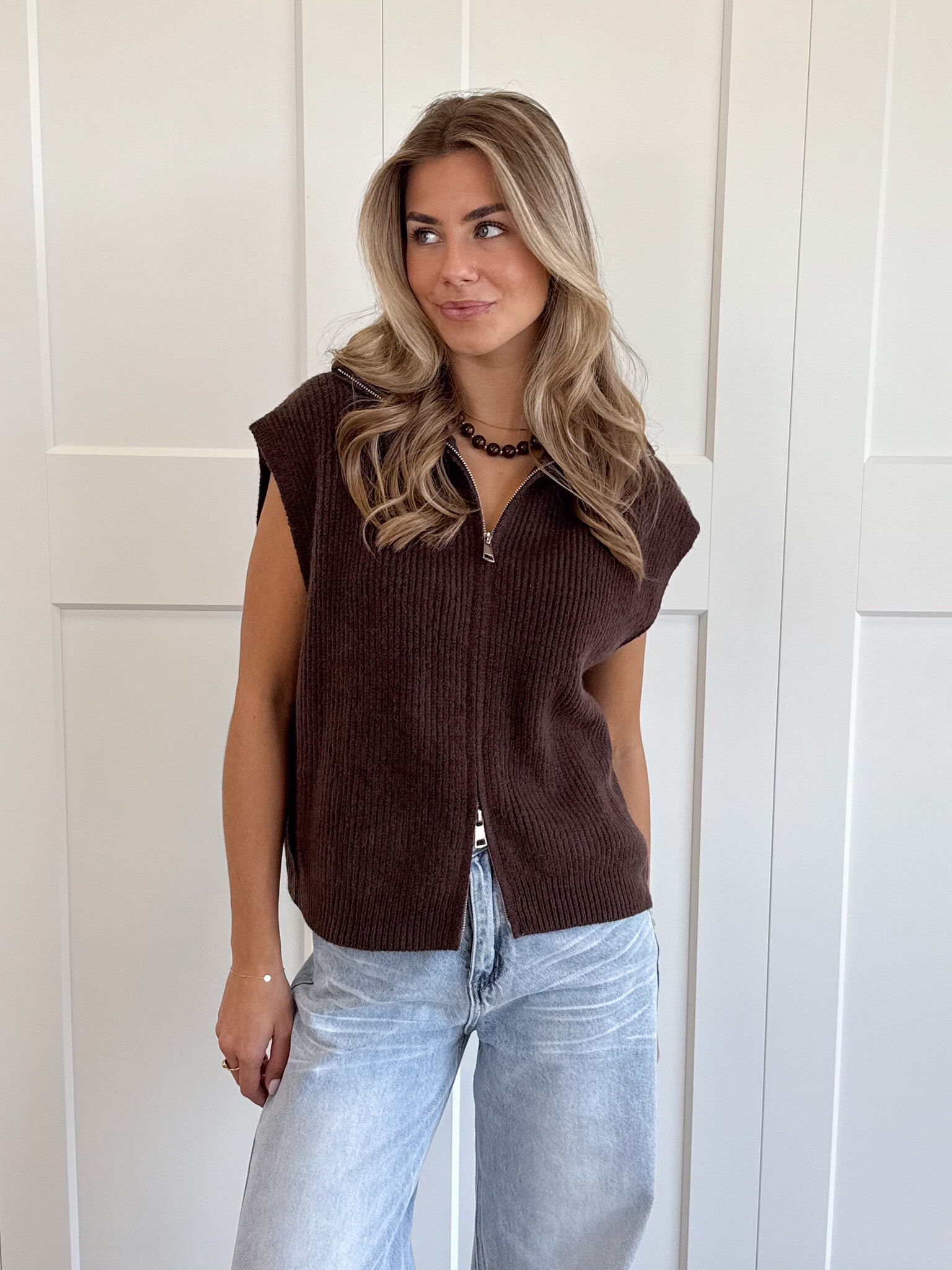 Maak kennis met dit bruine knit gilet. Een echte musthave voor jouw herfst- en wintergarderobe. Gemaakt van een zachte ribstof die heerlijk draagt, en afgewerkt met een kraag voor een stoere touch. De oversized fit geeft een relaxte uitstraling, terwijl de rits zowel van boven als onder open te maken is, zodat je haar op verschillende manieren kunt stylen. Draag het gilet over een longsleeve of blouse voor een gelaagde, cozy look.
