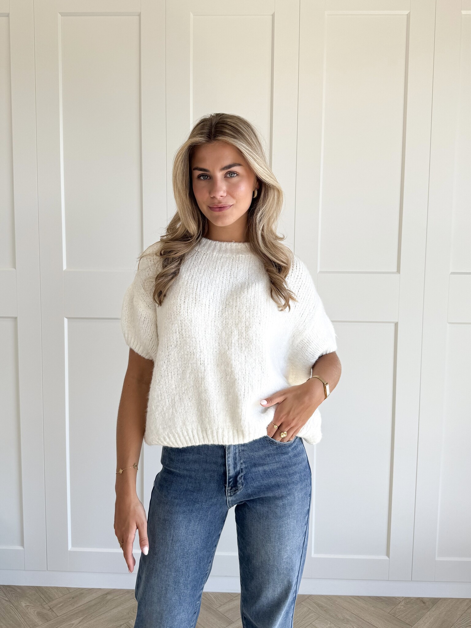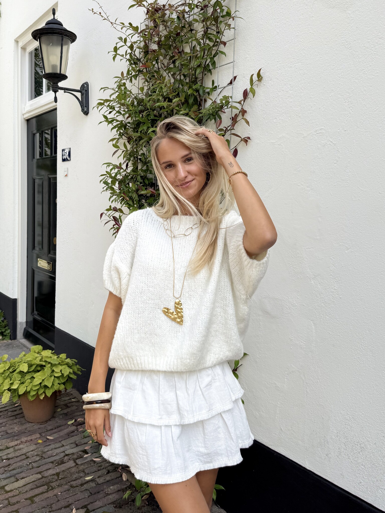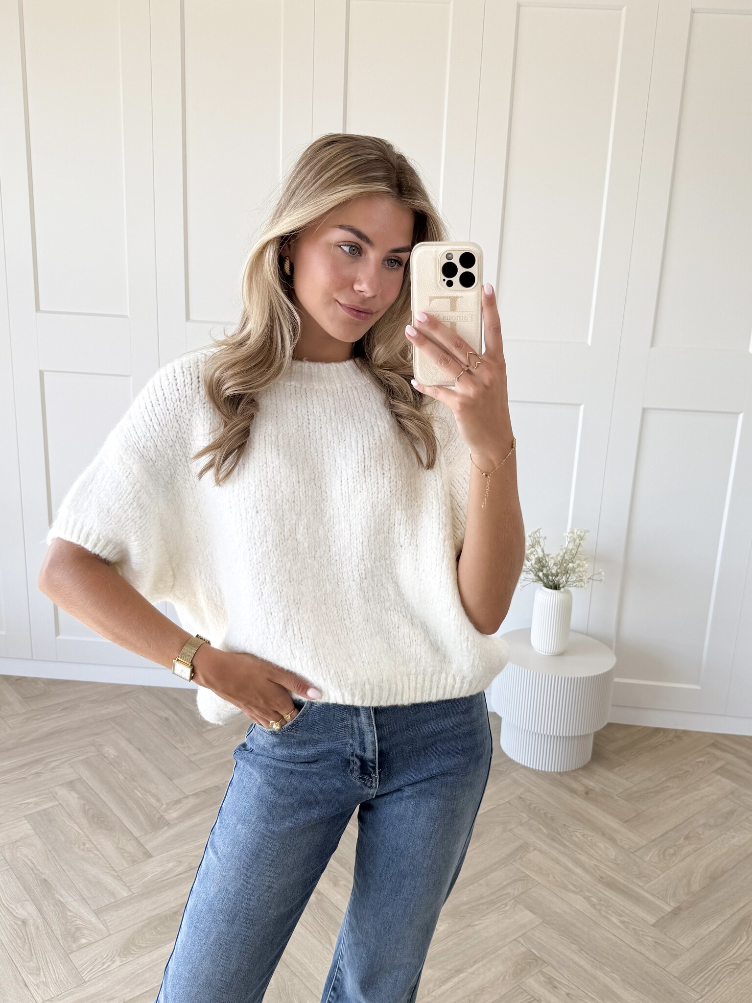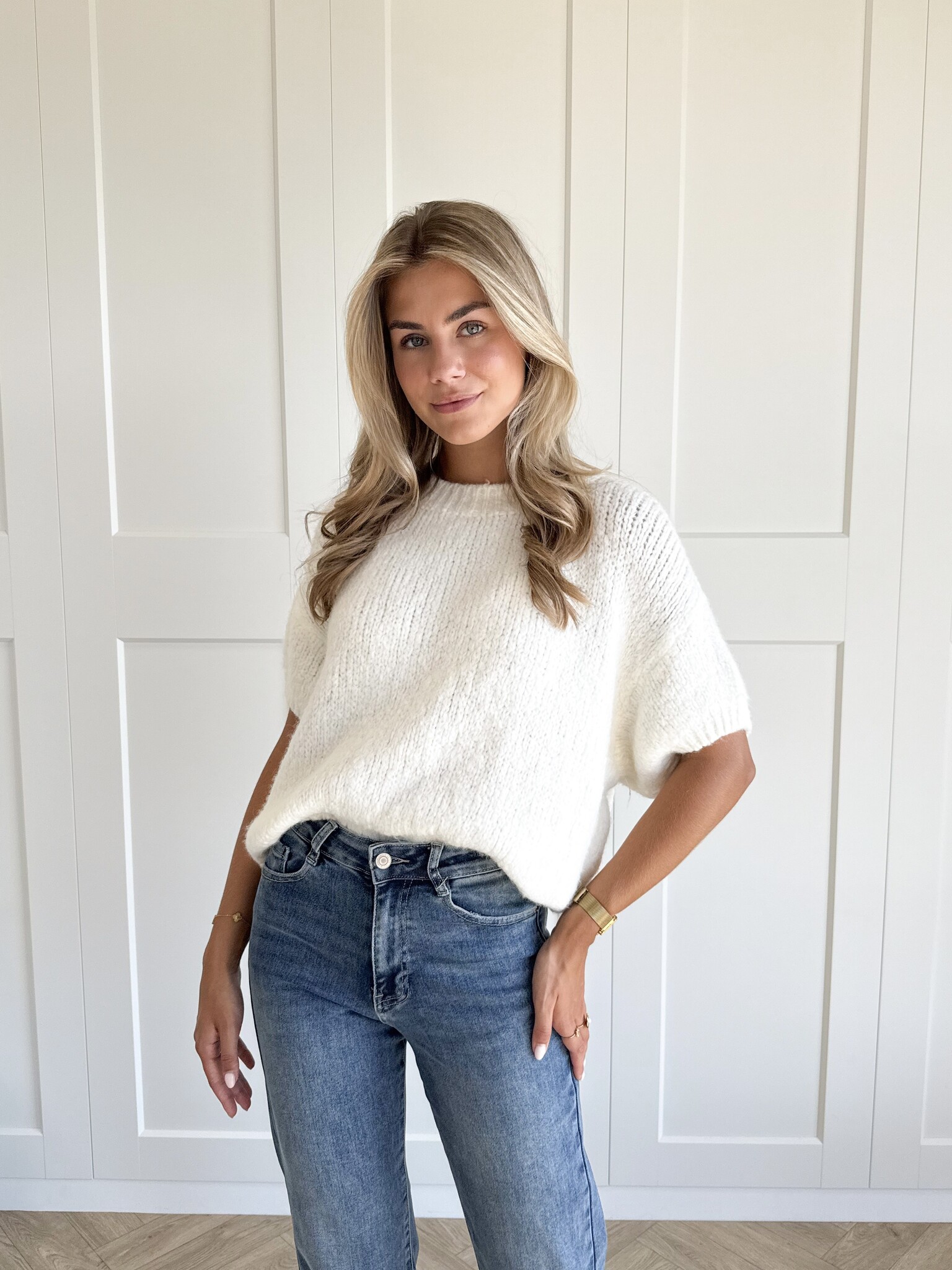 Meet Suus, jouw nieuwe favoriete knit! Deze ecru trui met korte mouwen is gemaakt van een zachte wolachtige stof die soepel valt en heerlijk aanvoelt. Dankzij de oversized fit heeft ze een nonchalante, comfy look die je moeiteloos combineert met jeans, rokjes of wide leg pants. Perfect voor laagjes of gewoon zo. Suus is cozy, chic en ready for anything.