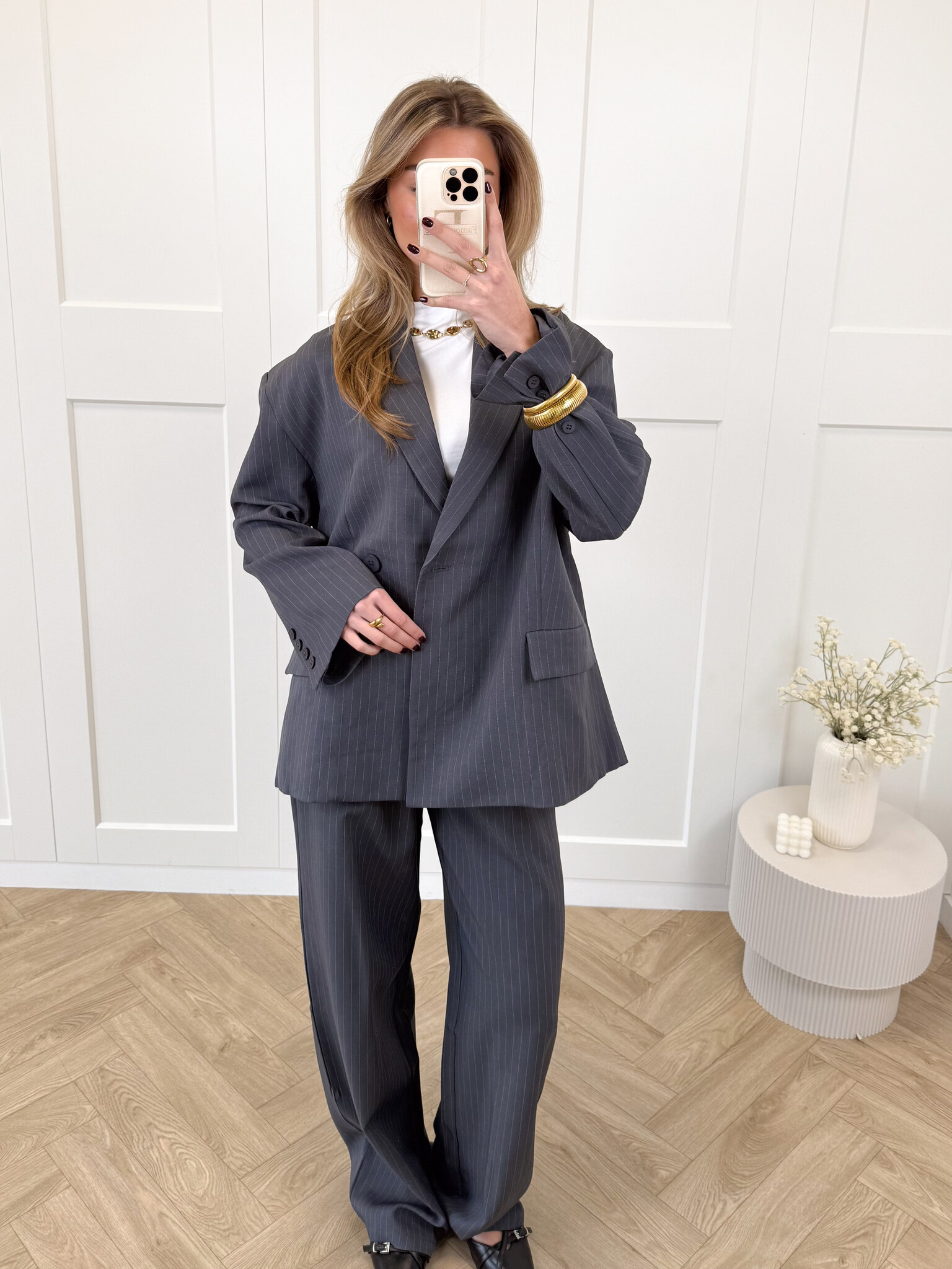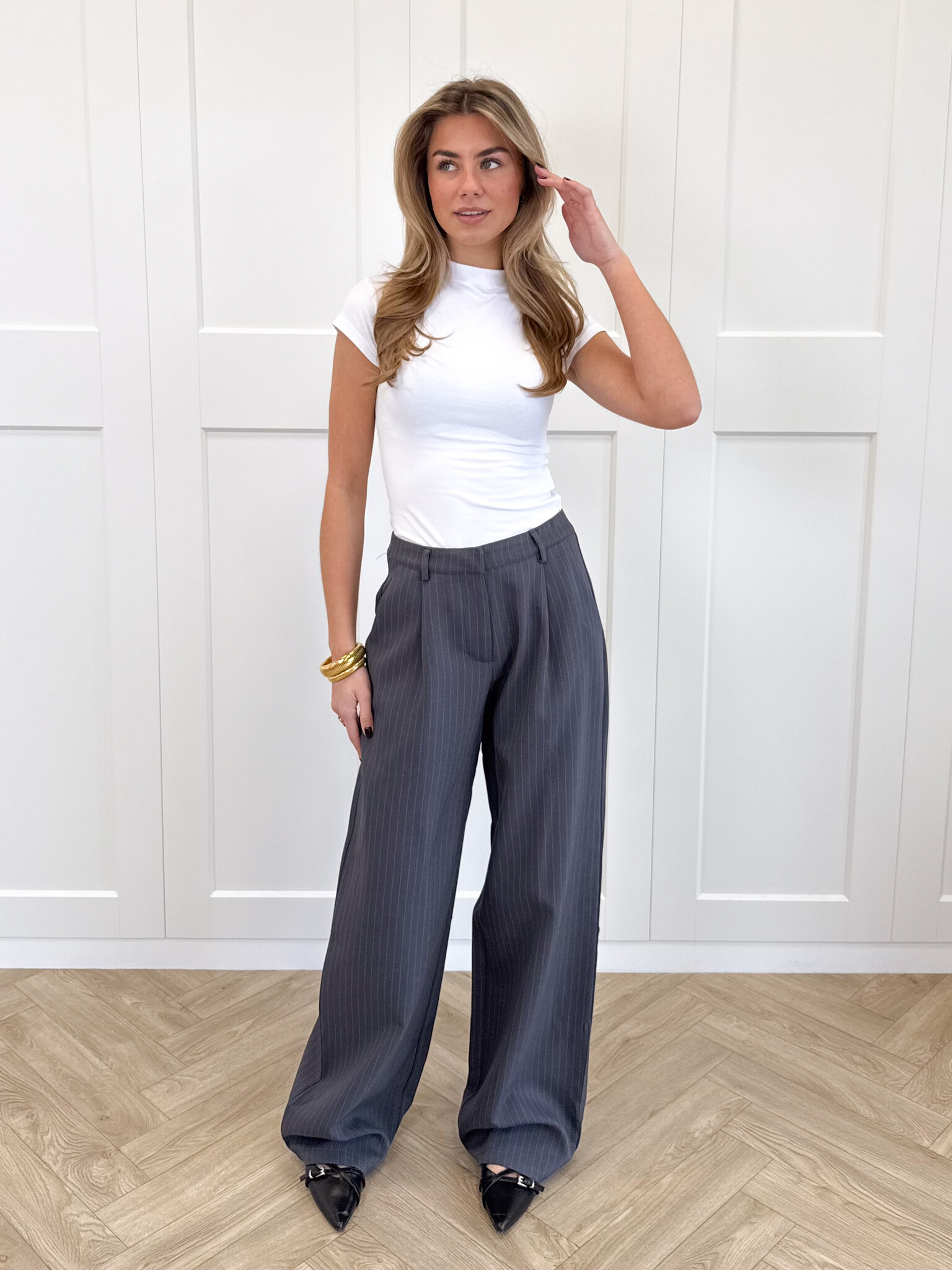 Deze wide leg pantalon met plooi en krijtstrepen is een echte must-have voor een girly en stijlvolle look. Het rechte, wijd uitlopende model geeft een elegante en moderne uitstraling, terwijl de subtiele plooi en krijtstrepen de broek klassiek en chique maken. De lusjes maken het makkelijk om een riem toe te voegen, en de praktische zakken geven een casual touch zonder aan stijl in te boeten. De verborgen knoop zorgt voor een strakke en nette afwerking. Perfect te combineren met een blouse, top of blazer voor een girly werkdag, een lunchdate of een casual chic dagje uit. Isalina zorgt ervoor dat je look direct elegant, fashionable en girly oogt, zonder dat je inlevert op comfort.