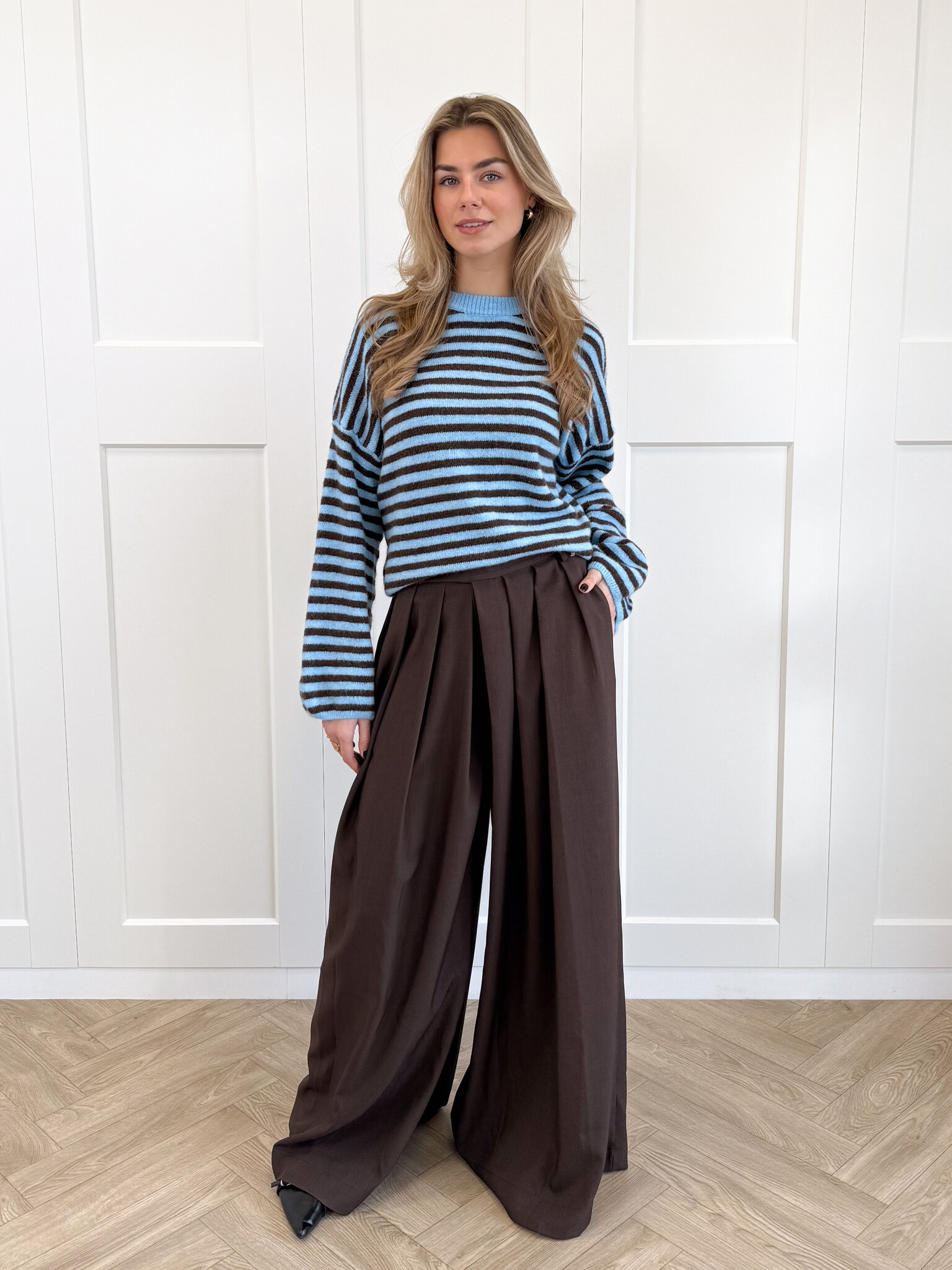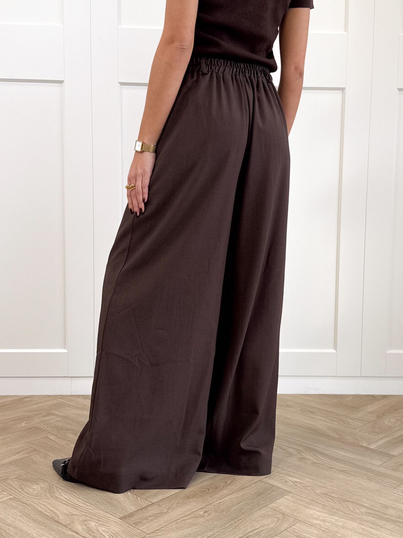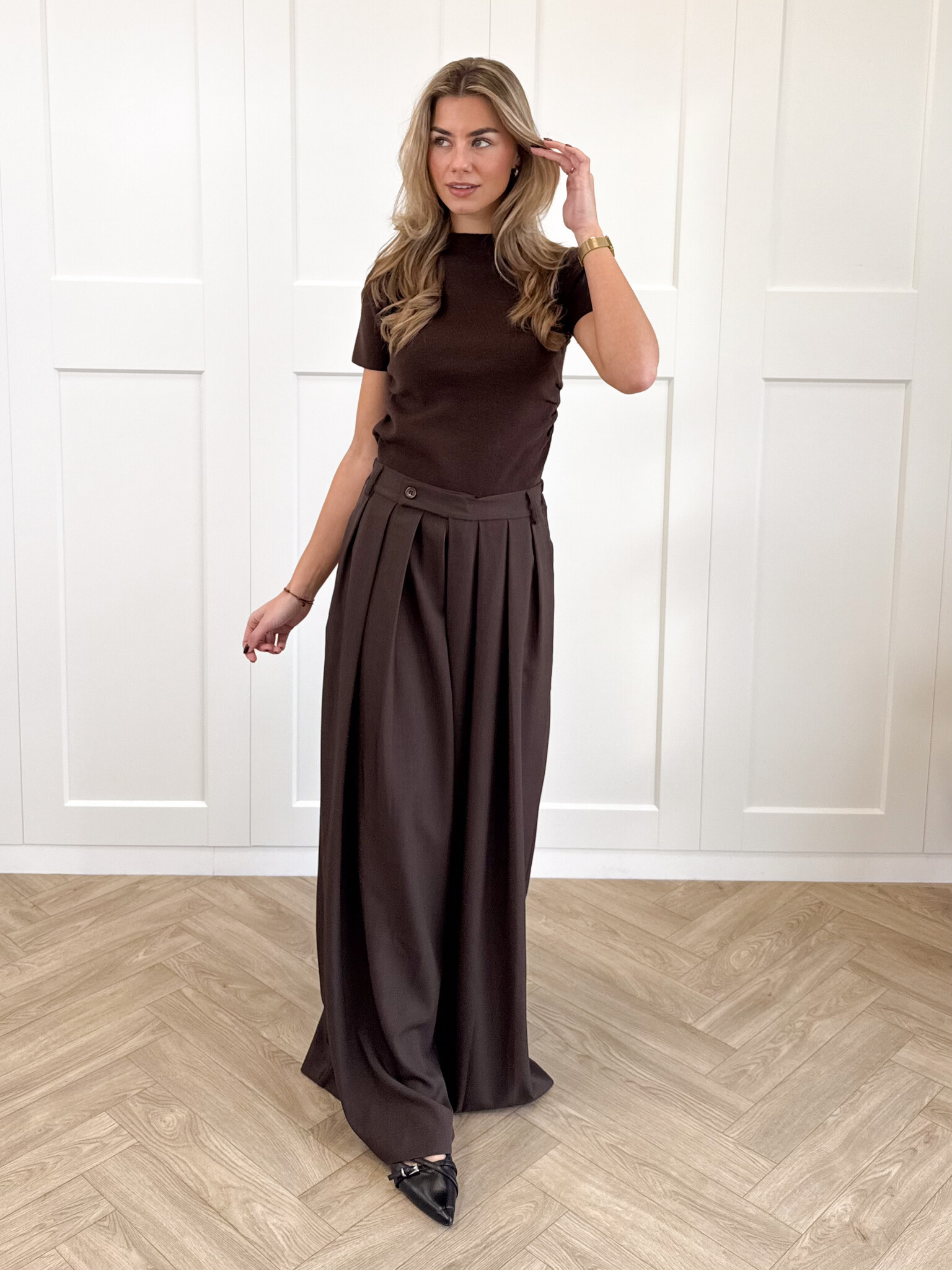 Deze pantalon is een echte essential voor iedereen die houdt van stijl en comfort in één. De wide leg fit geeft een elegante, moderne uitstraling en zorgt ervoor dat de broek soepel en luxe valt. Door de nette plooi aan de voorkant krijgt de pantalon een chique look die zowel geschikt is voor werk, etentjes als casual chic dagen. De rits- en knoopsluiting zijn onzichtbaar weggewerkt voor een clean, minimalistisch effect. De taille heeft extra stretch, waardoor de broek perfect meebeweegt en de hele dag comfortabel blijft zitten. De zakken zijn subtiel verwerkt, zodat de pantalon praktisch blijft zonder in te leveren op stijl. Combineer met een blouse voor workwear, een body voor een avondje uit of een trui voor een effortless classy vibe.Deze pantalon is de ultieme mix van comfort, vrouwelijkheid en moderne elegantie.