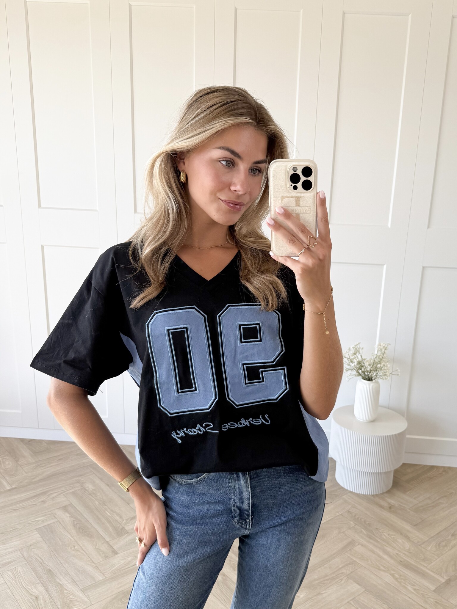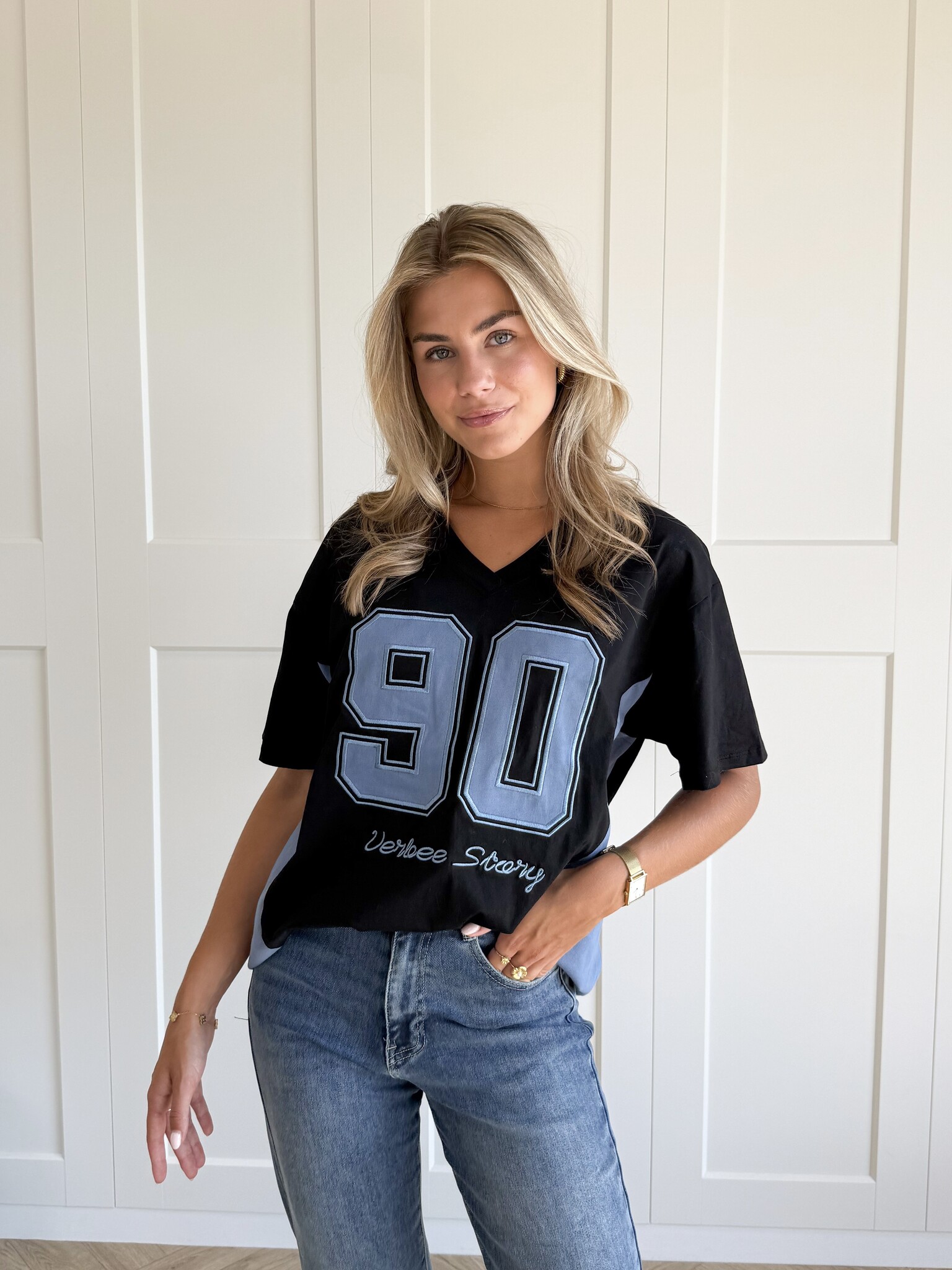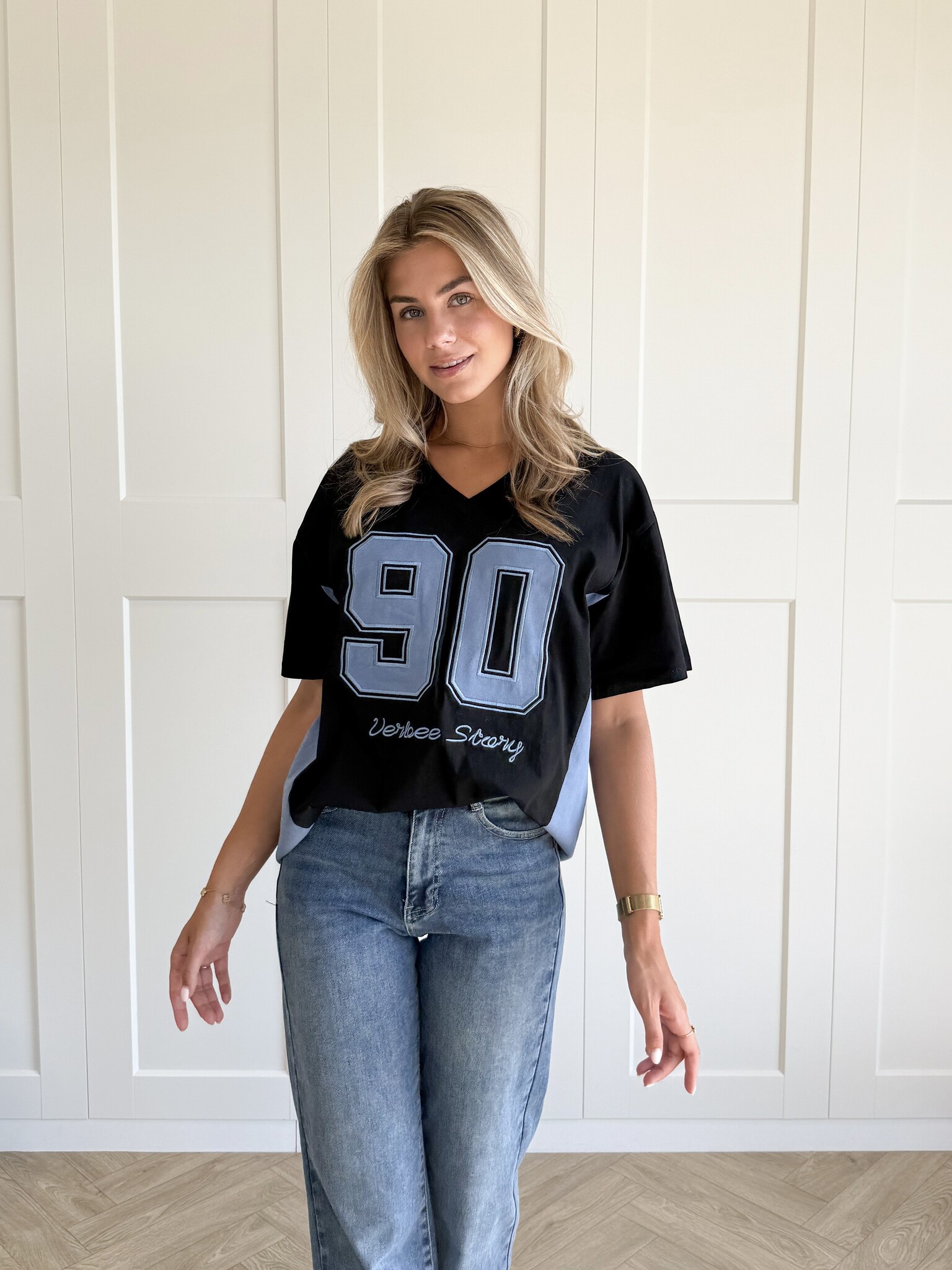 Een oversized jersey T-shirt in zwart en blauw met die typische Amerikaanse vibes. Gemaakt van zacht katoen voor ultiem draagcomfort en een relaxed fit die perfect is voor casual streetstyle, weekends of layering onder een blazer of vest. Stoer en comfy, perfect voor een festival!