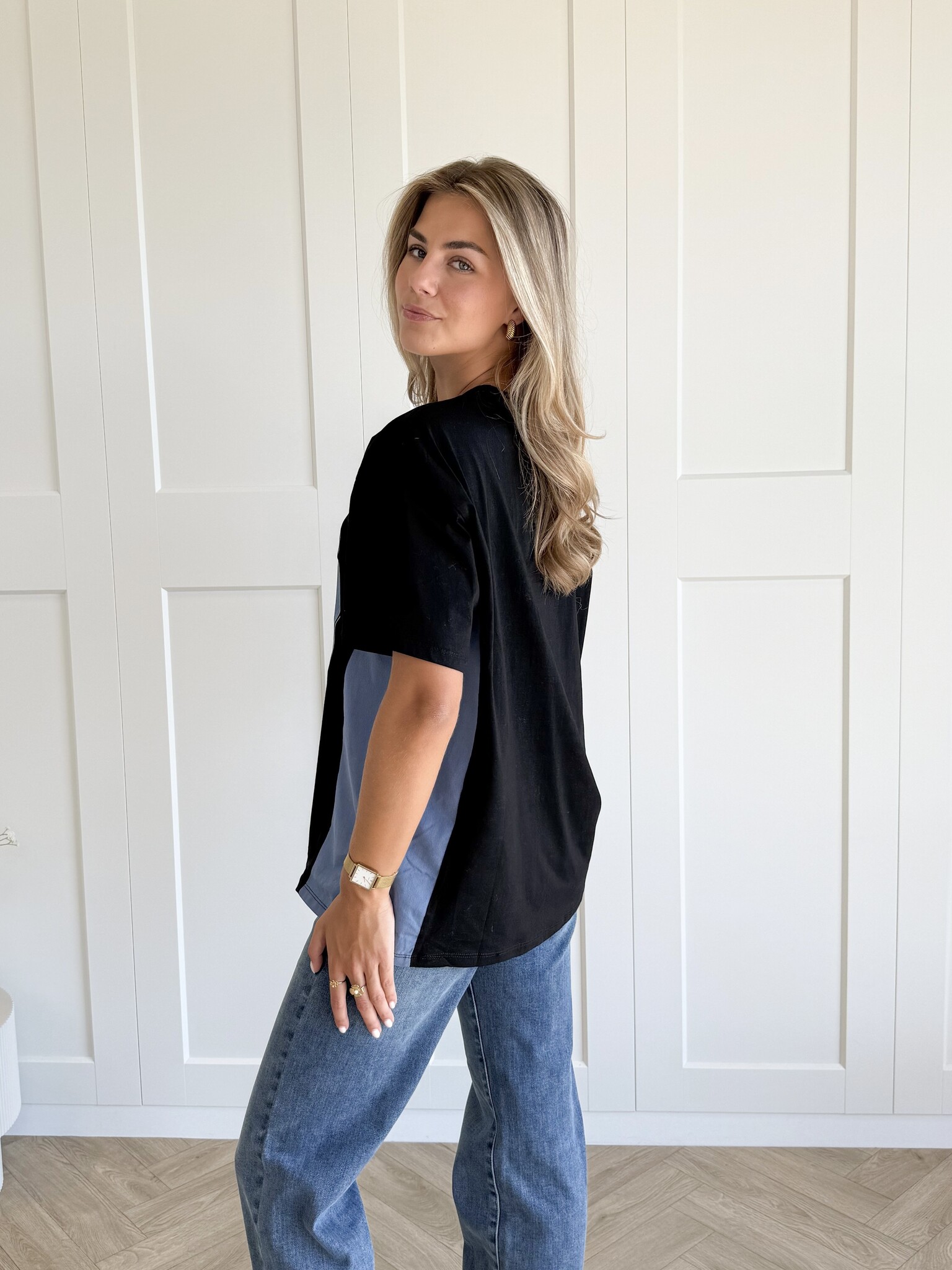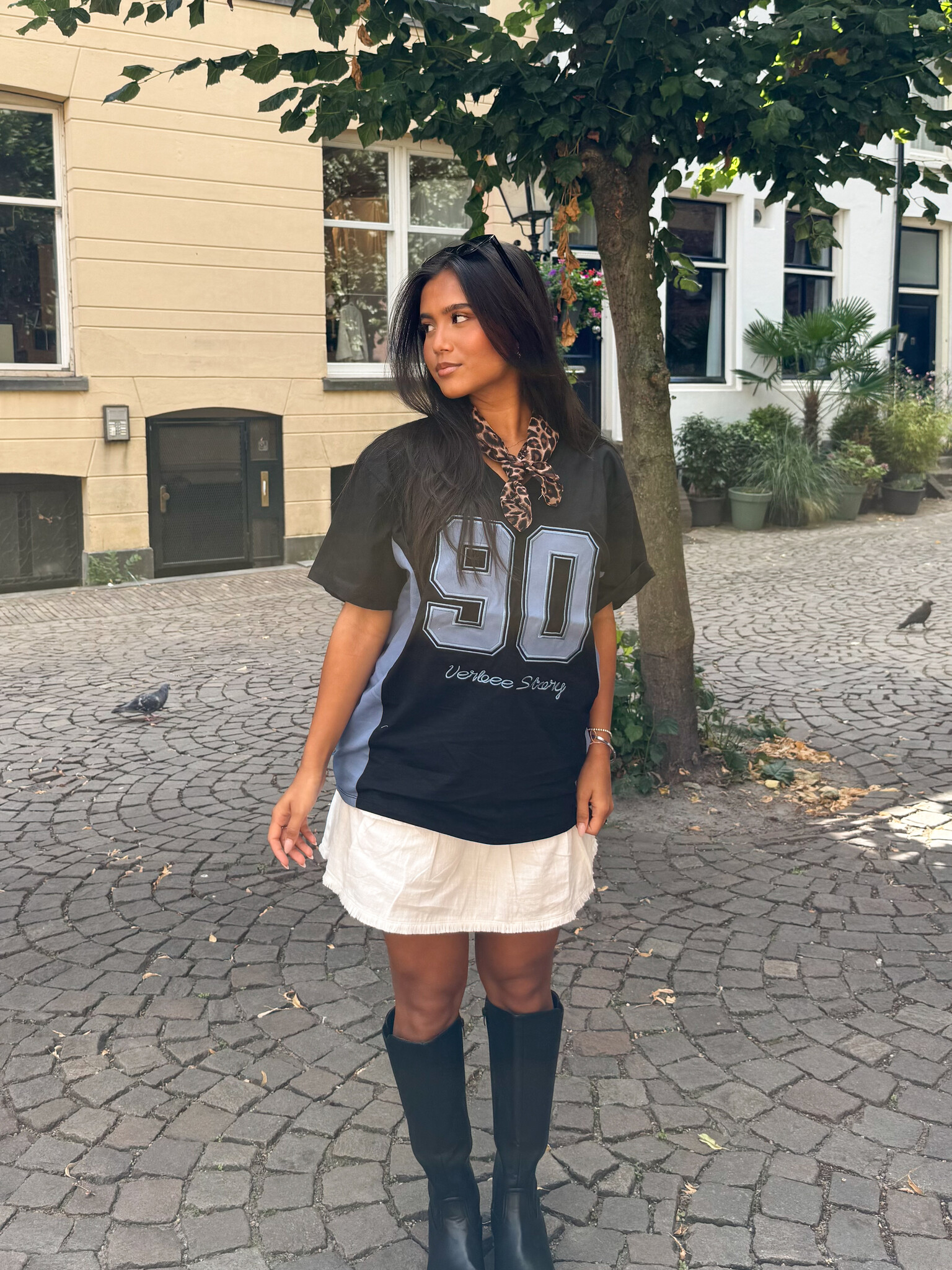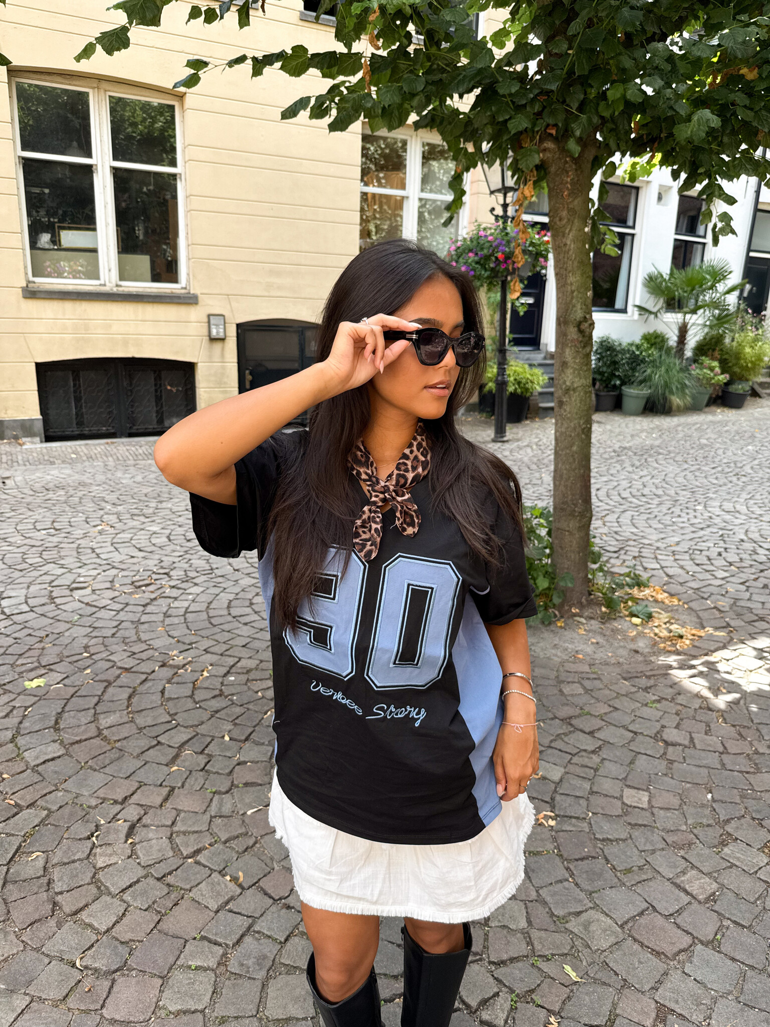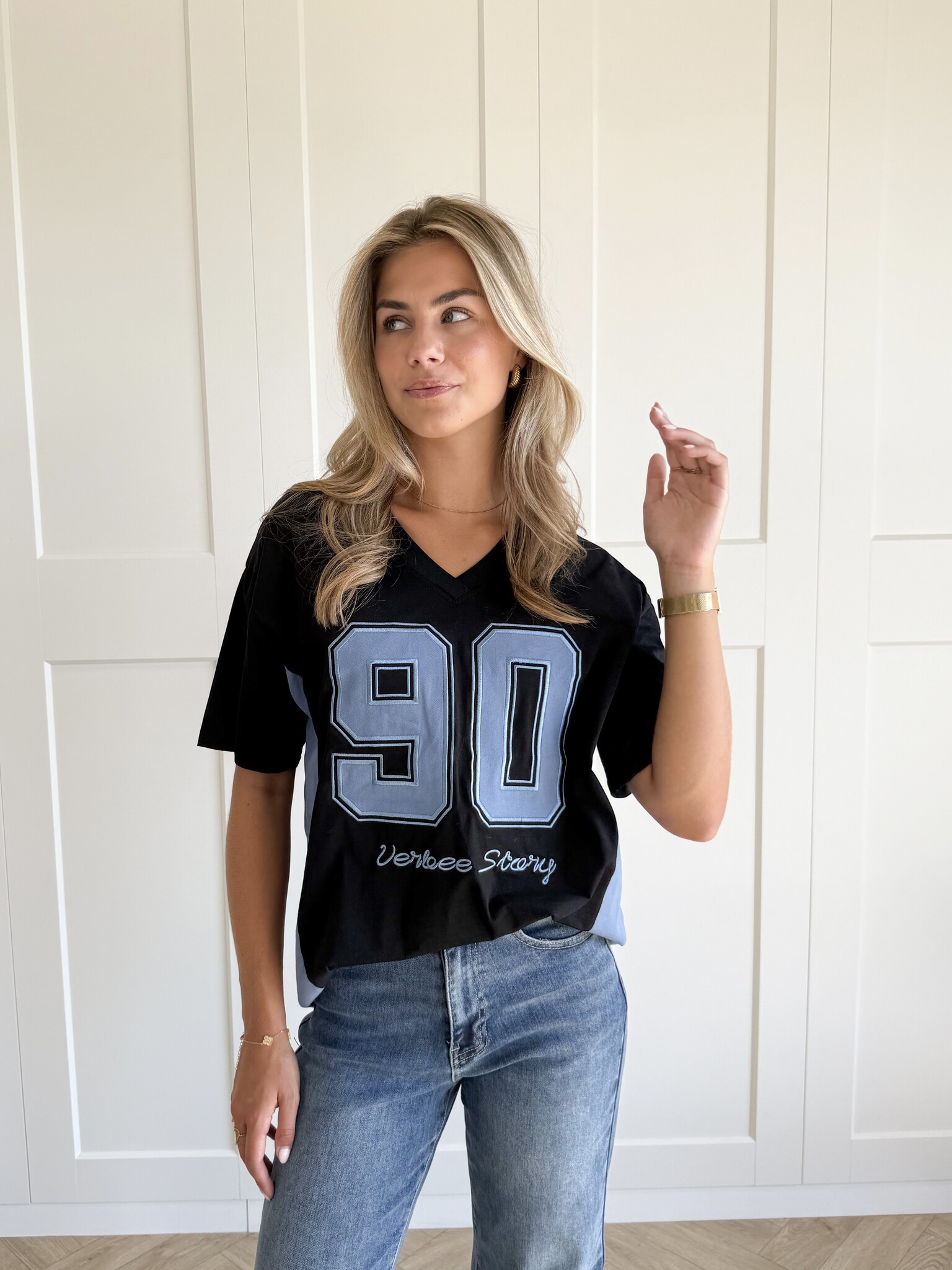 Een oversized jersey T-shirt in zwart en blauw met die typische Amerikaanse vibes. Gemaakt van zacht katoen voor ultiem draagcomfort en een relaxed fit die perfect is voor casual streetstyle, weekends of layering onder een blazer of vest. Stoer en comfy, perfect voor een festival!