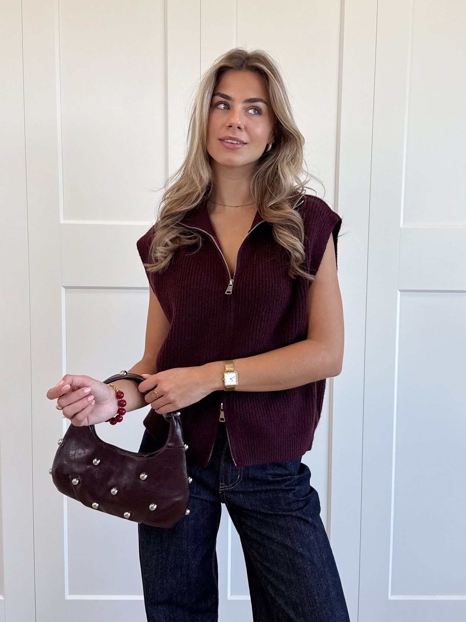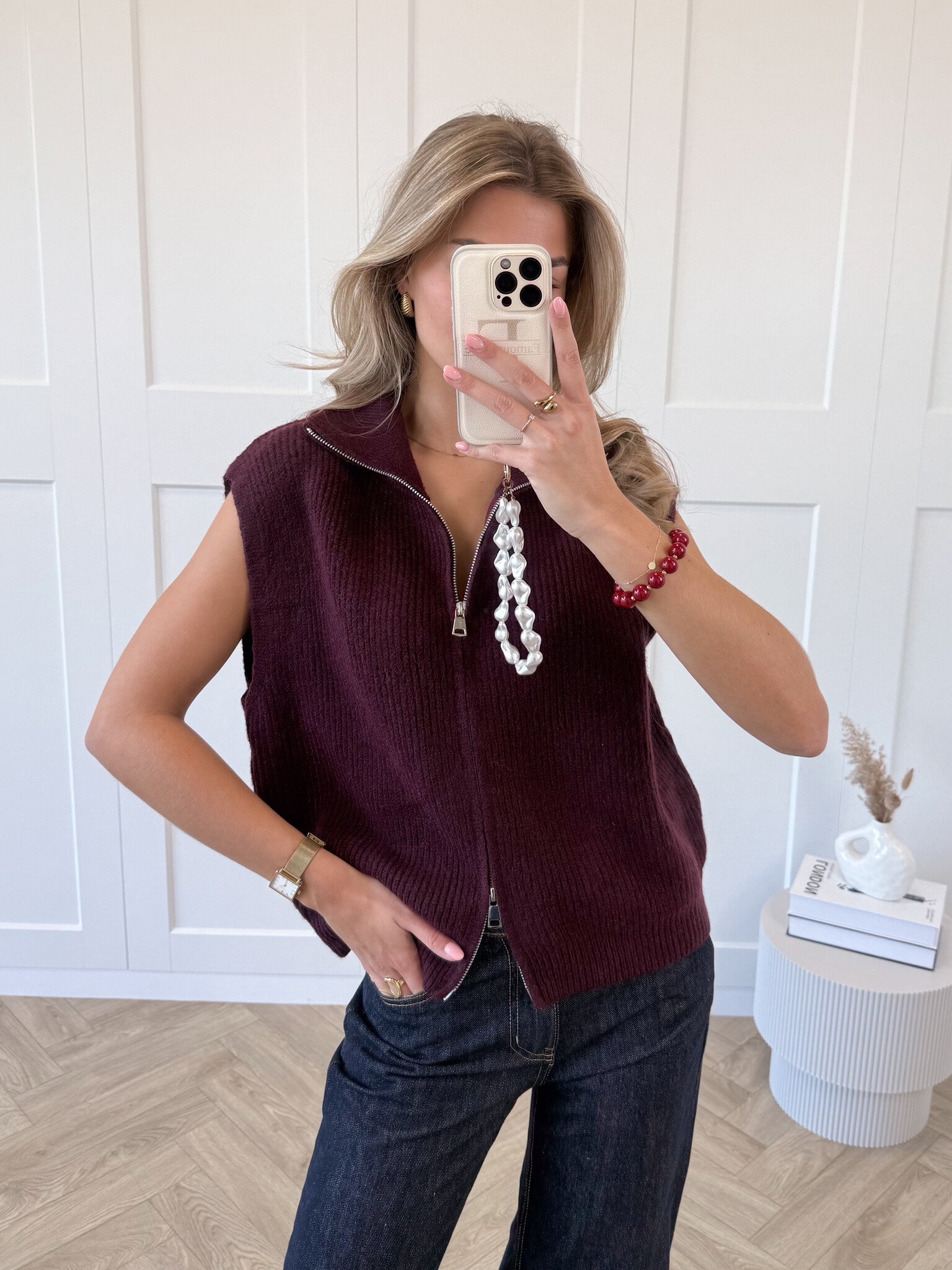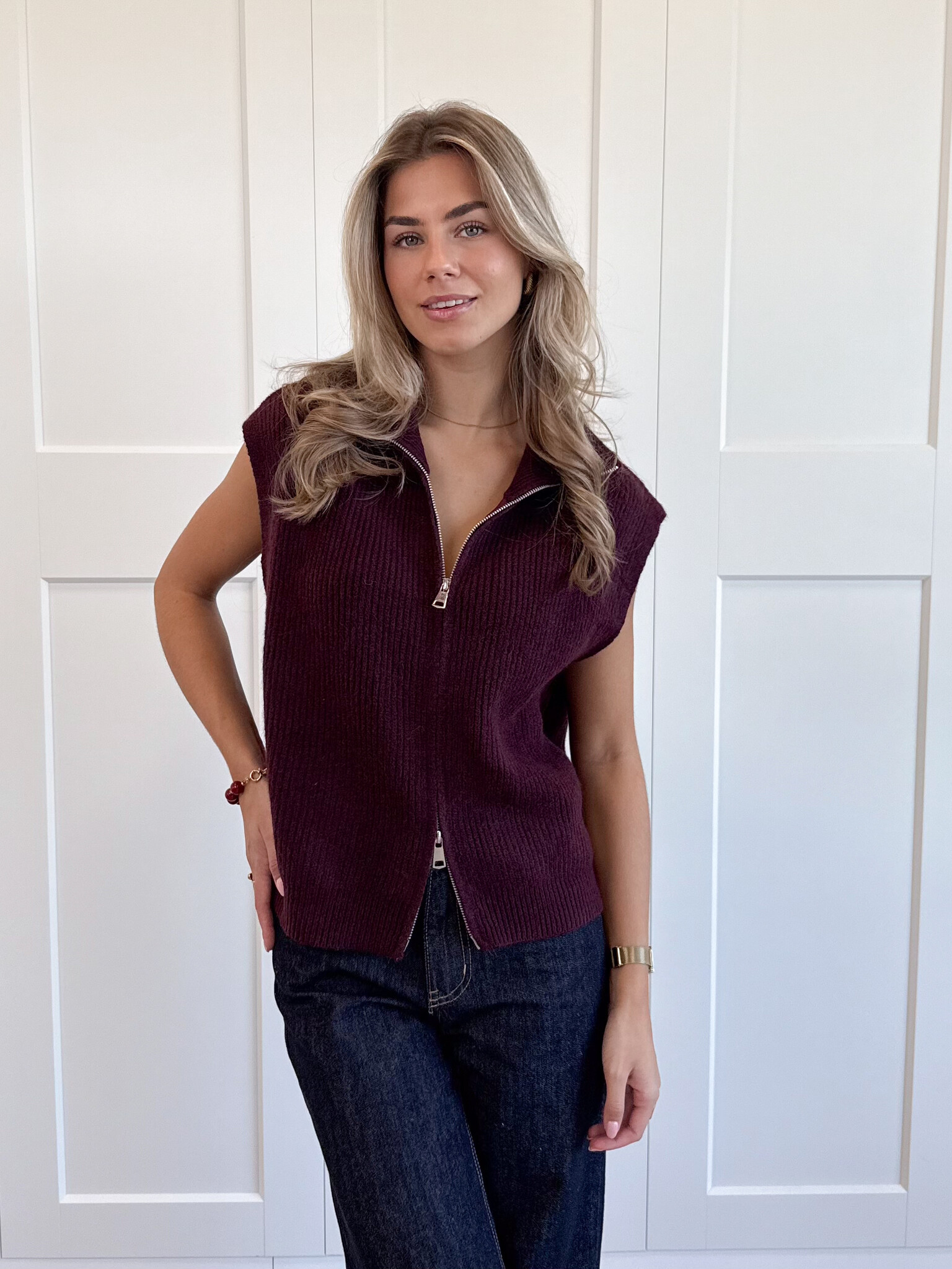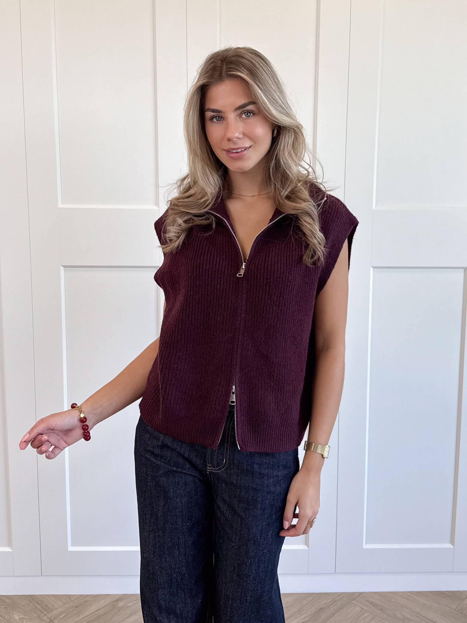 Maak kennis met dit bordeaux knit gilet. Een echte musthave voor jouw herfst- en wintergarderobe. Gemaakt van een zachte ribstof die heerlijk draagt, en afgewerkt met een kraag voor een stoere touch. De oversized fit geeft een relaxte uitstraling, terwijl de rits zowel van boven als onder open te maken is, zodat je haar op verschillende manieren kunt stylen. Draag het gilet over een longsleeve of blouse voor een gelaagde, cozy look.